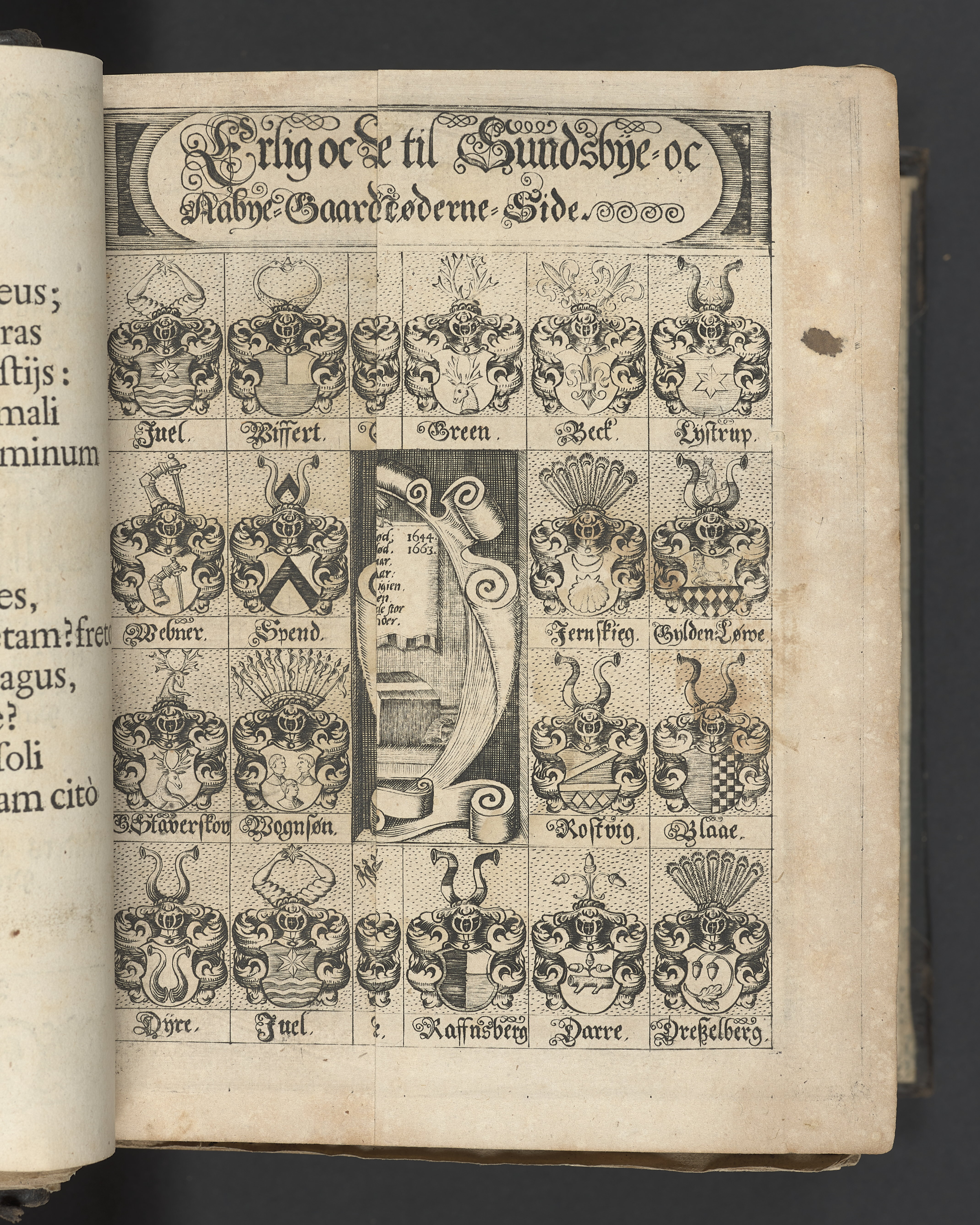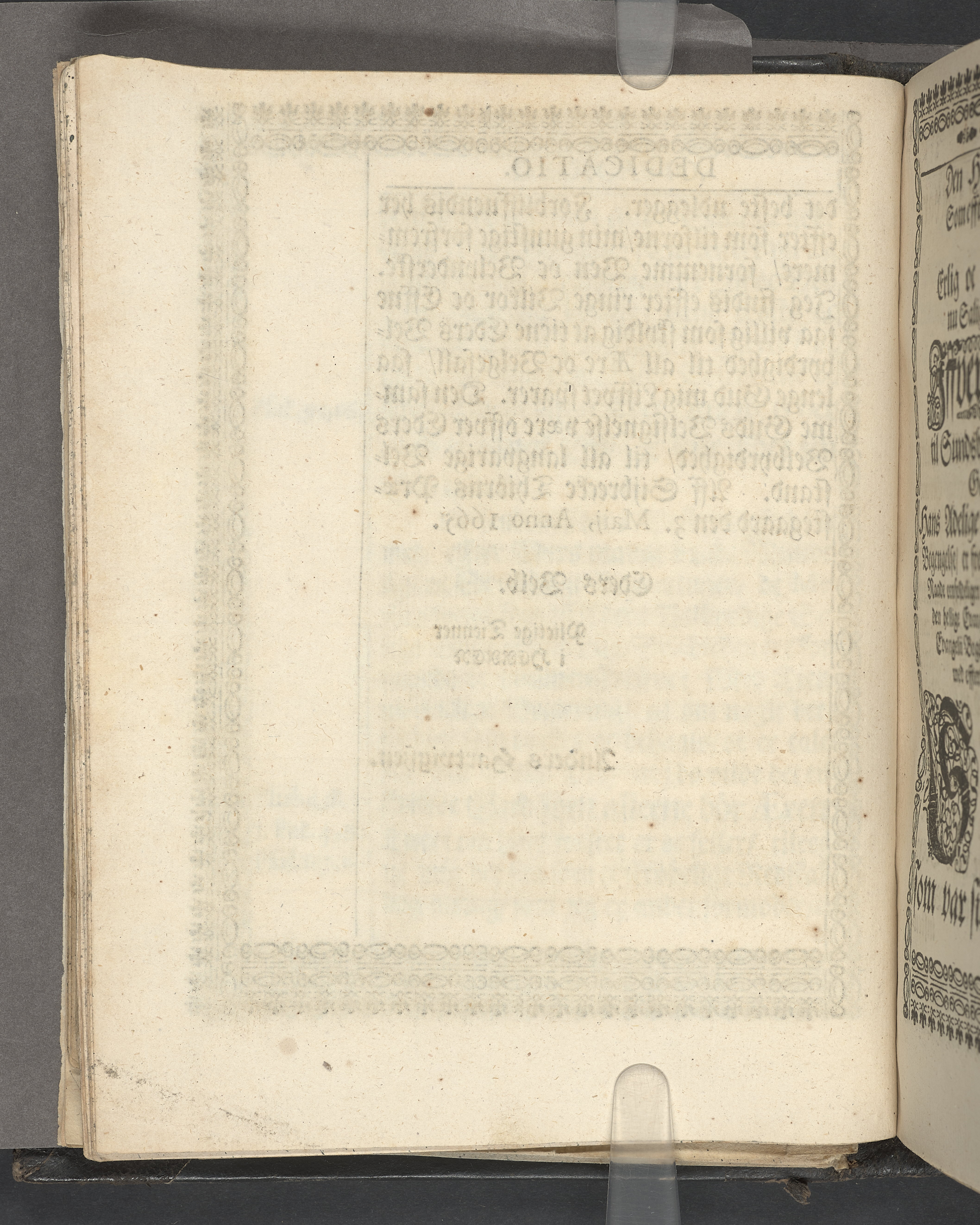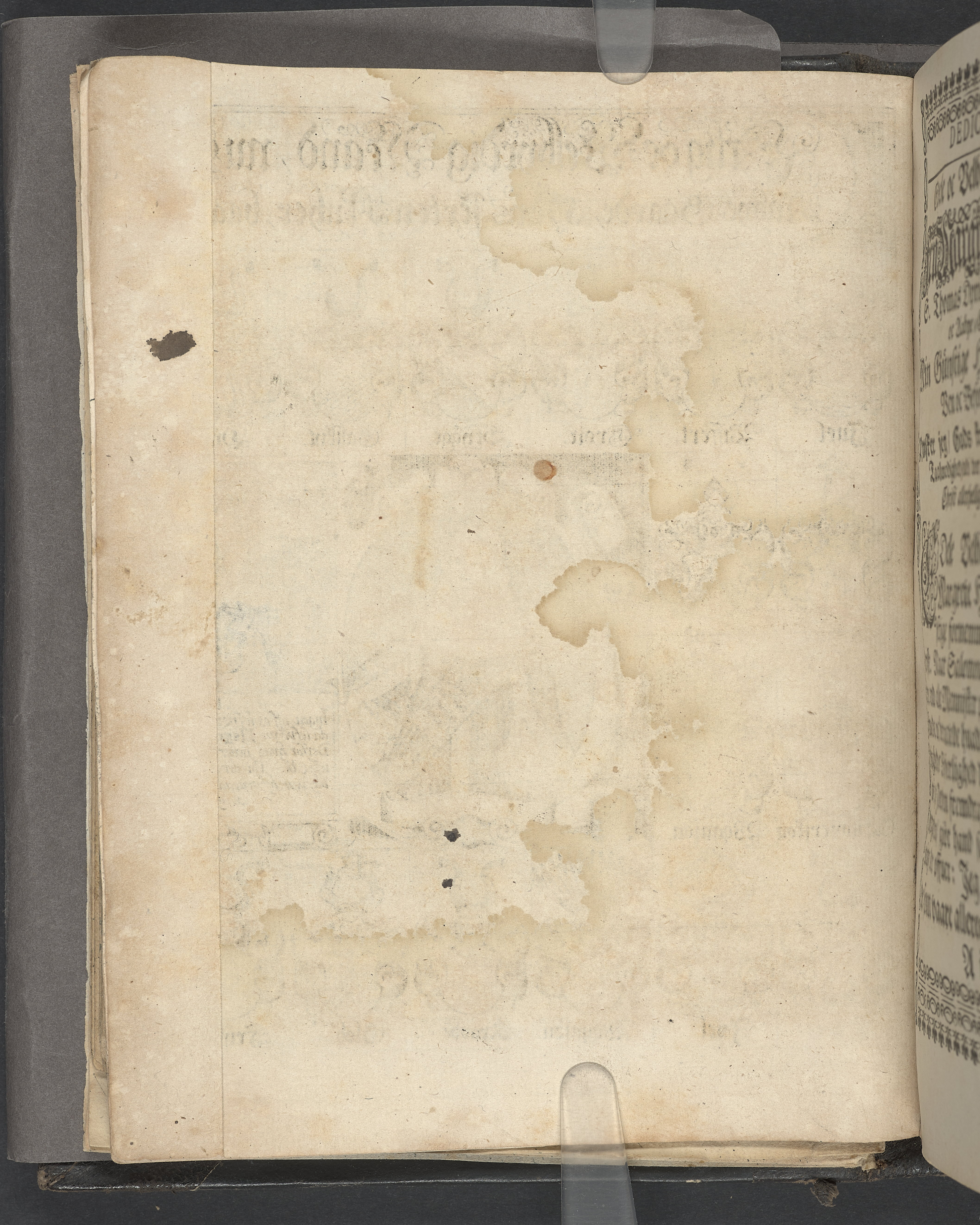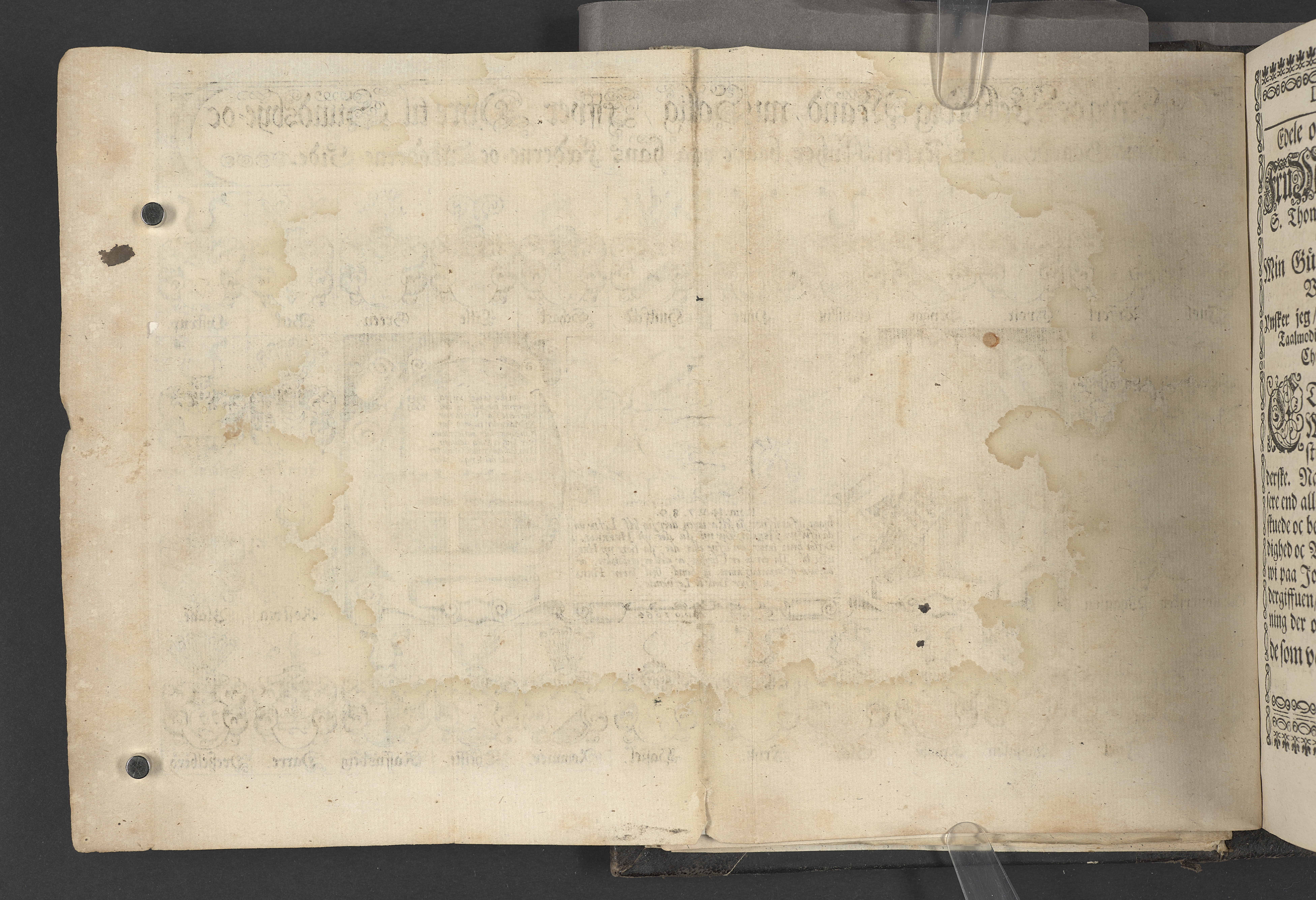 Utvikbar plansch med antavla infogad efter titelbladet. I övre högra hörnet på titelsidan med bläck "4" skrivet över "5". Snitt stänkta i rött och blått.