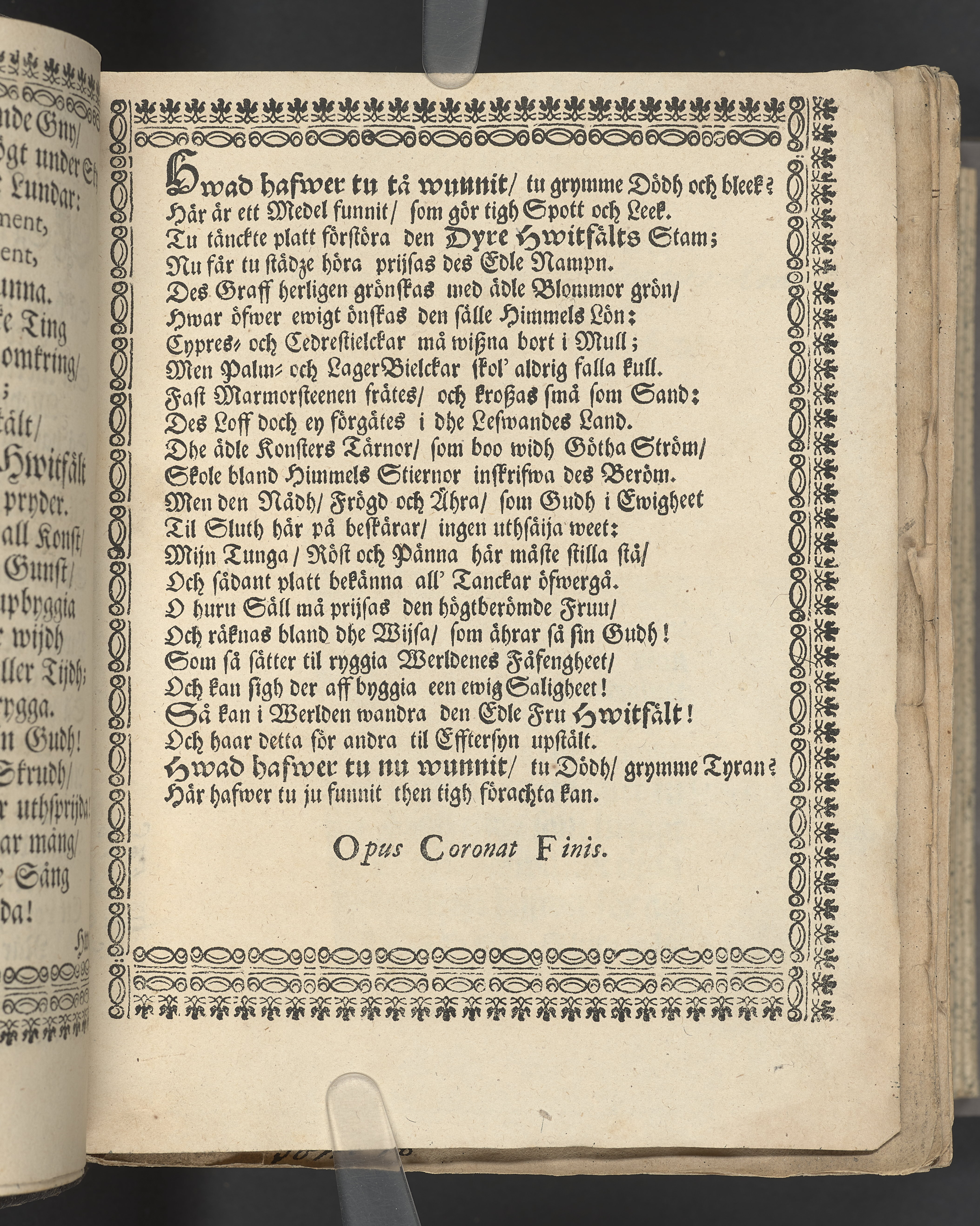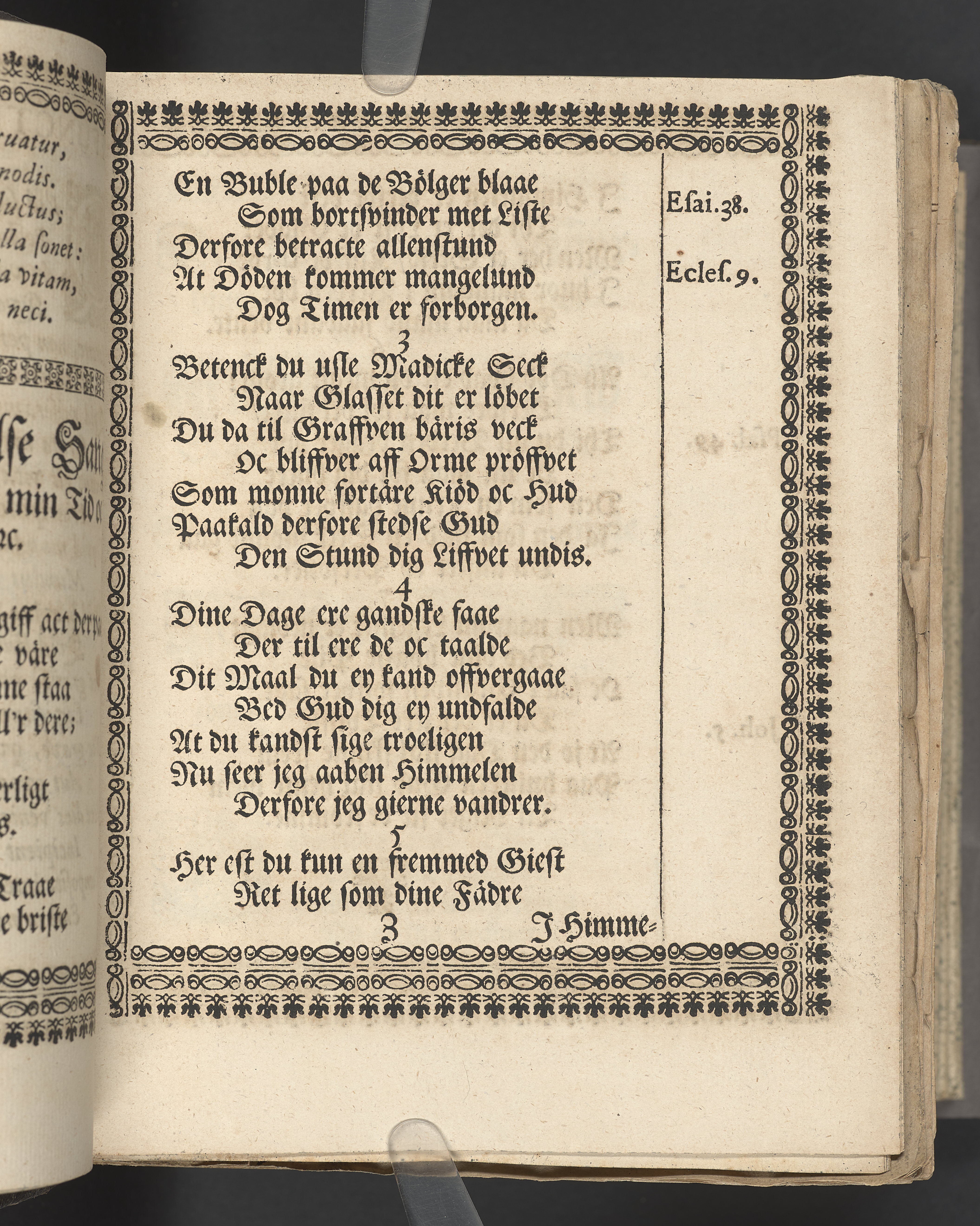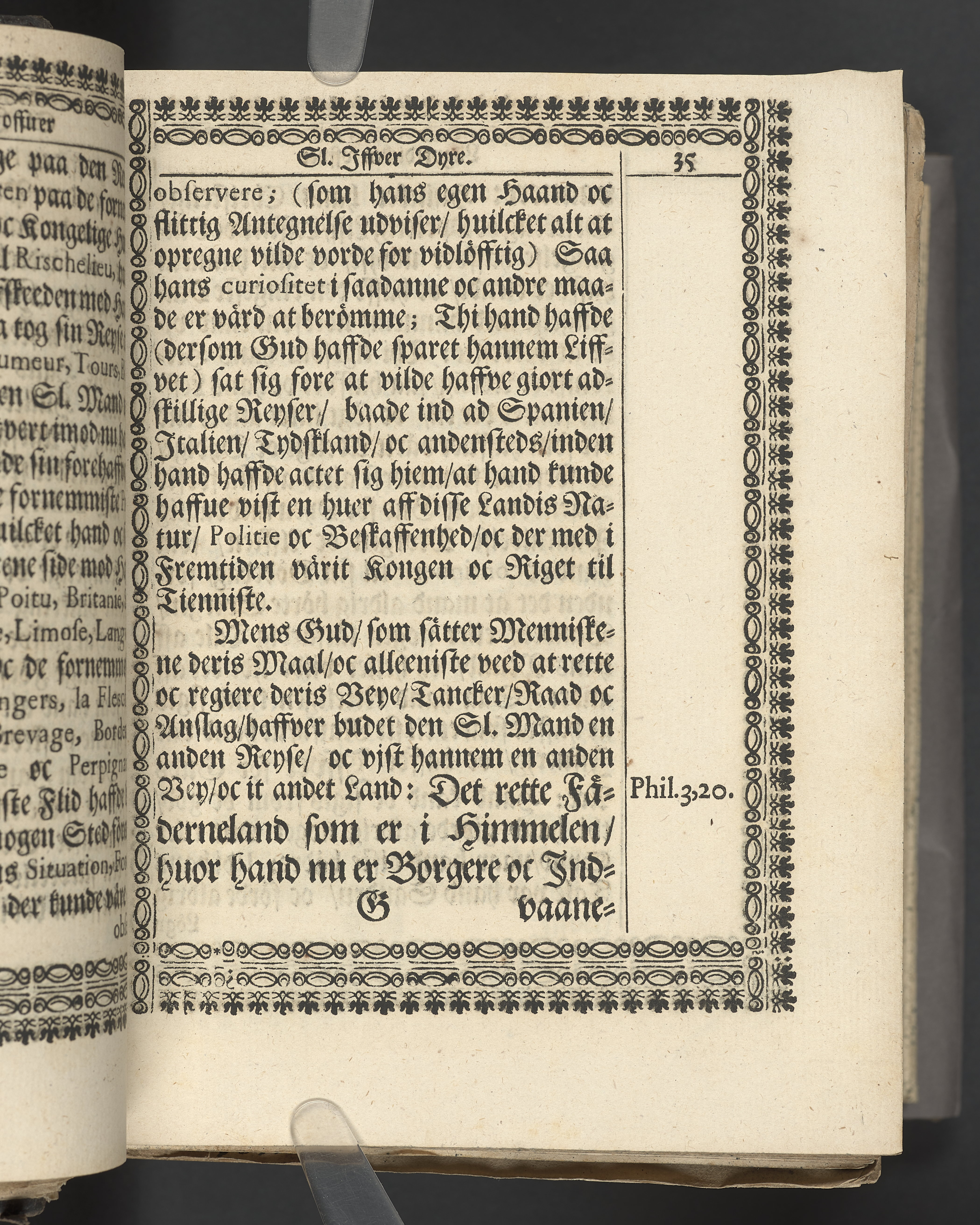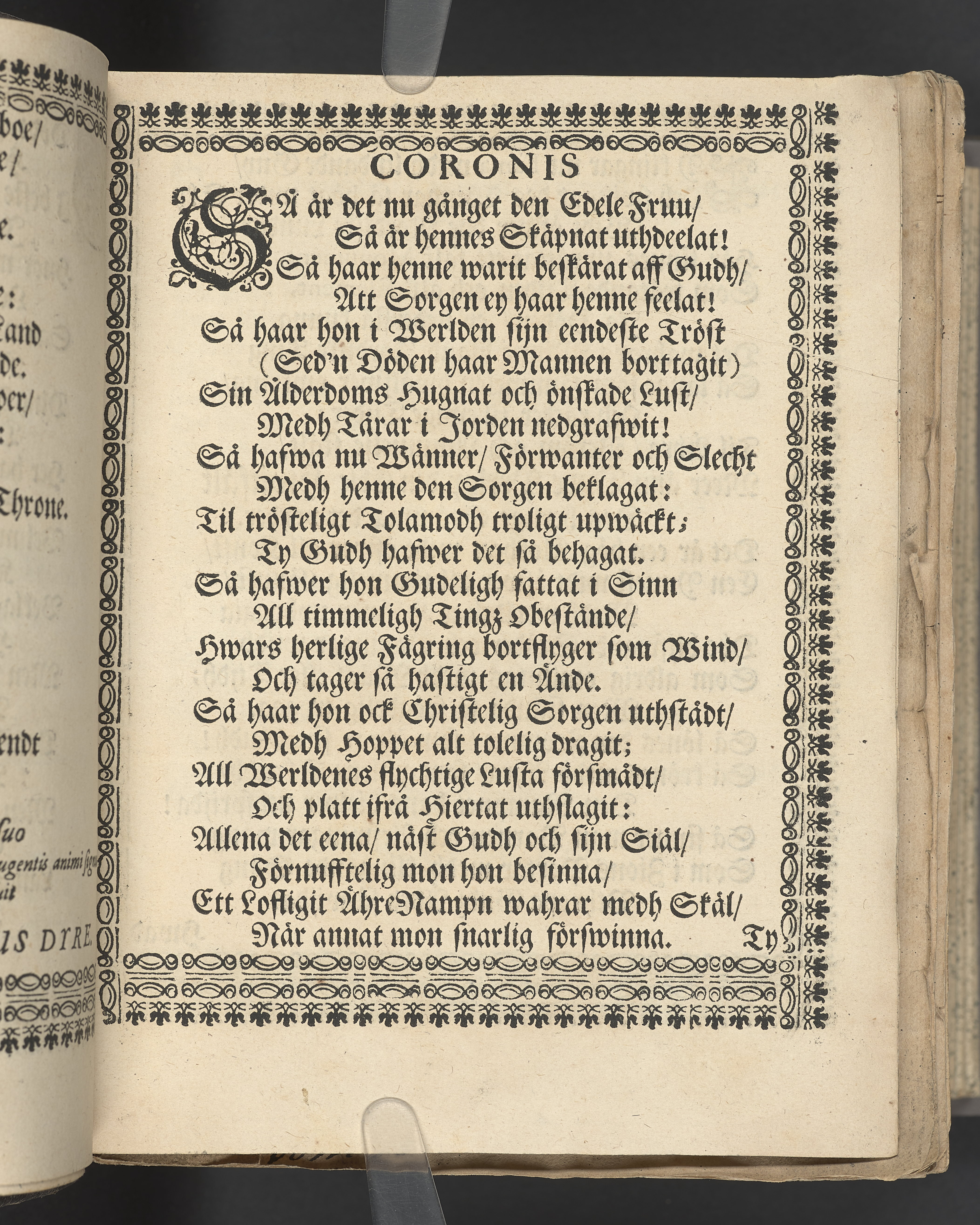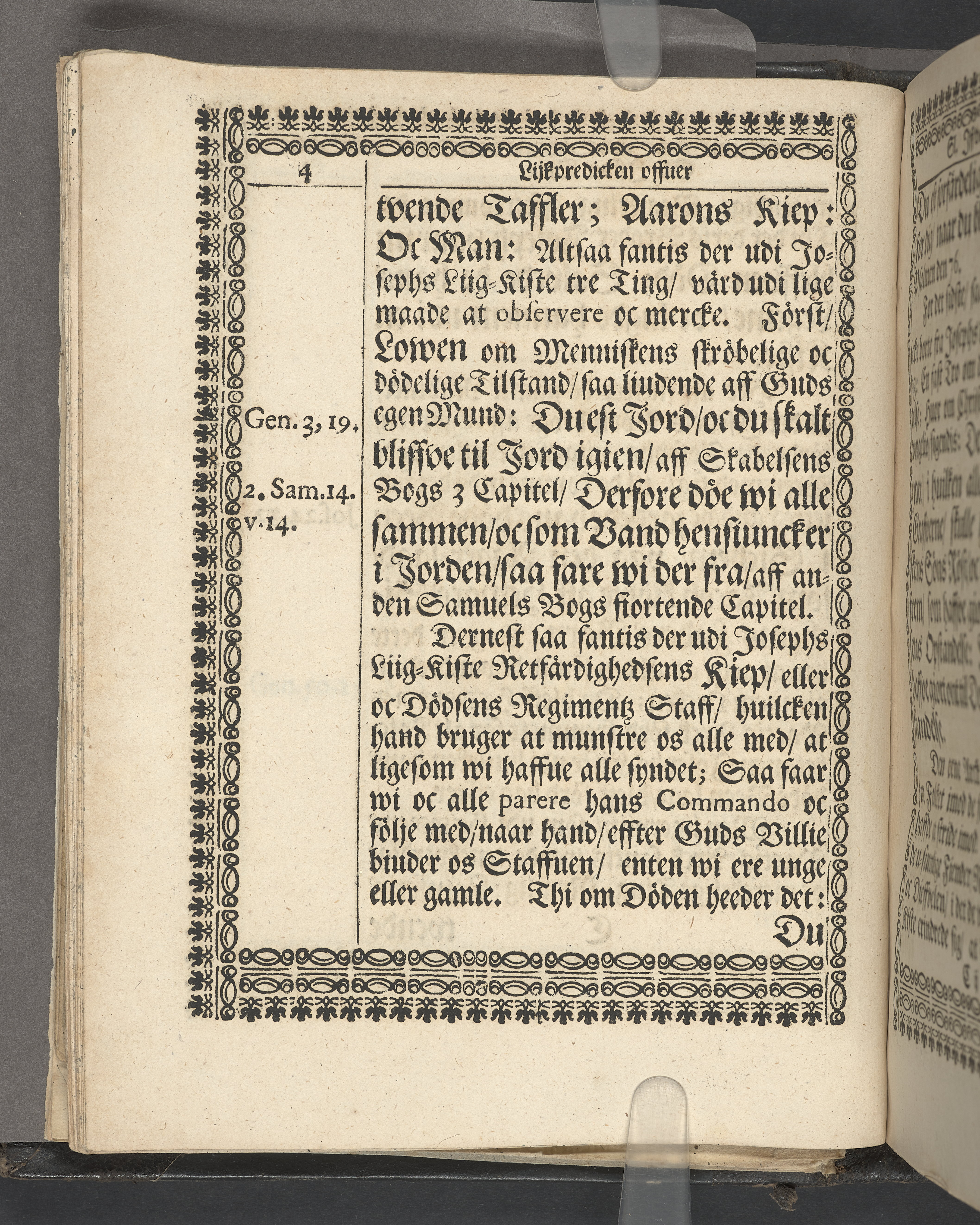 Utvikbar plansch med antavla infogad efter titelbladet. I övre högra hörnet på titelsidan med bläck "4" skrivet över "5". Snitt stänkta i rött och blått.