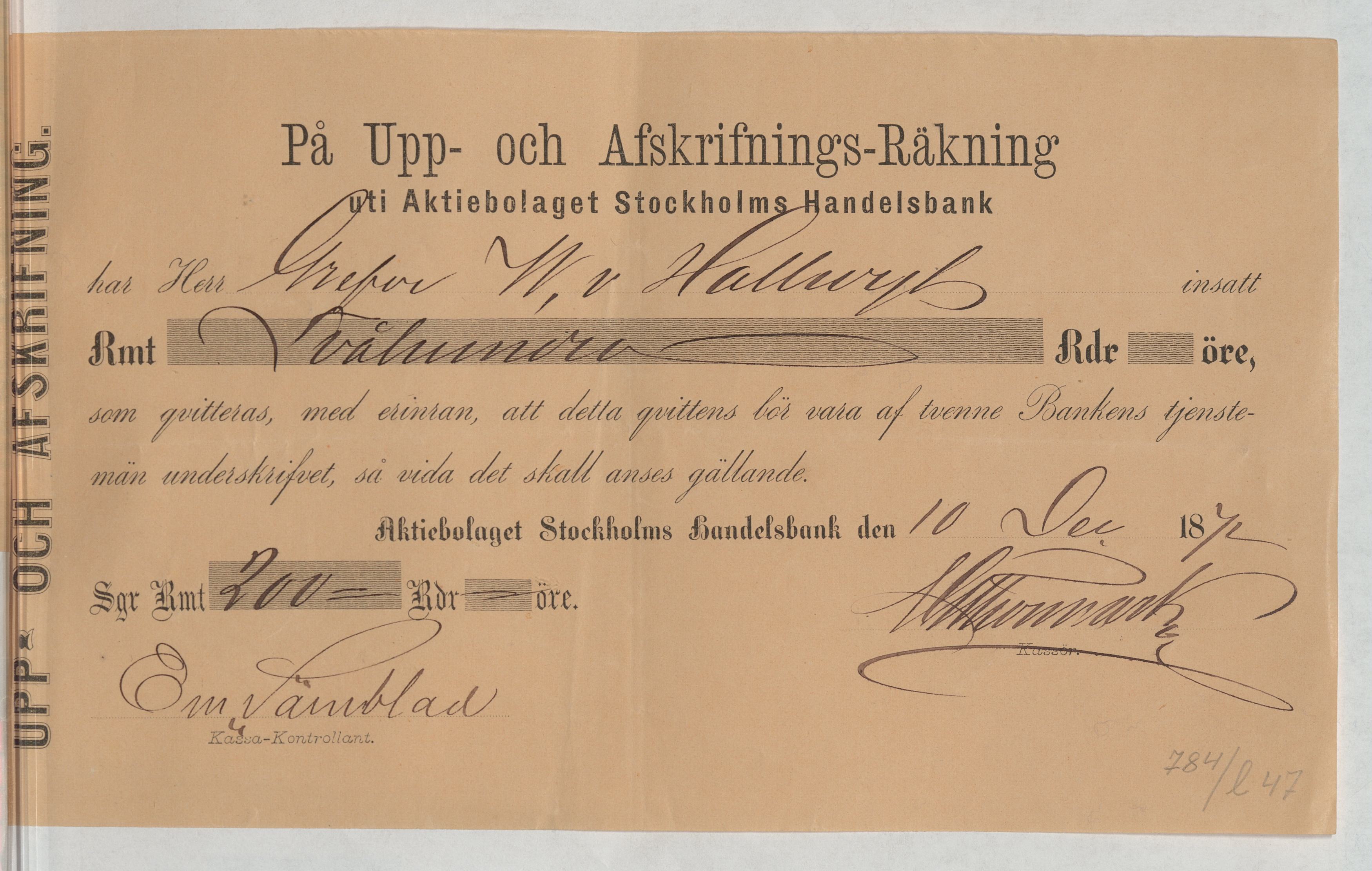 Kvitto från Aktiebolaget Stockholms Handelsbank rörande Upp- och Afskrifnings-Räkning