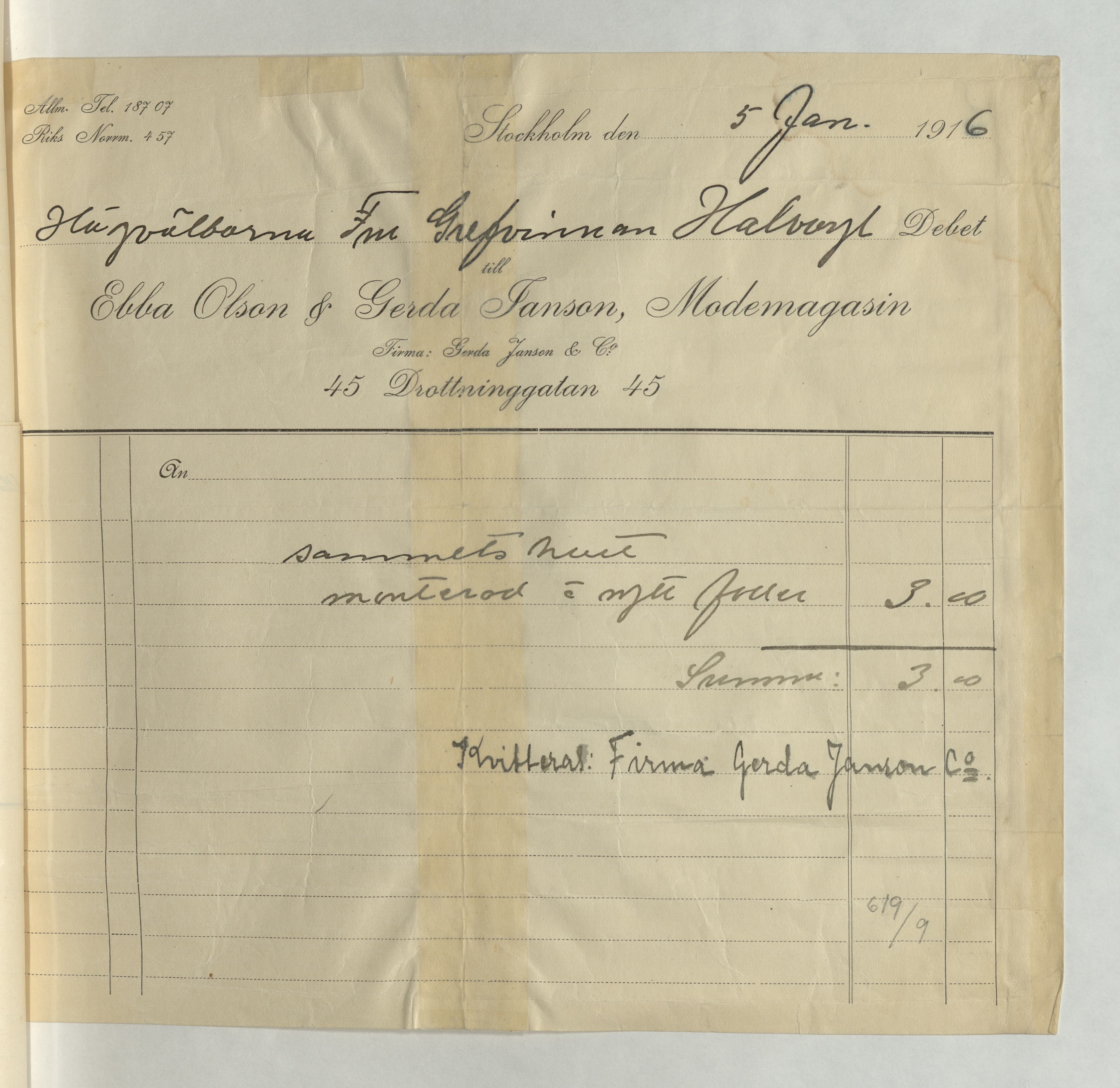 Kvitto från Ebba Olson & Gerda Janson, Modemagasin. Inköpt sammetshatt, samt montering, för en totalsumma av 3Kr. Betalt Stockholm 5 januari 1916.