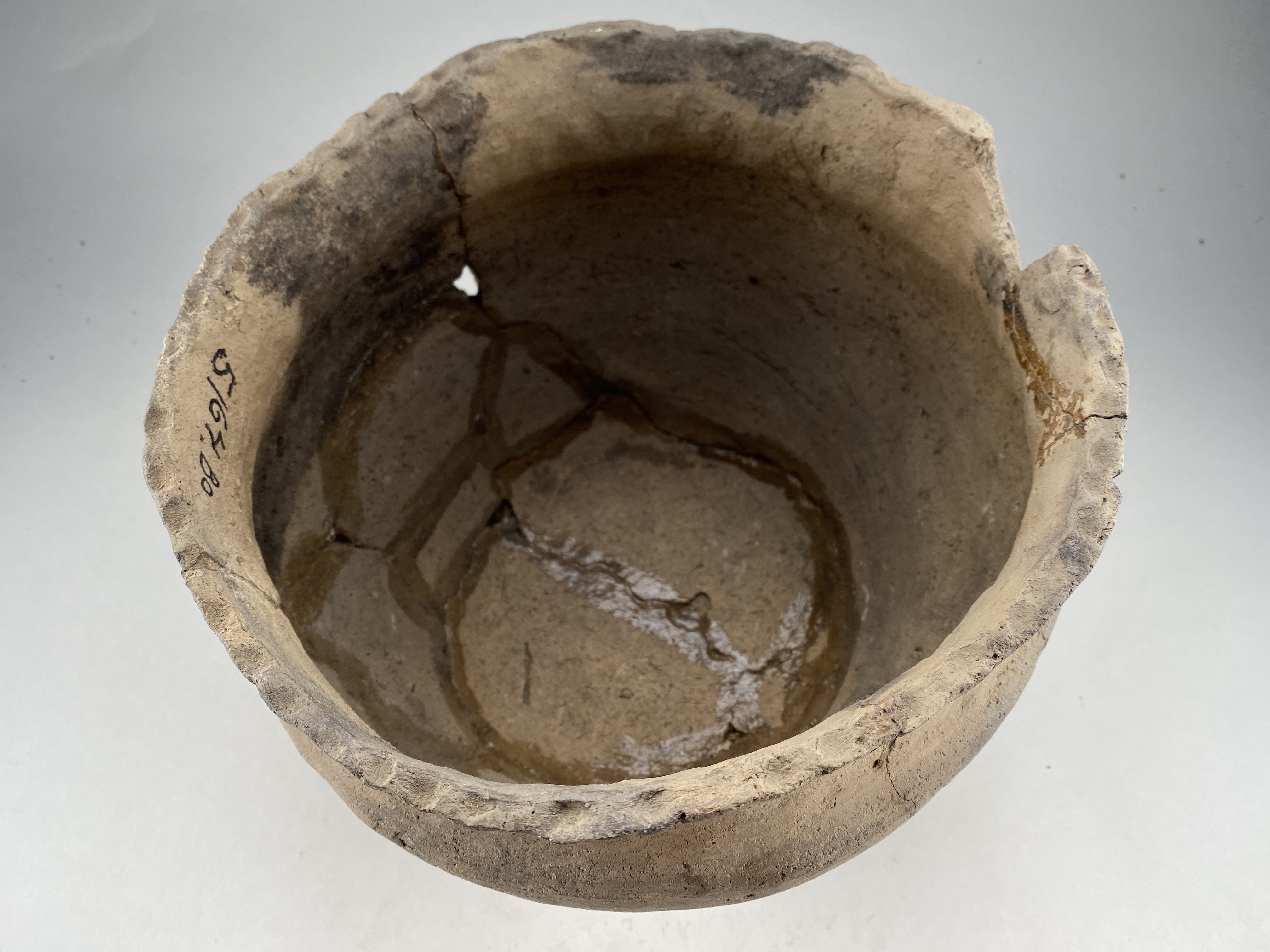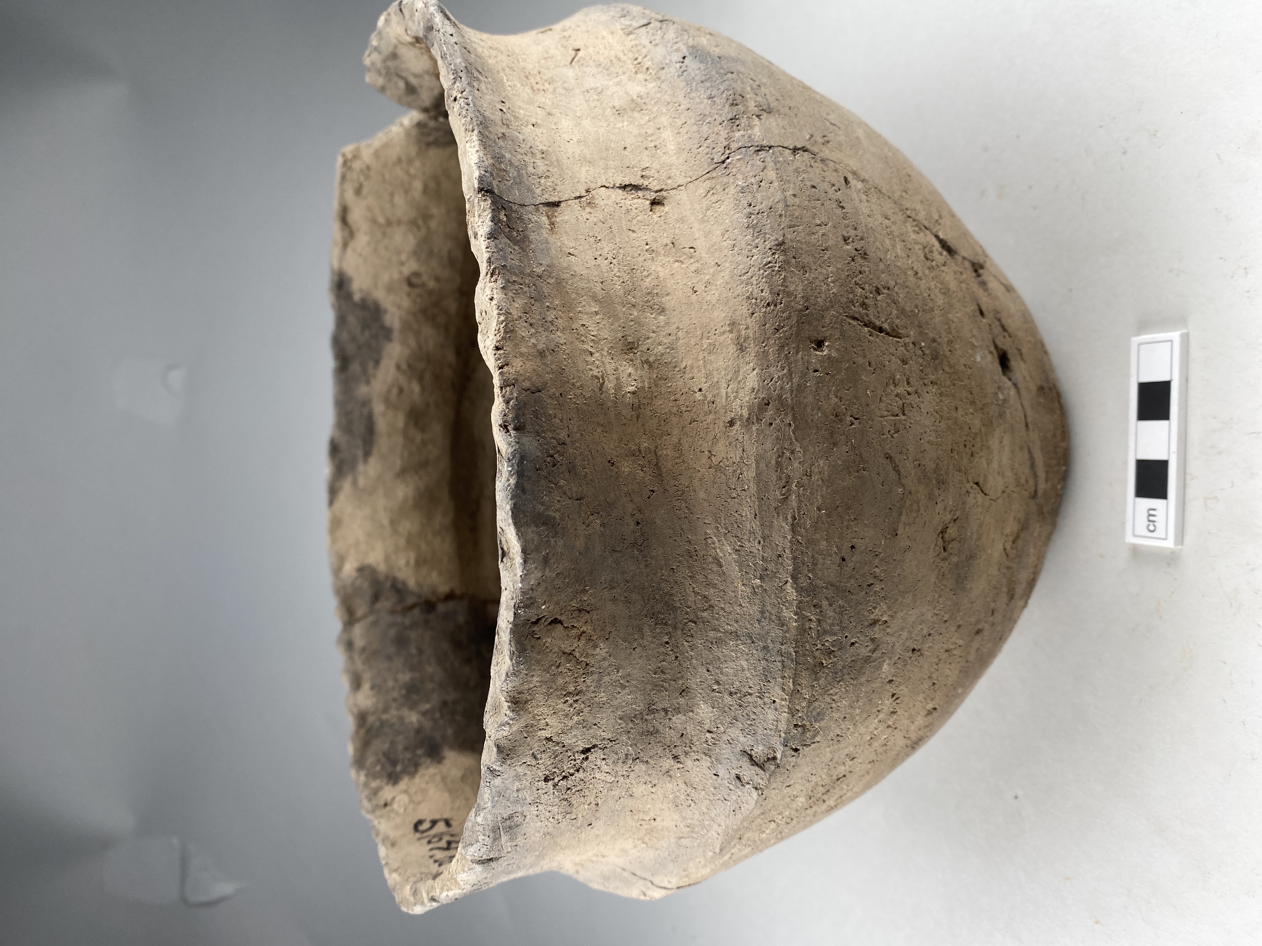 Stort, vidbrättat kärl med s-formad buk. Glättad yta. Flammigt oxiderat bränt. Dekor av fingertoppsintryck på mynningsläppen.
