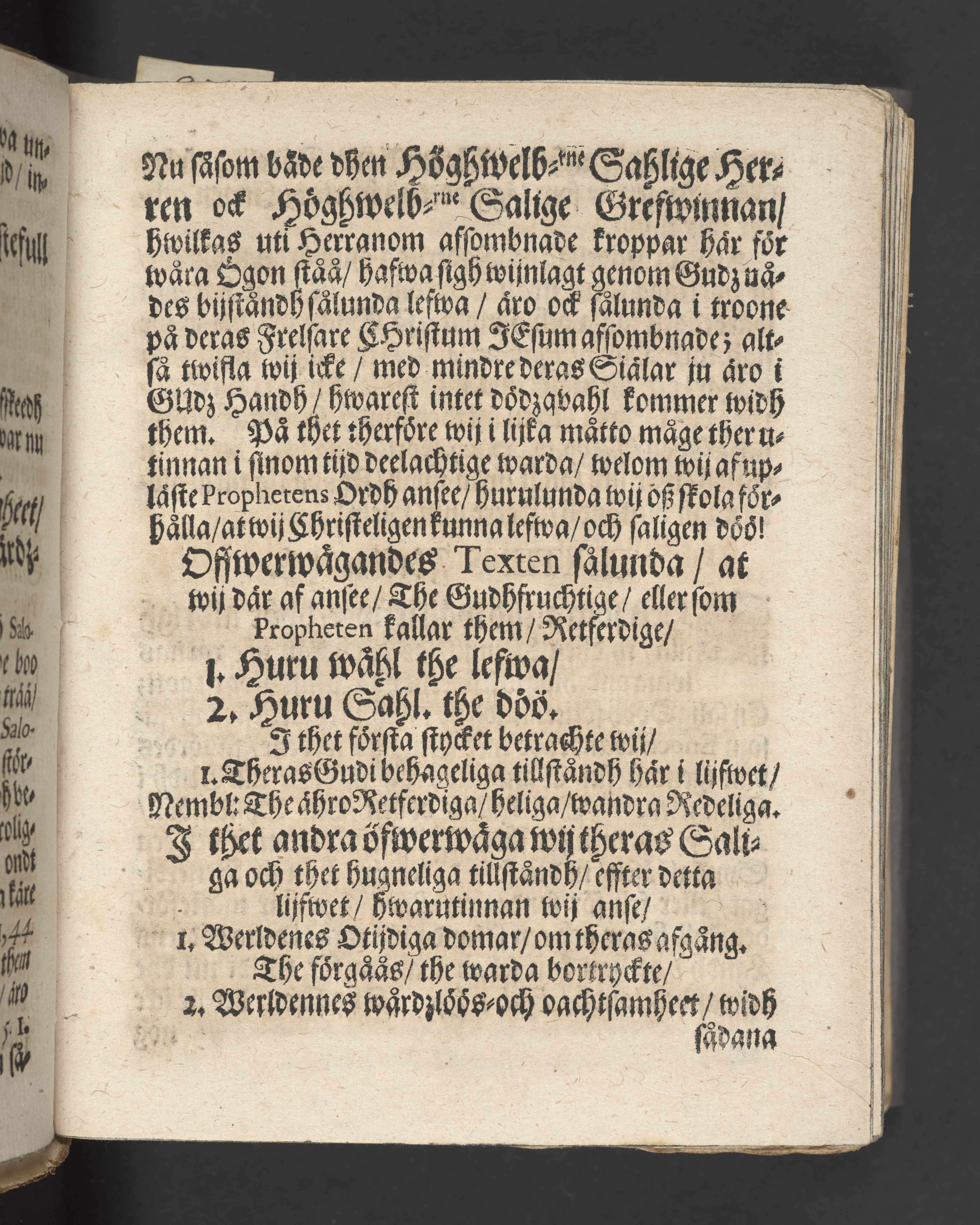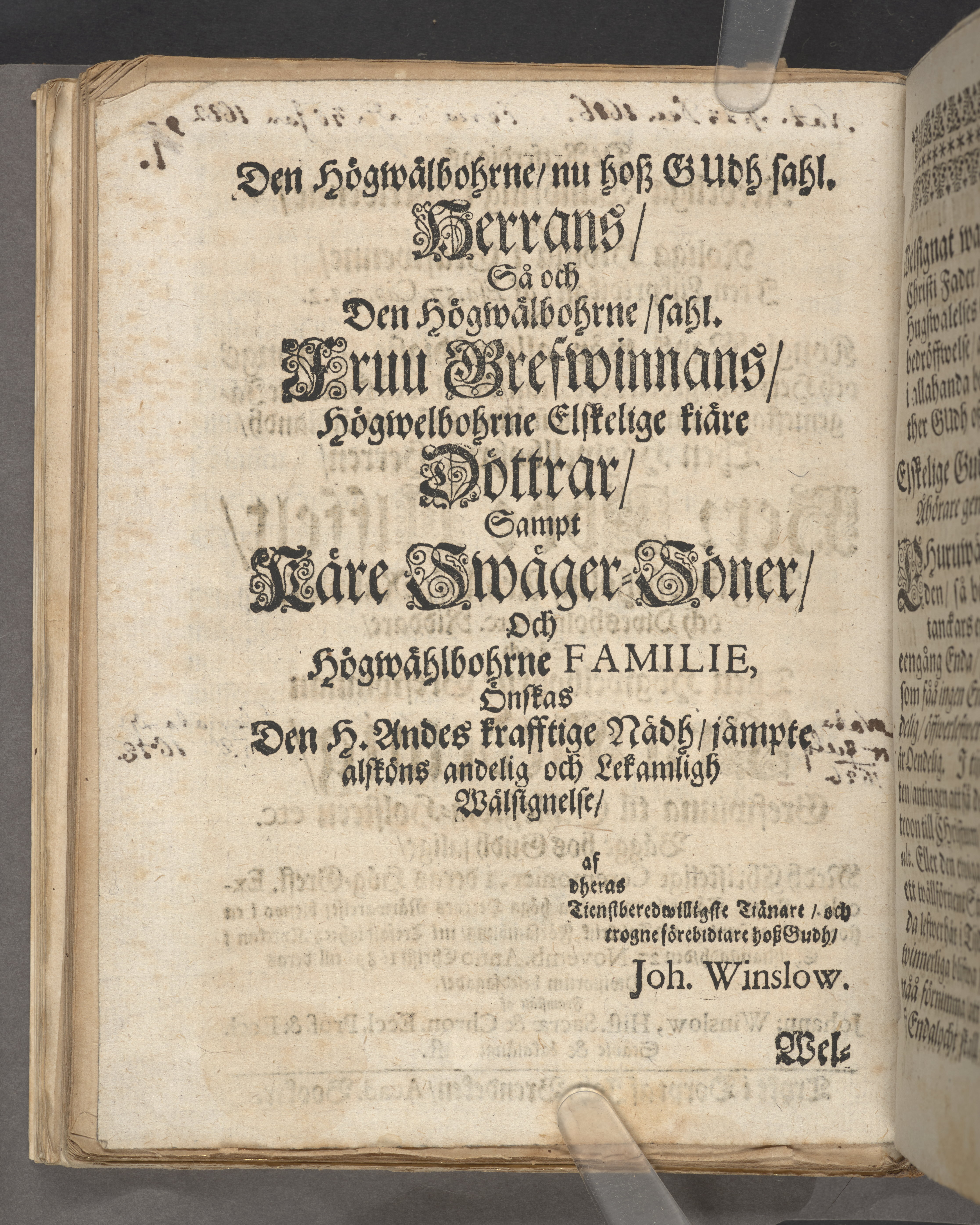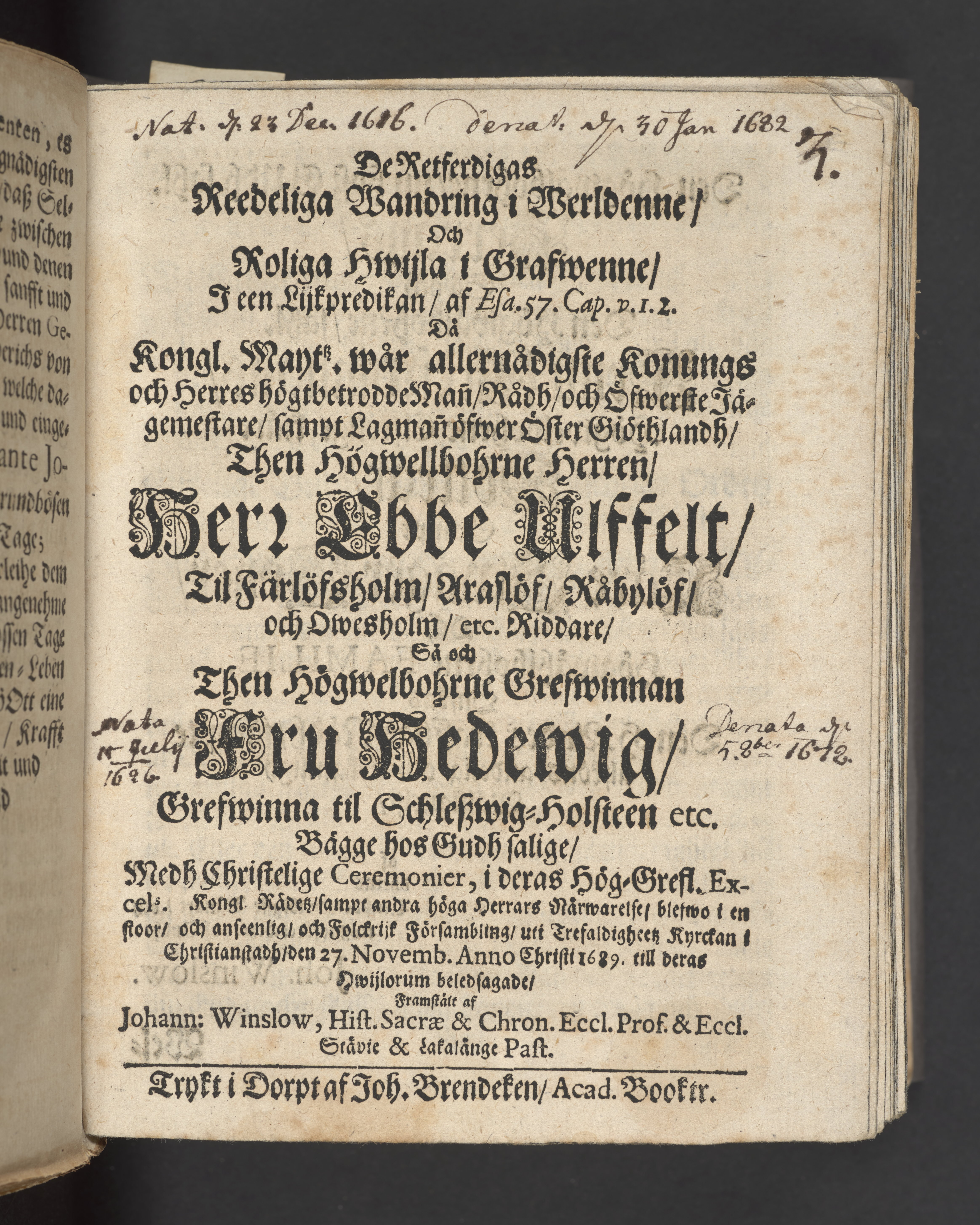 De Retferdigas reedeliga wandring i werldenne, och roliga hwijla i grafwenne, i een lijkpredikan, af Esa. 57. cap. v. 1. 2 då kongl. maytᵗᶻ wår allernådigste konungs och herres högtbetrodde man, rådh, och öfwerste jägemestare, sampt lagman öfwer Öster Giöthlandh, then högwellbohrne herren, herr Ebbe Ulffelt, til Färlöfsholm, Araslöf, Råbylöf, och Owesholm, etc. riddare, så och then högwelbohrne grefwinnan Fru Hedewig, grefwinna til Schleszwig-Holsteen etc. bägge hos Gudh salige, medh christelige ceremonier, i deras hög-grefl. excelˢ. Kongl. rådetz, sampt andra höga herrars närwarelse, blefwo i en stoor, och anseenlig, och folckrijck försambling, uti Trefaldigheetz kyrckan i Christianstadh 27. novemb. anno Christi 1689. till deras hwijlorum beledsagade, framstält af Johann: Winslow, hist. sacræ & chron. eccl. prof. & eccl. Stävie & Lakalänge past. Trykt i Dorpt af Joh. Brendeken, acad. booktr.