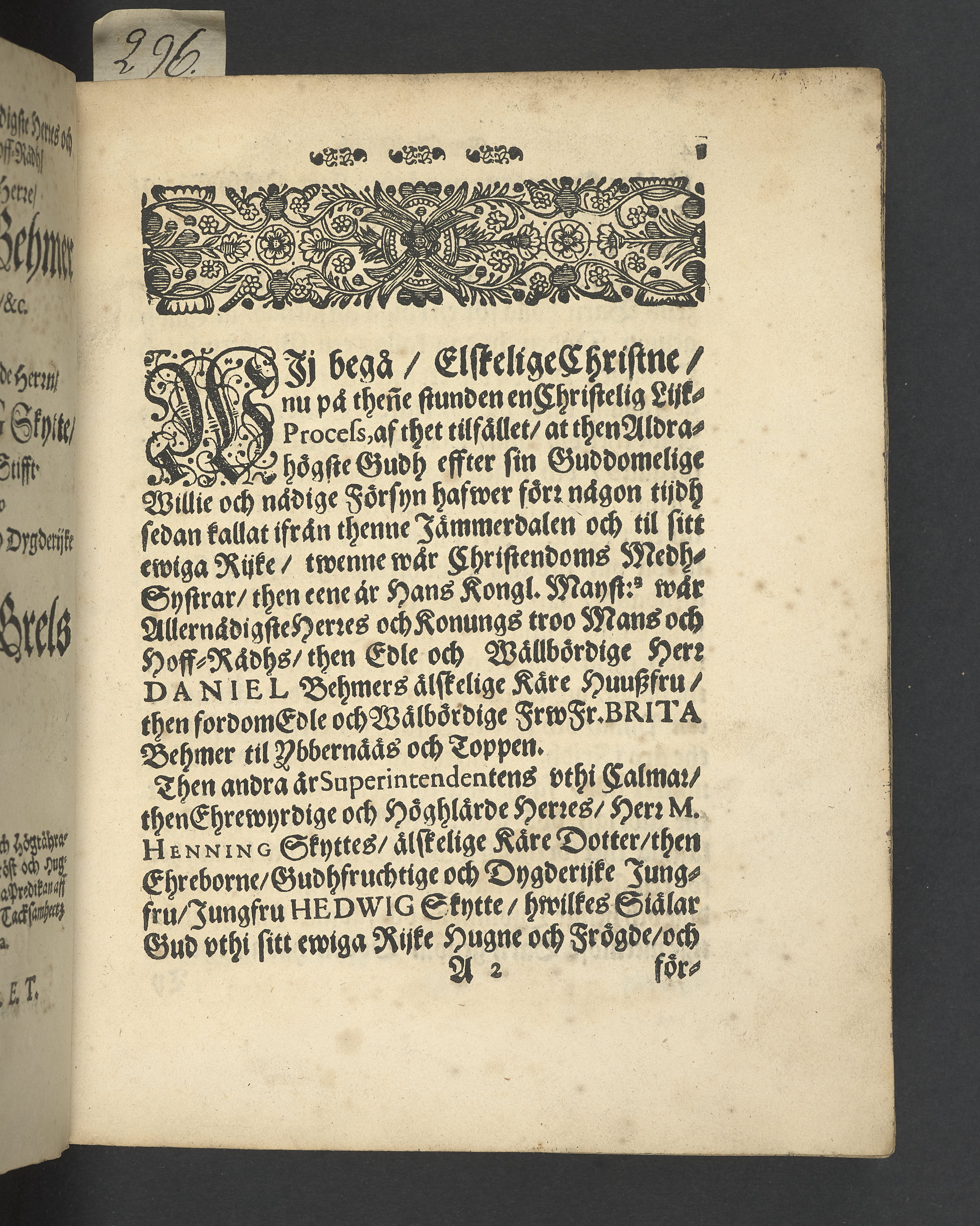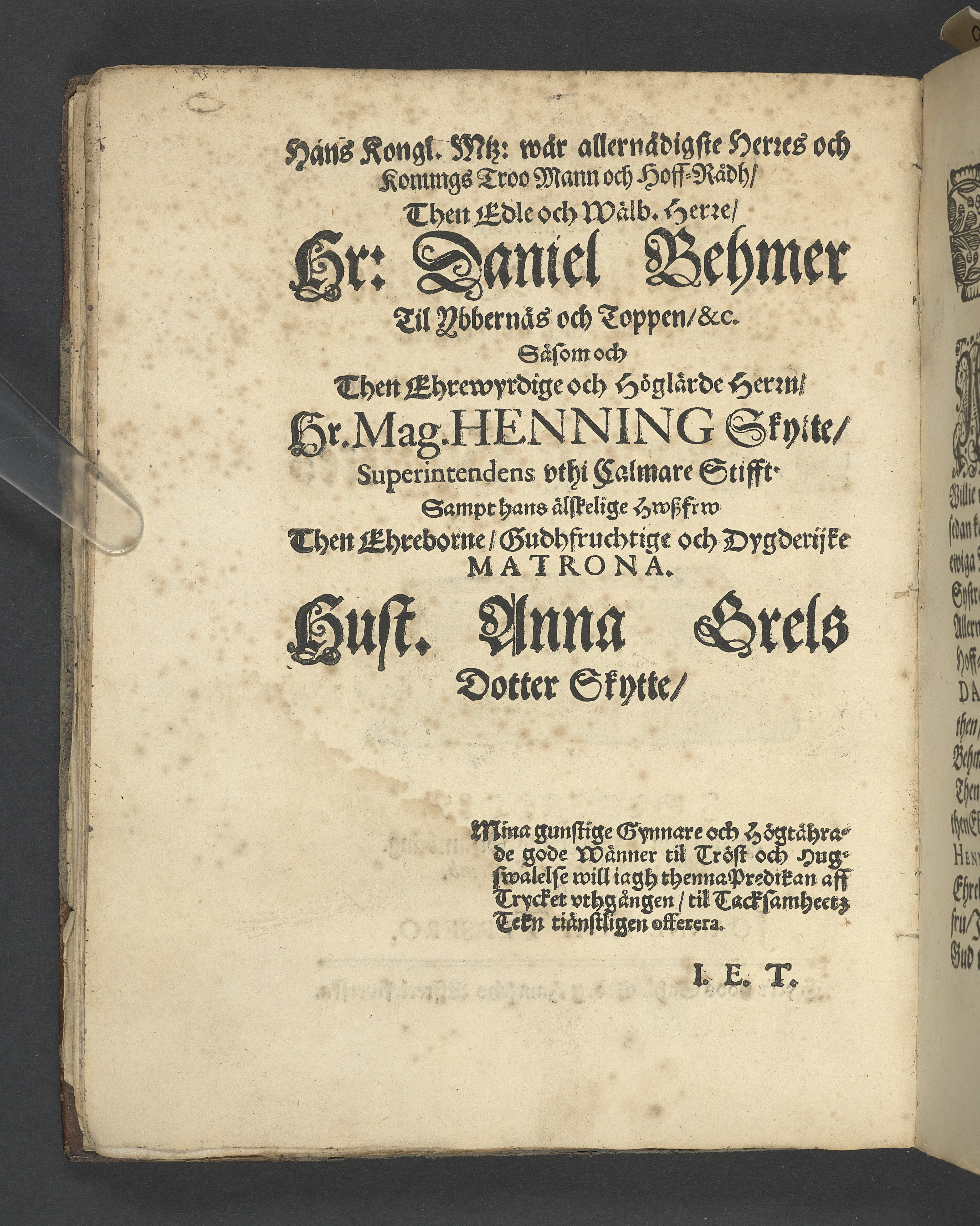 EEn christeligh lijk-predikan öfwer then 116. konung Davids psalm. Widh then edle och wällbördige frues, fr. Briijta Behmer, til Ybernåås och Toppen, etc. såsom ock then ehreborne, gudfruchtige och dygderijke jungfrues, j. Hedewig Schyttes hederlige jordefärd. I Stockholm hollen vthi Ridderholms försambling. Åhr 1668. then 11. septemb. aff Joanne Elai Tersero. Tryckt hoos sahl. Georg Santschs effterlefwerska.