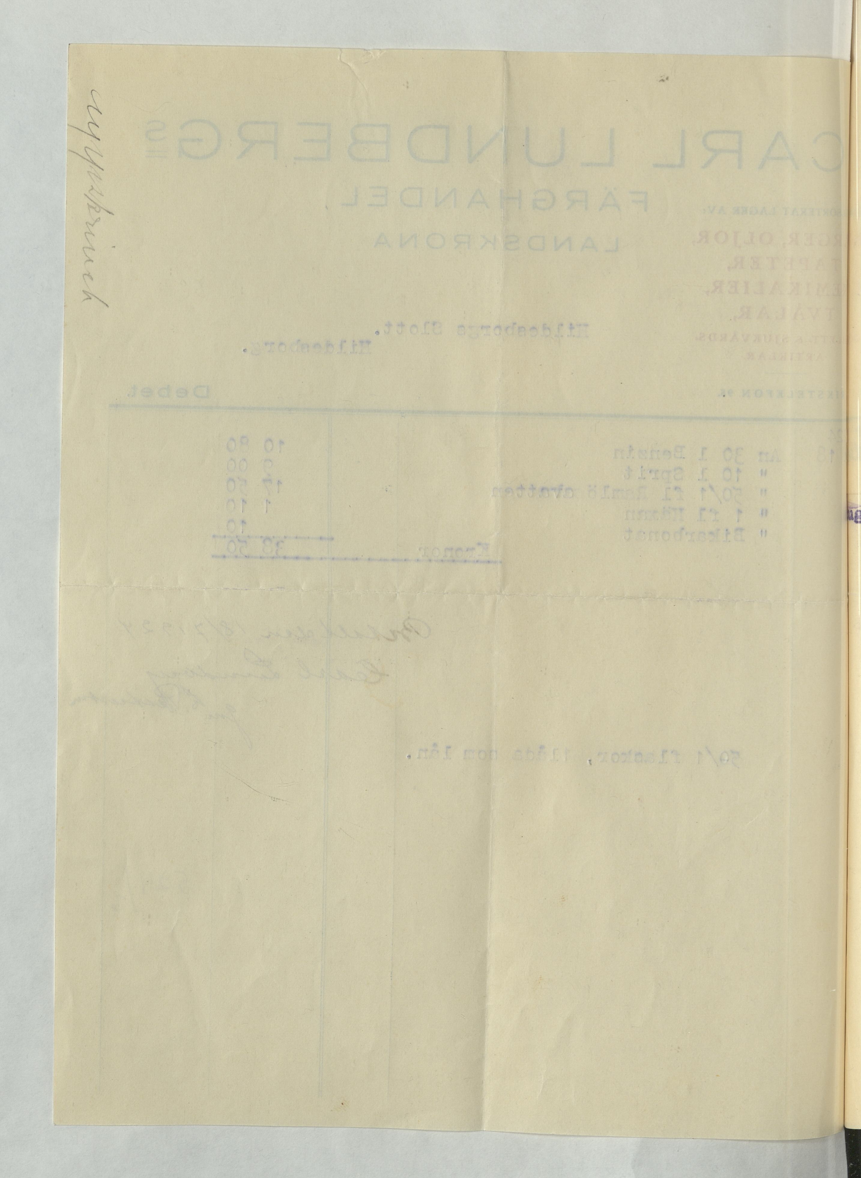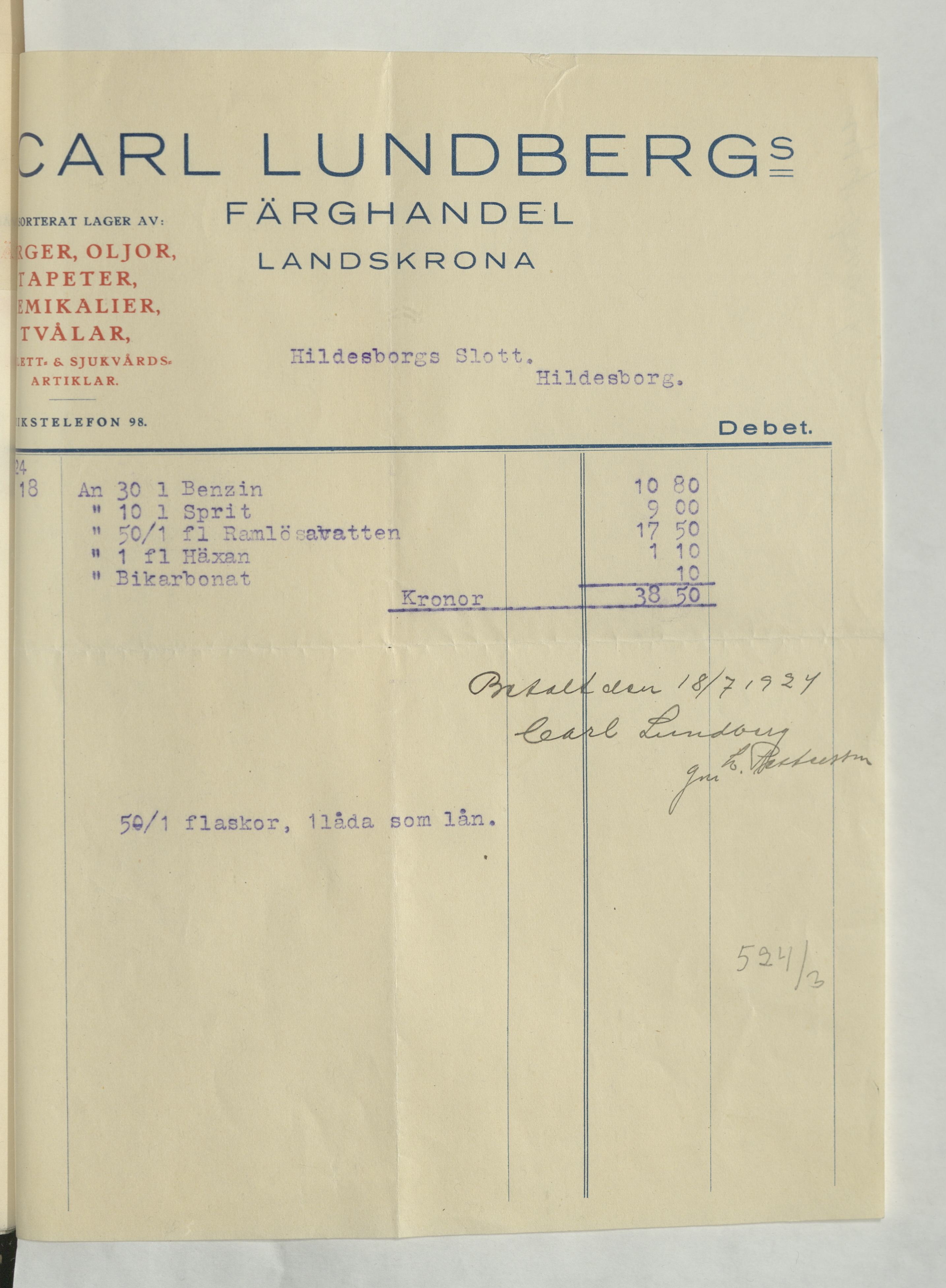 Kvitto från Carl Lundbergs Färghandel, Landskrona, till Hildesborgs slott. 1 Benzin, 1 Sprit, 59/1 fl Ramlösavatten, 1 fl Häxan, Bikarbonat, totalsumma 38:50Kr. Betald 18 juli 1924.