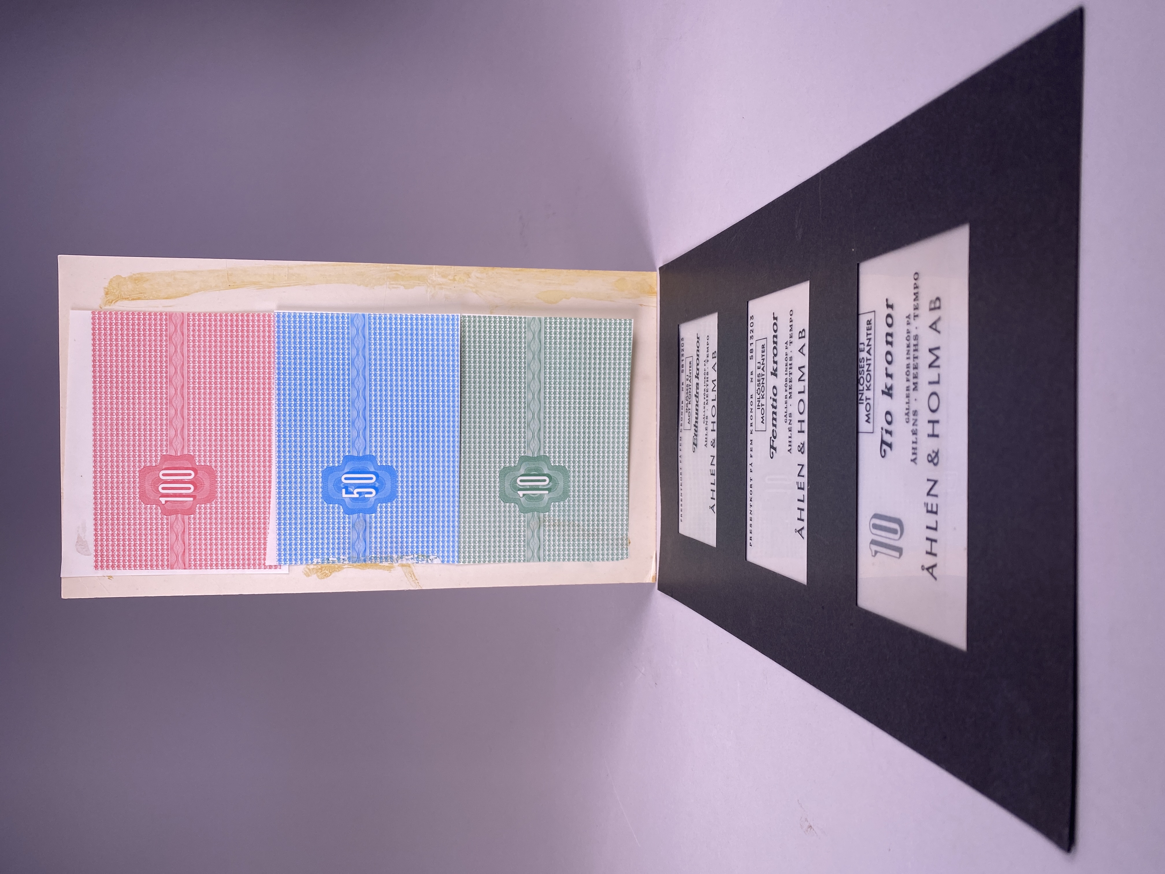 Exemplaret hittades tillsammans med en grupp om 12 föremål (OH-film) i ett brunt kuvert med inskriptionen "Presentkort / Förslag / Åhlén o Holm". Filmerna är inte daterade. |