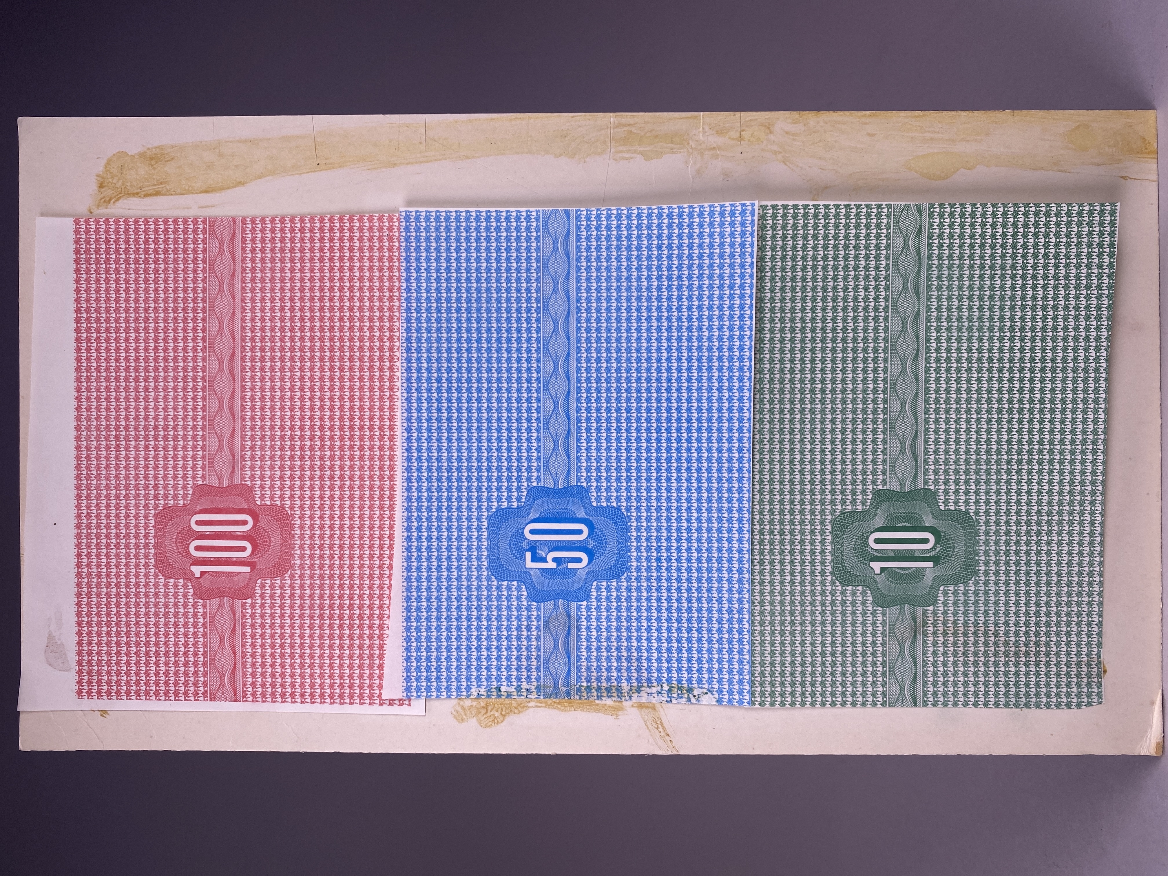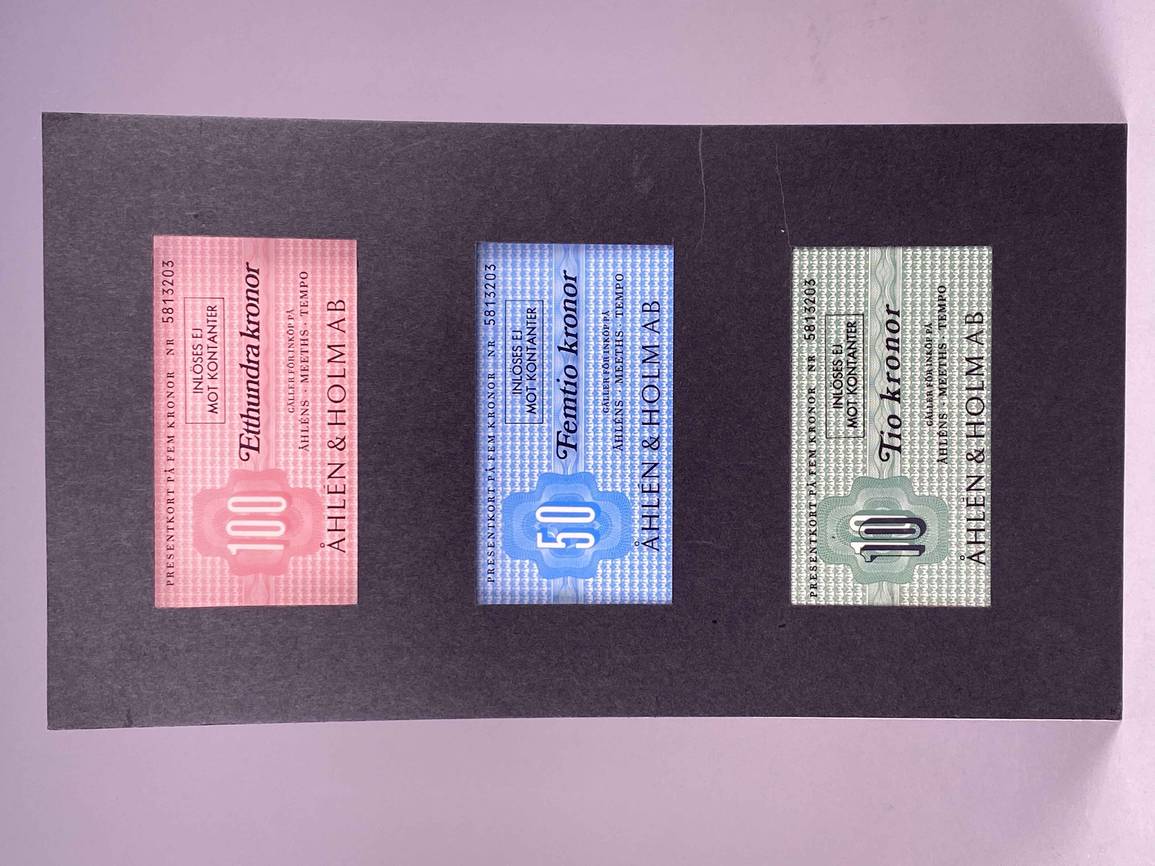 Ett designförslag på presentkort som gäller för inköp på Åhléns mm. 3 stycken: svart text tryckt på overheadfilm/skrivfilm som placerats över röd, blå och grön bakgrund.