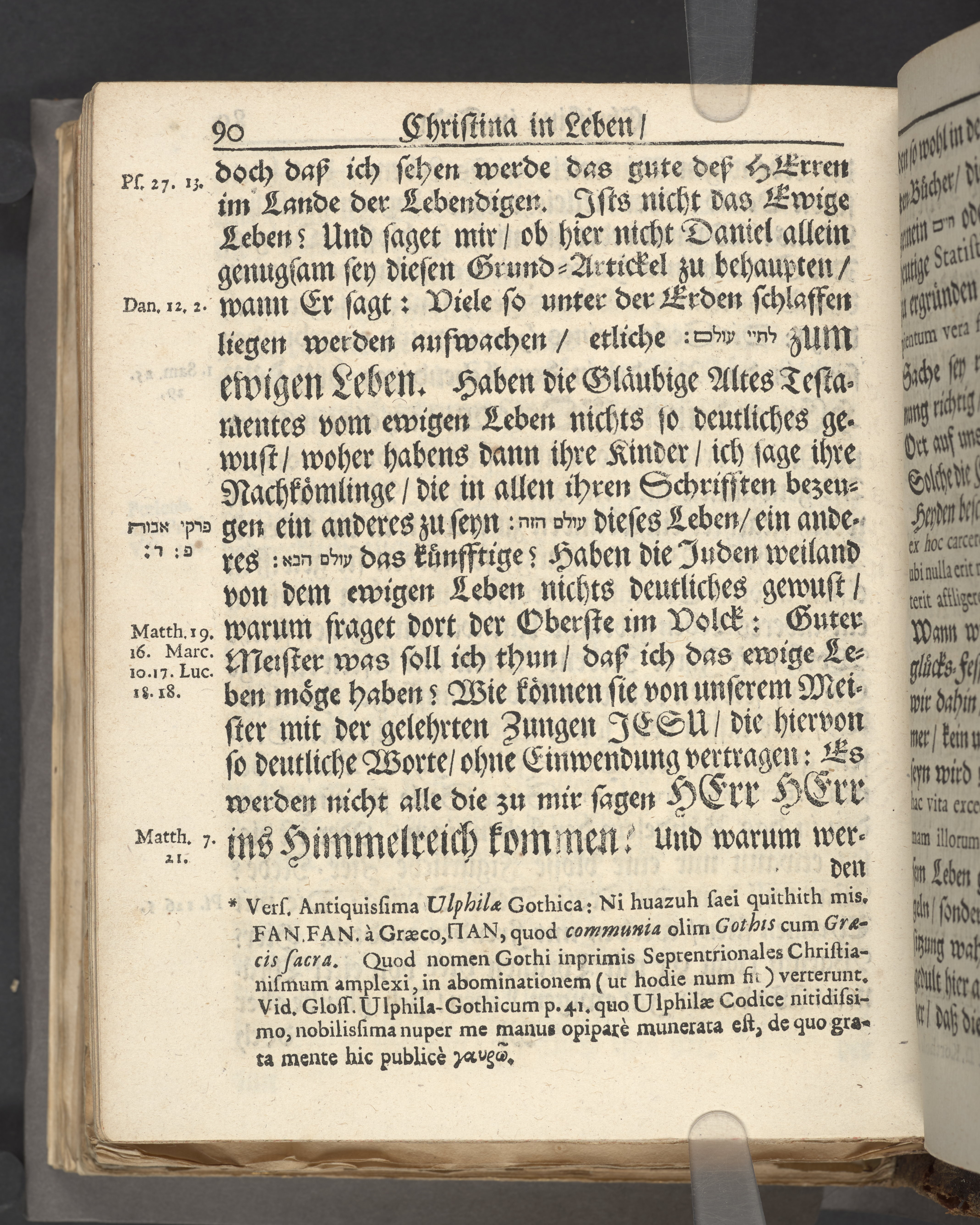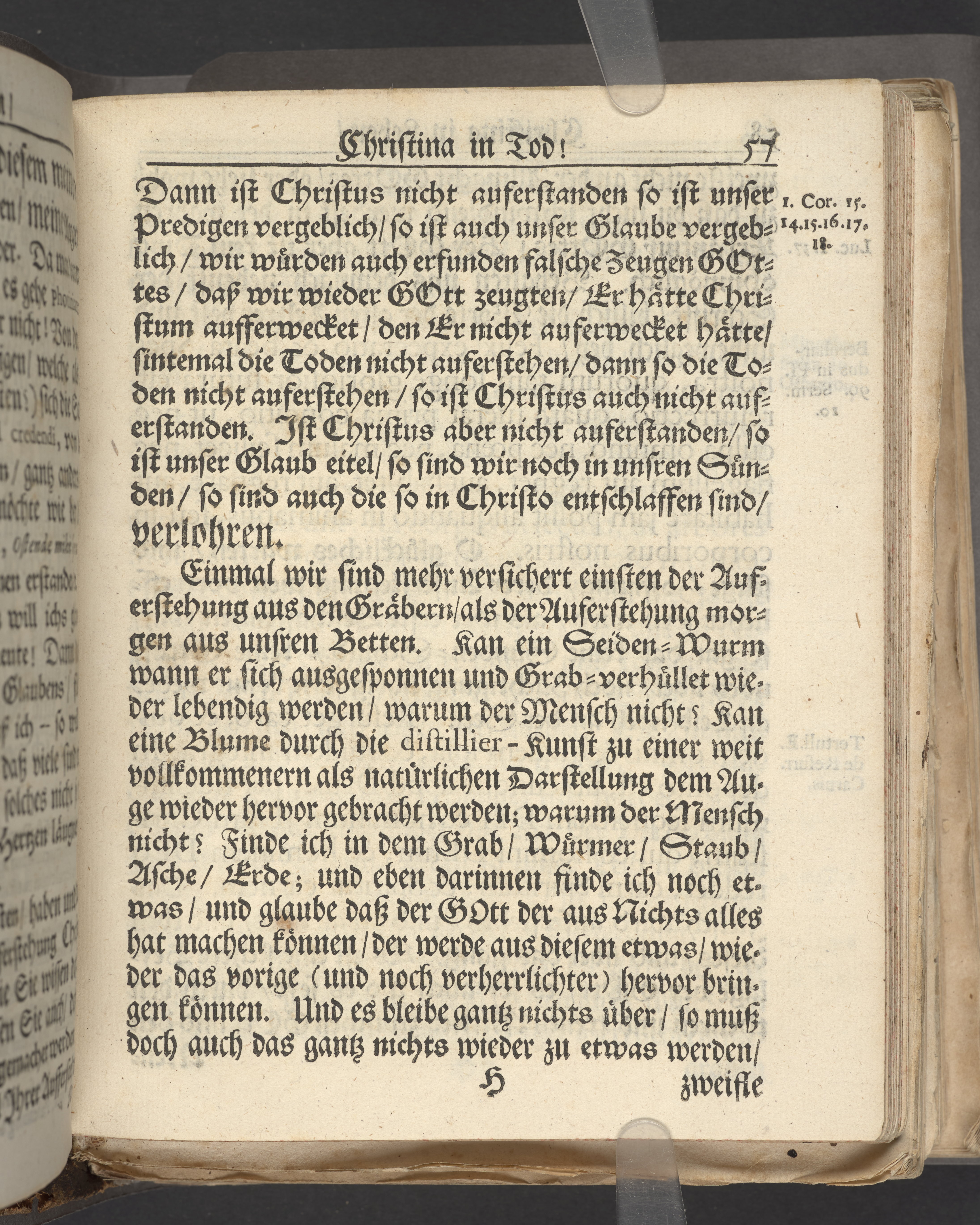 Christina in Leben/ Christina in Tod! Das ist Frühe doch lieb-volle Segen-Letze/ trauer-benehmende Trost-Letz/ und hoffnungs-volle Glaubens-Letze/ der weyland wohl-ehrbarn und gross-ehren tugendreichen Frauen Fr. Christina Grönin, gebornen Scharen-Bergin, desz wohl-ehren-vesten, grosz-achtbaren auch wohl-fürnehmen Herren Werner Gröns/ vornehmen Kauf-und Handels-Herren in hiesiger Königl. Residenz-Stadt Stockholm Herz-geschätzen Ehe-Gattin/ als deren verblichener Leichnam den 8 Maj-Monats, laufenden 1698-sten Heil-Jahrs, in Maria Magdalena Kyrch bey so wohl hoher/ als sonst ungemeiner Versamlung/ zur sanfften Erden-Ruh gebracht wurde/ zu inniger Trost-fasung vorgestellet von Johann Jacob Leibniz/ der h. Schrifft D. der löbl. Teutsschen Gemeine Past. und Consist. Assess. Stockholm/ Gedrucht bey Henrich Keysern/ J.K.Maejest: und der Acad. in Ups. Buchdrucker
