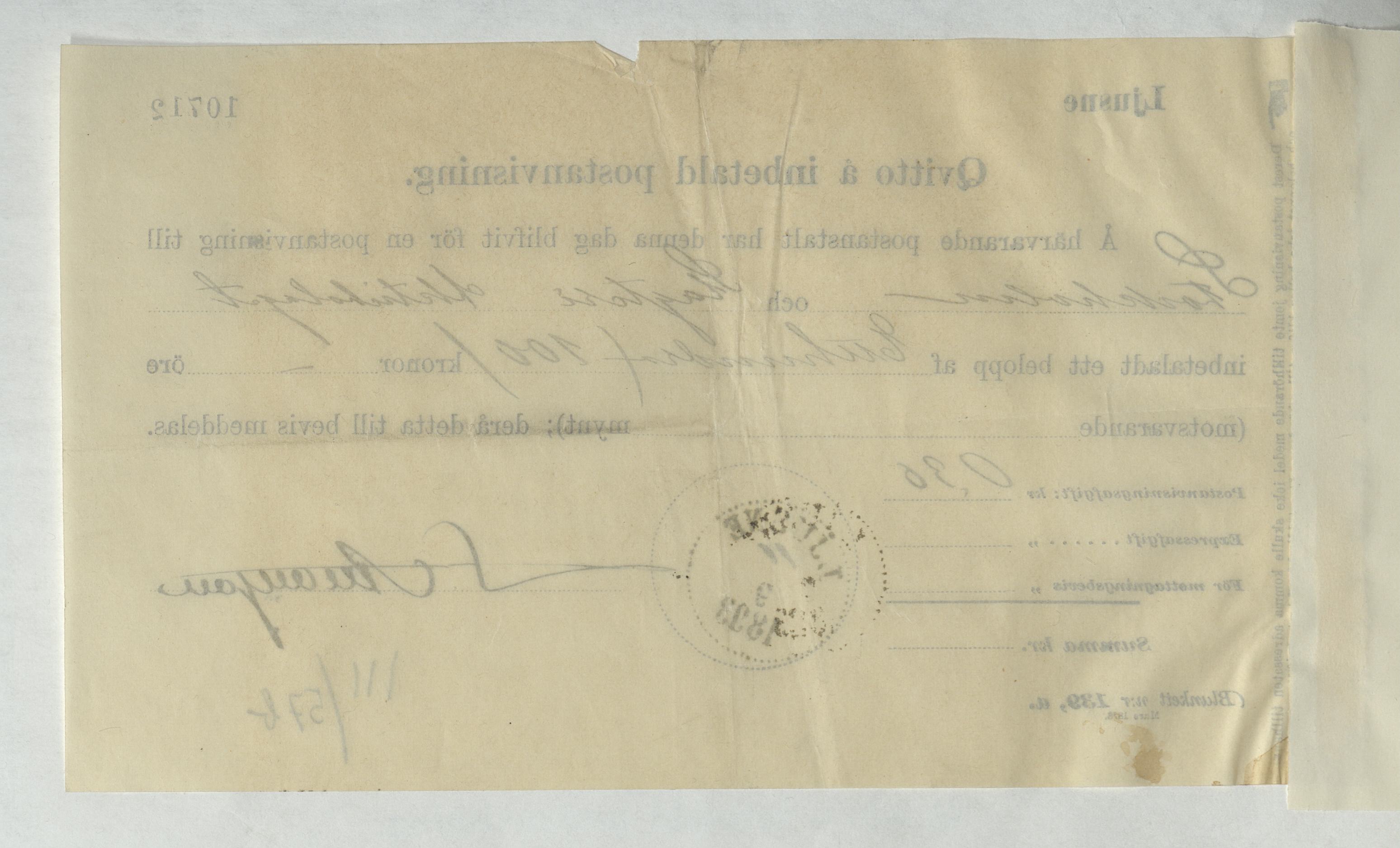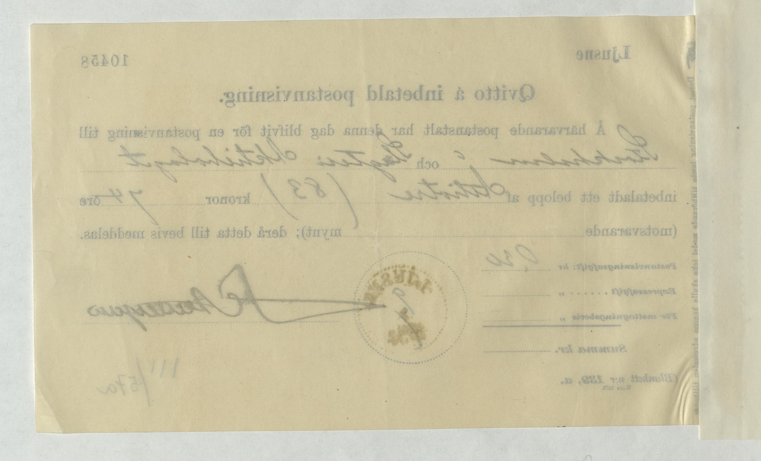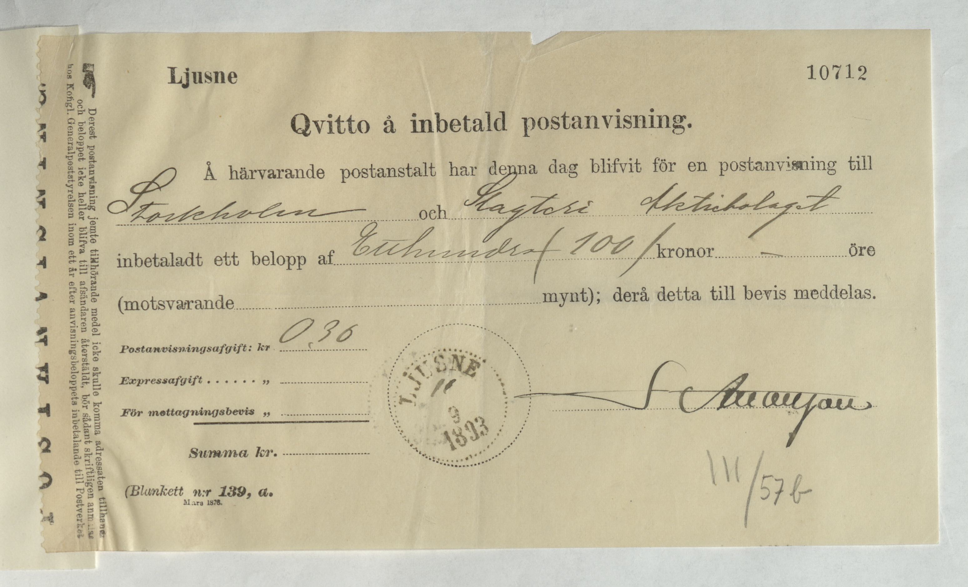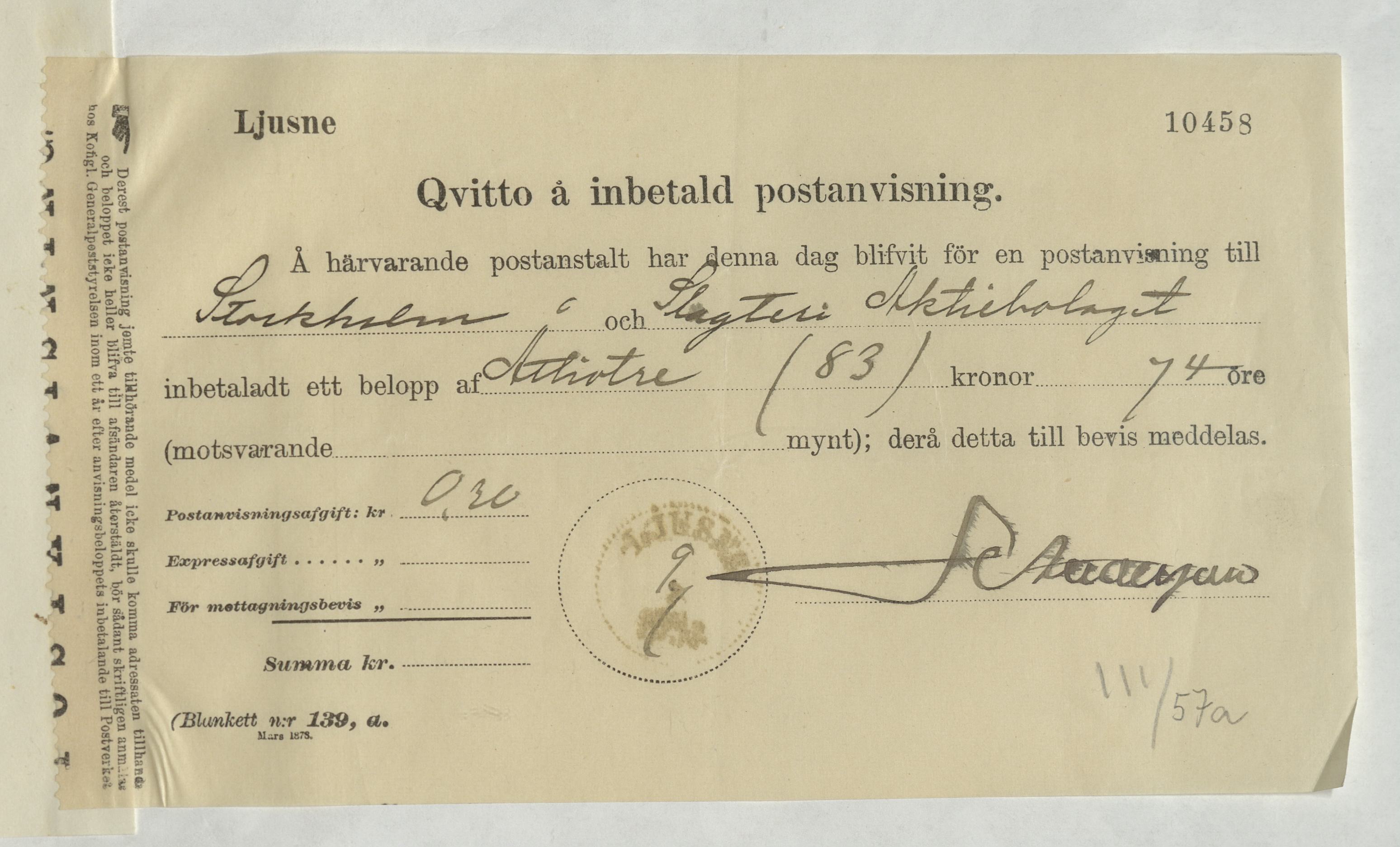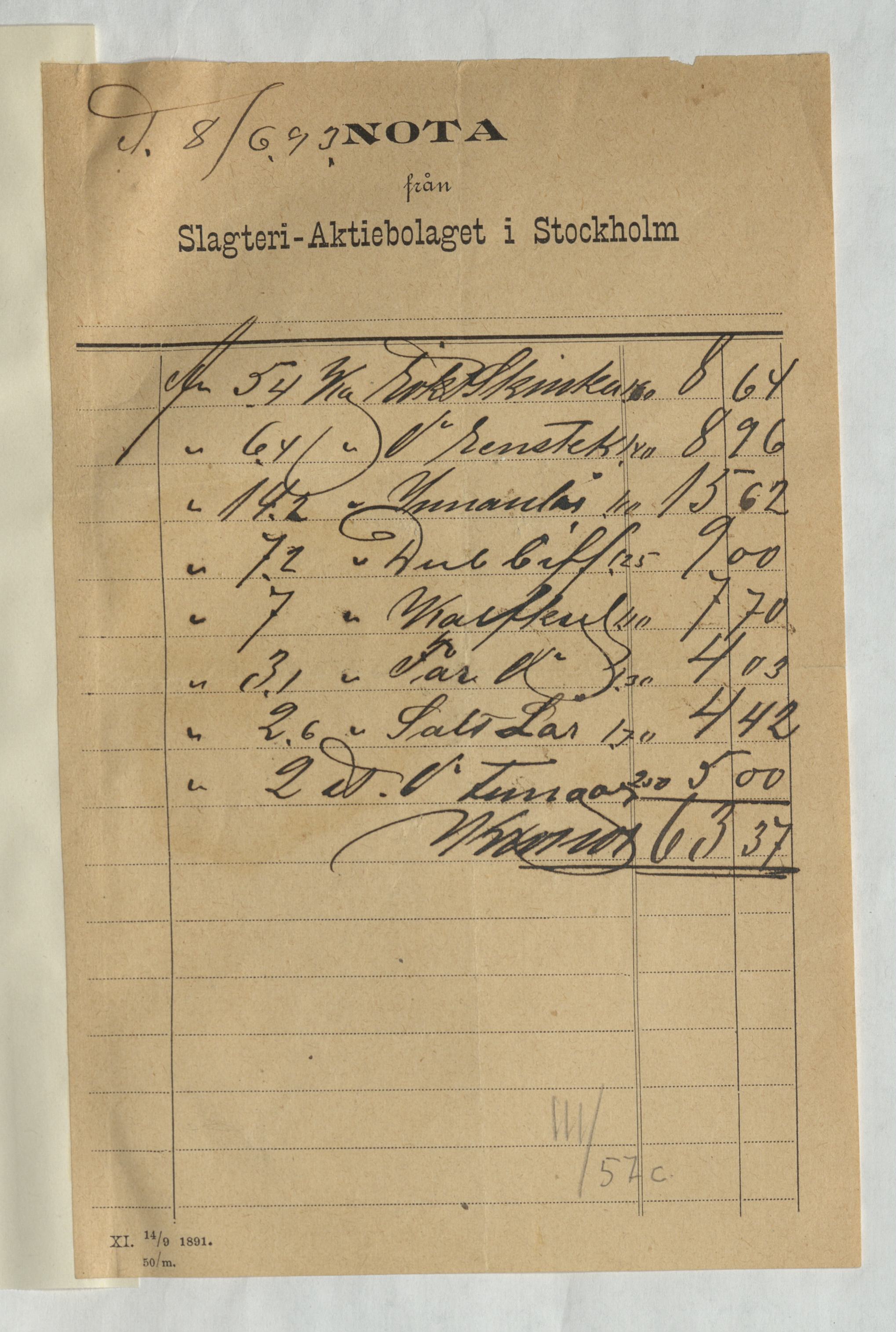 Kvitto från Slagteri Aktiebolaget i Stockholm