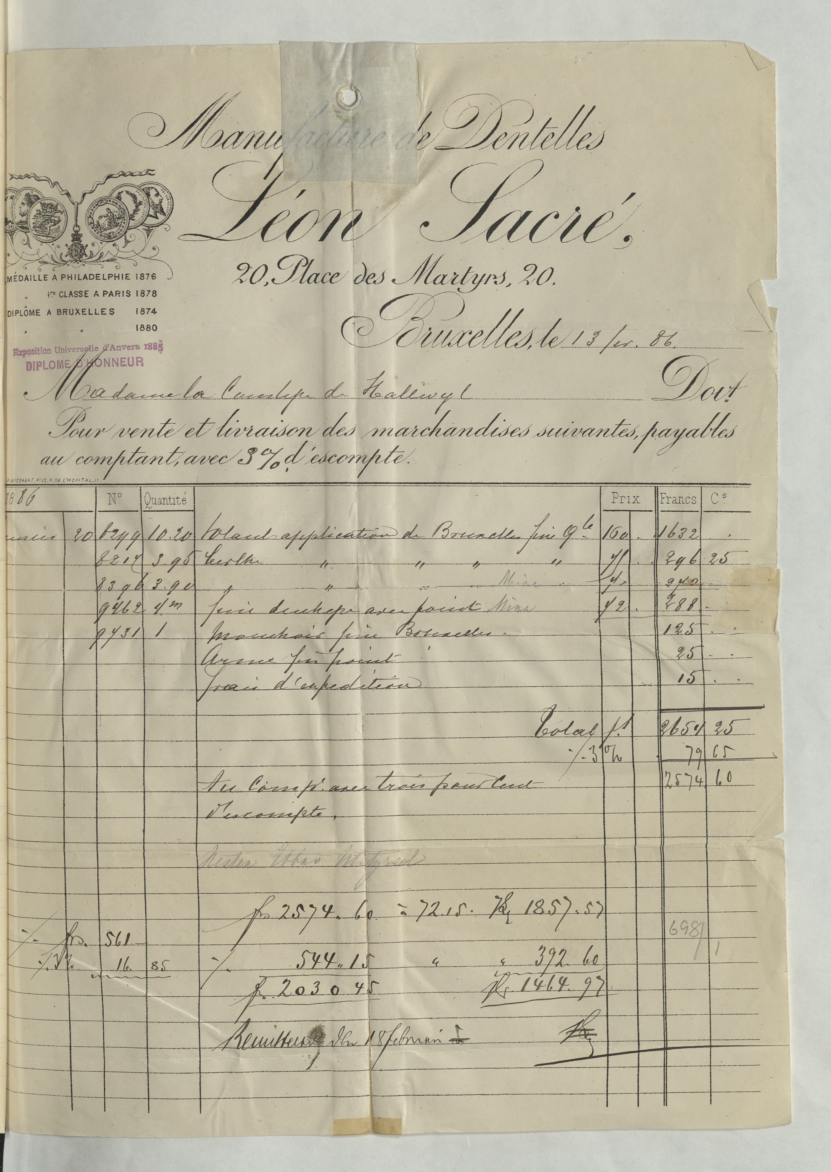 Kvitto från Léon Sacré, Manufactures de Dentelles, Bruxelles till Madame de la Hallwyl med en totalsumma på 2574:60Kr. Bryssel 13 februari 1886.