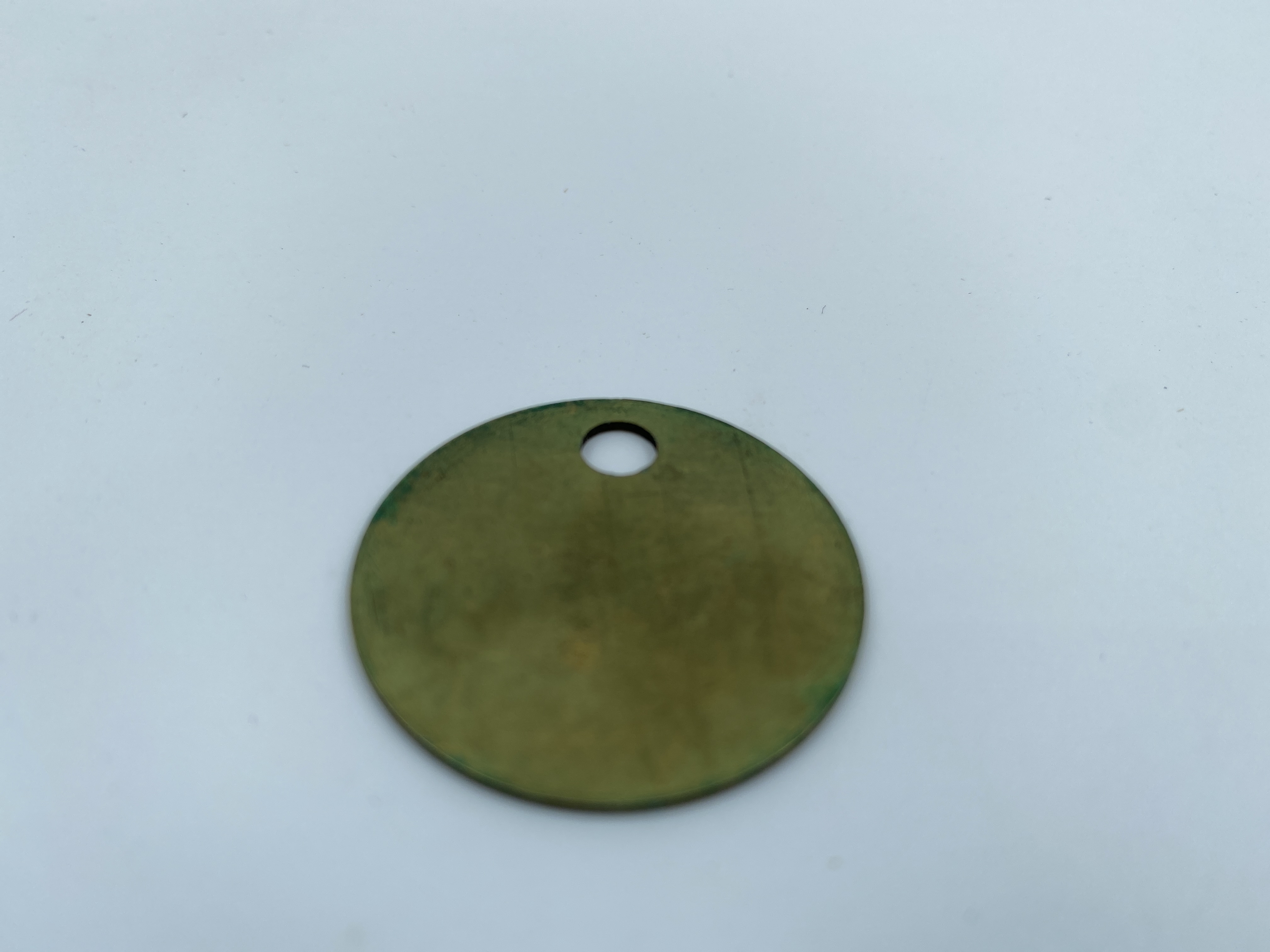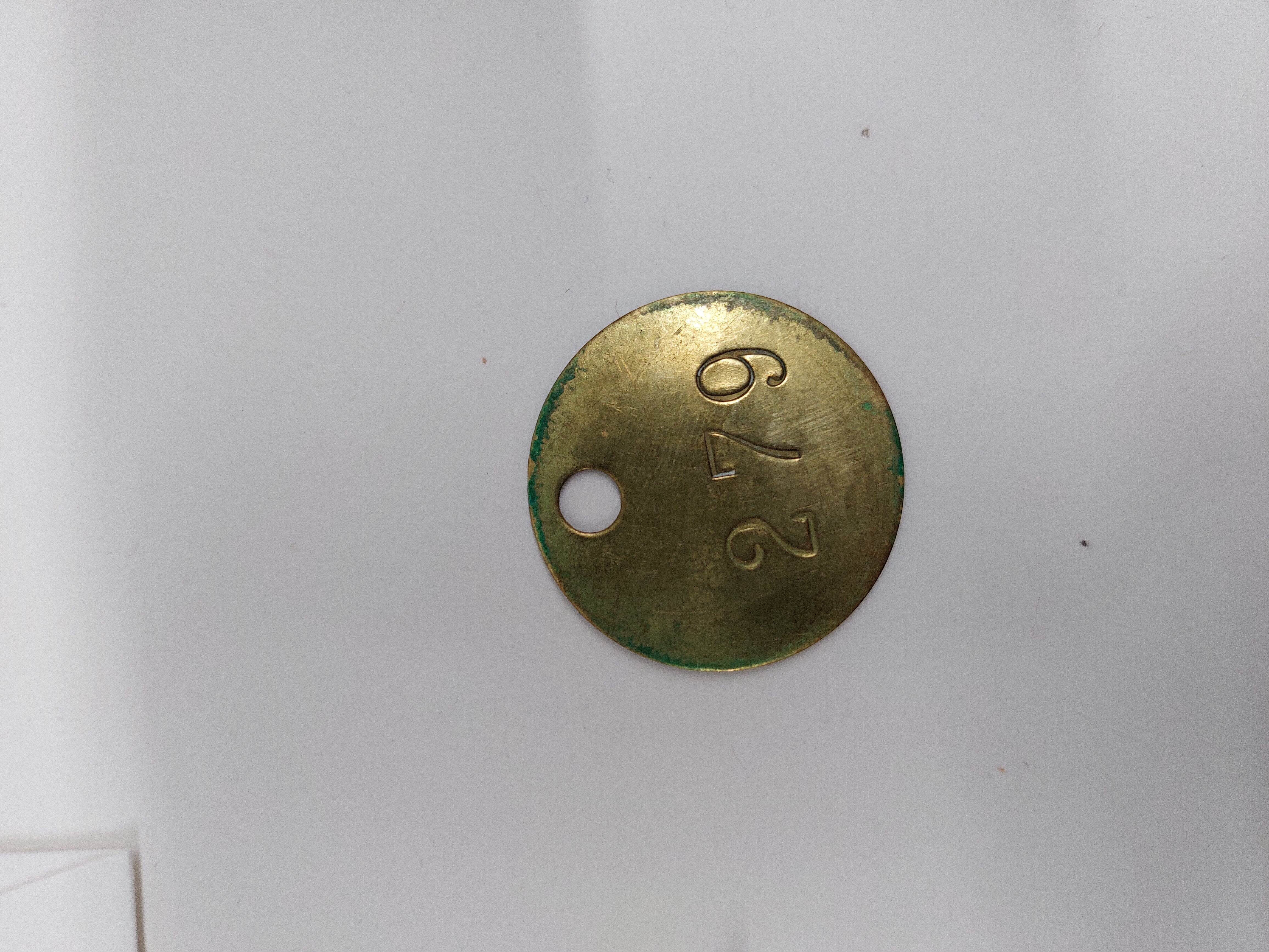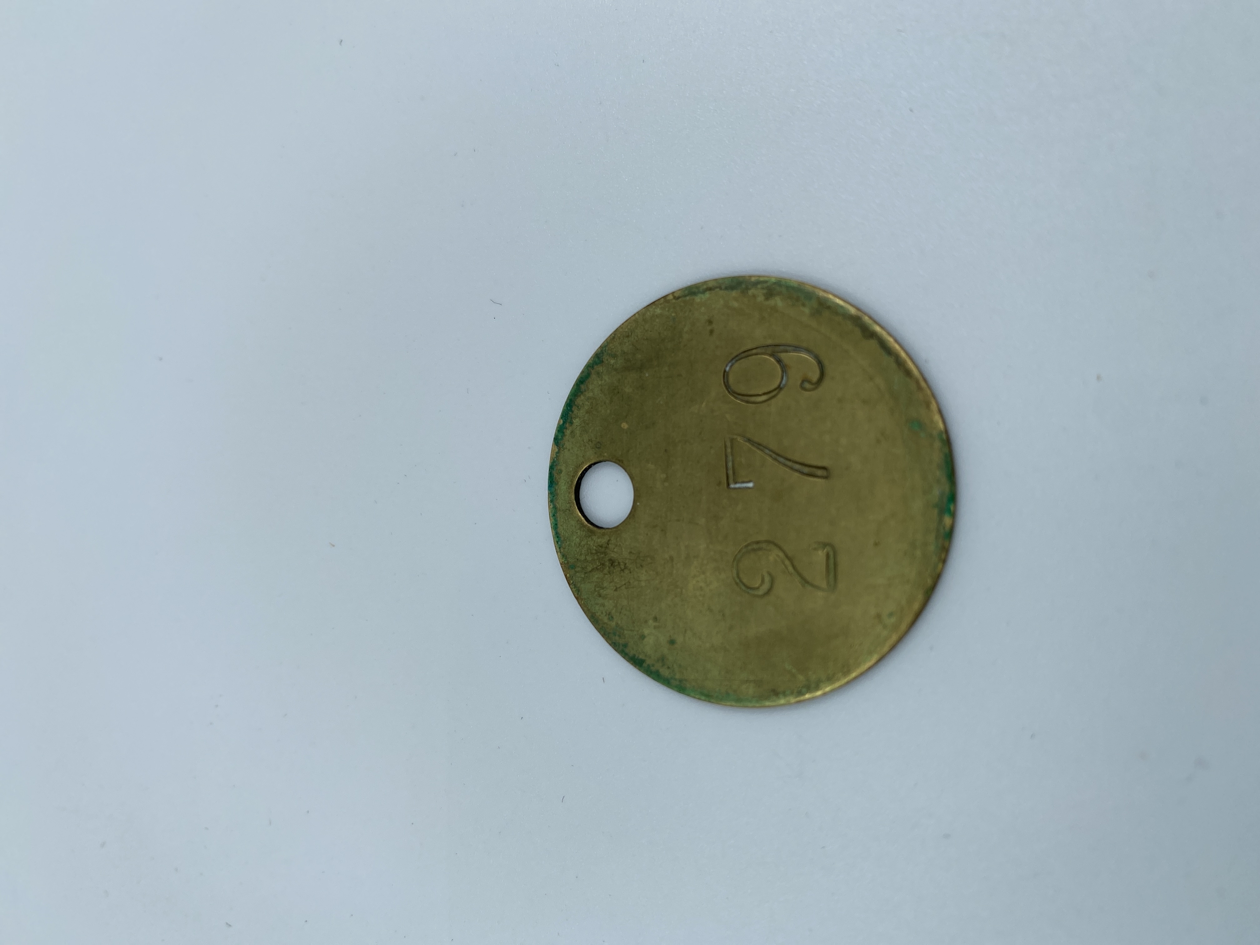 Rund nummerbricka i gul metall. Har troligen tillhört Georg eller Alice witt.