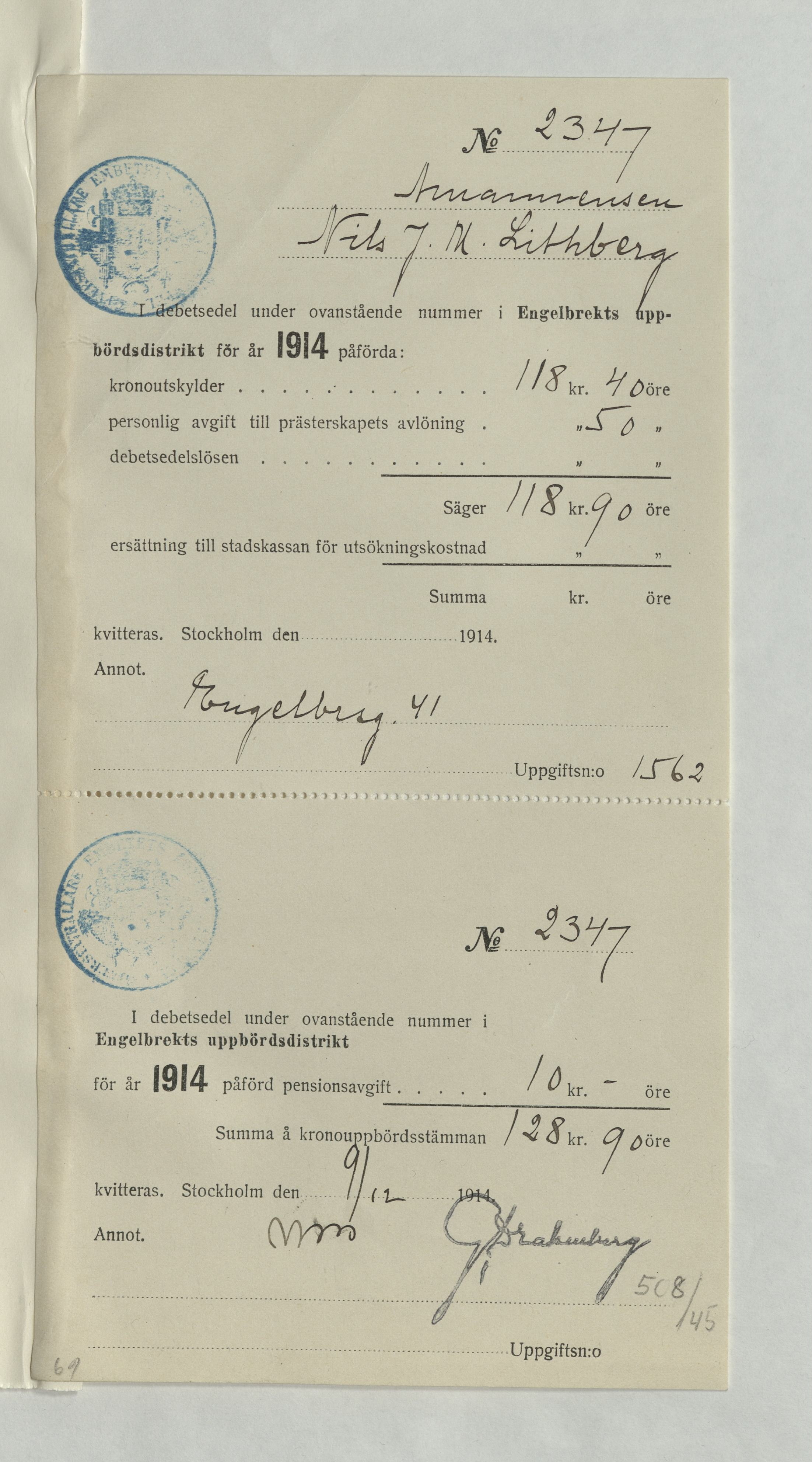 Debetsedel i Engelbrekts uppbördsdistrikt gällande amanuensen Nils Lithberg, 1914