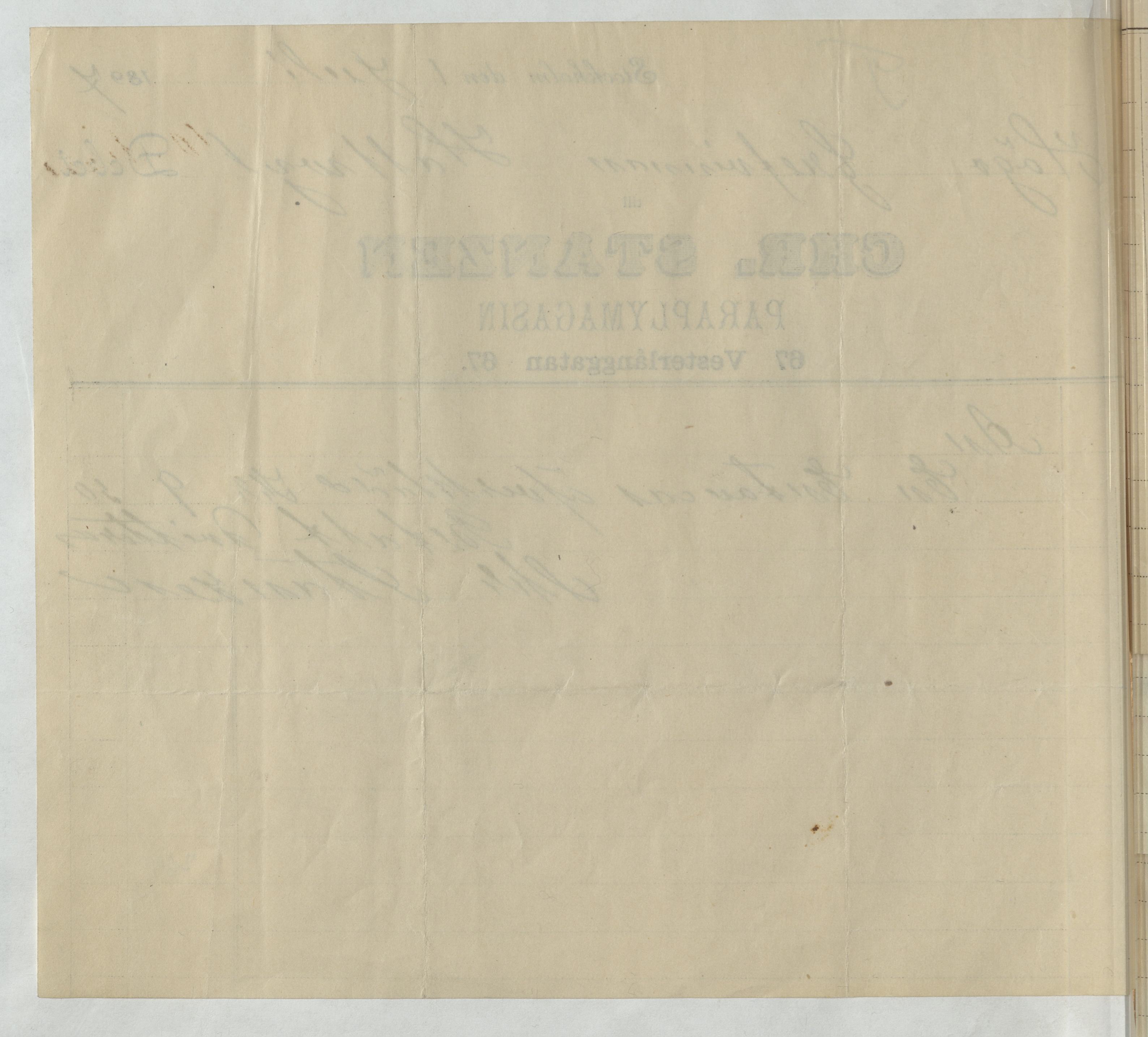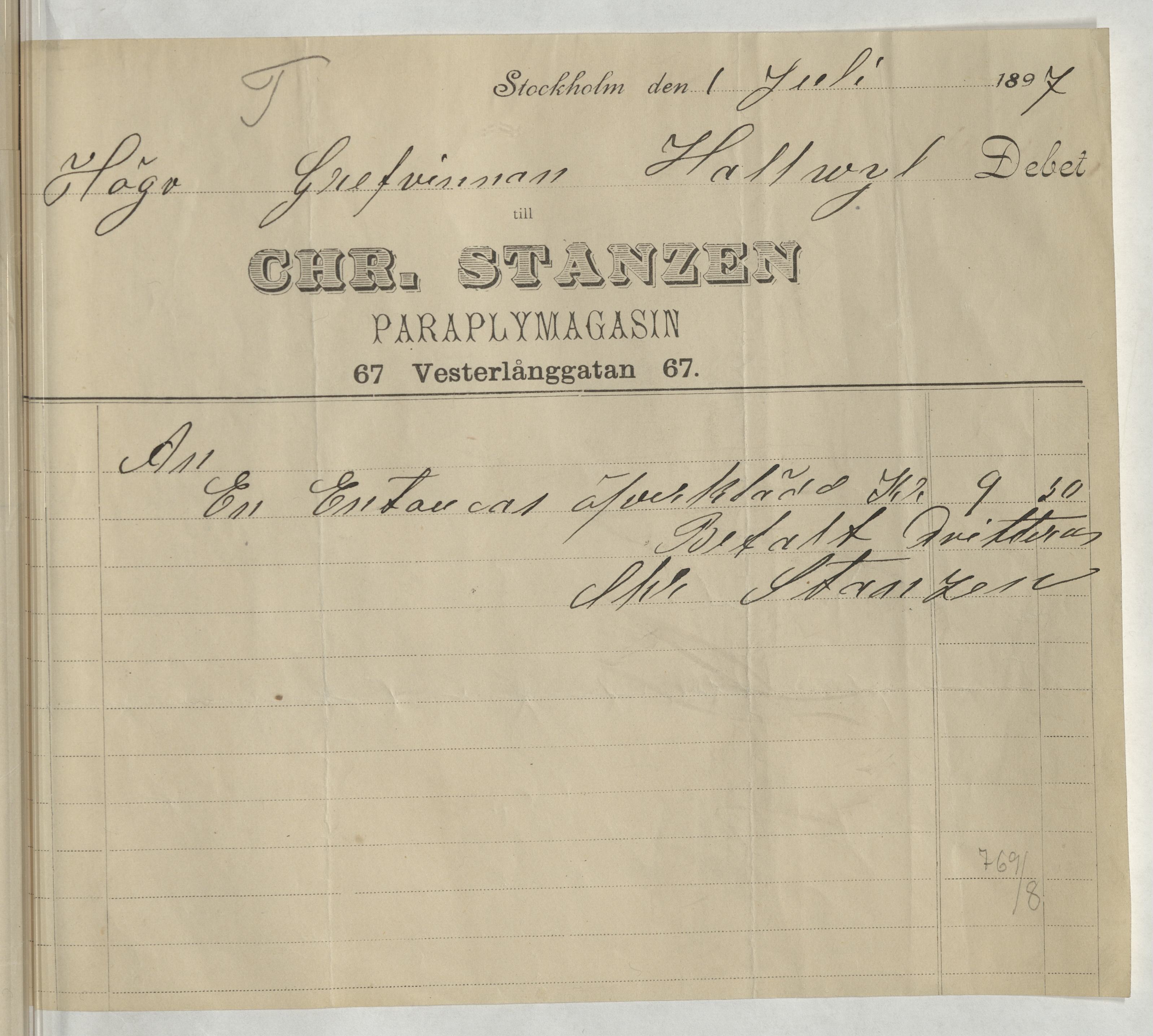 Kvitto från Chr. Stanzen Paraplymagasin. Stockholm, 1897.