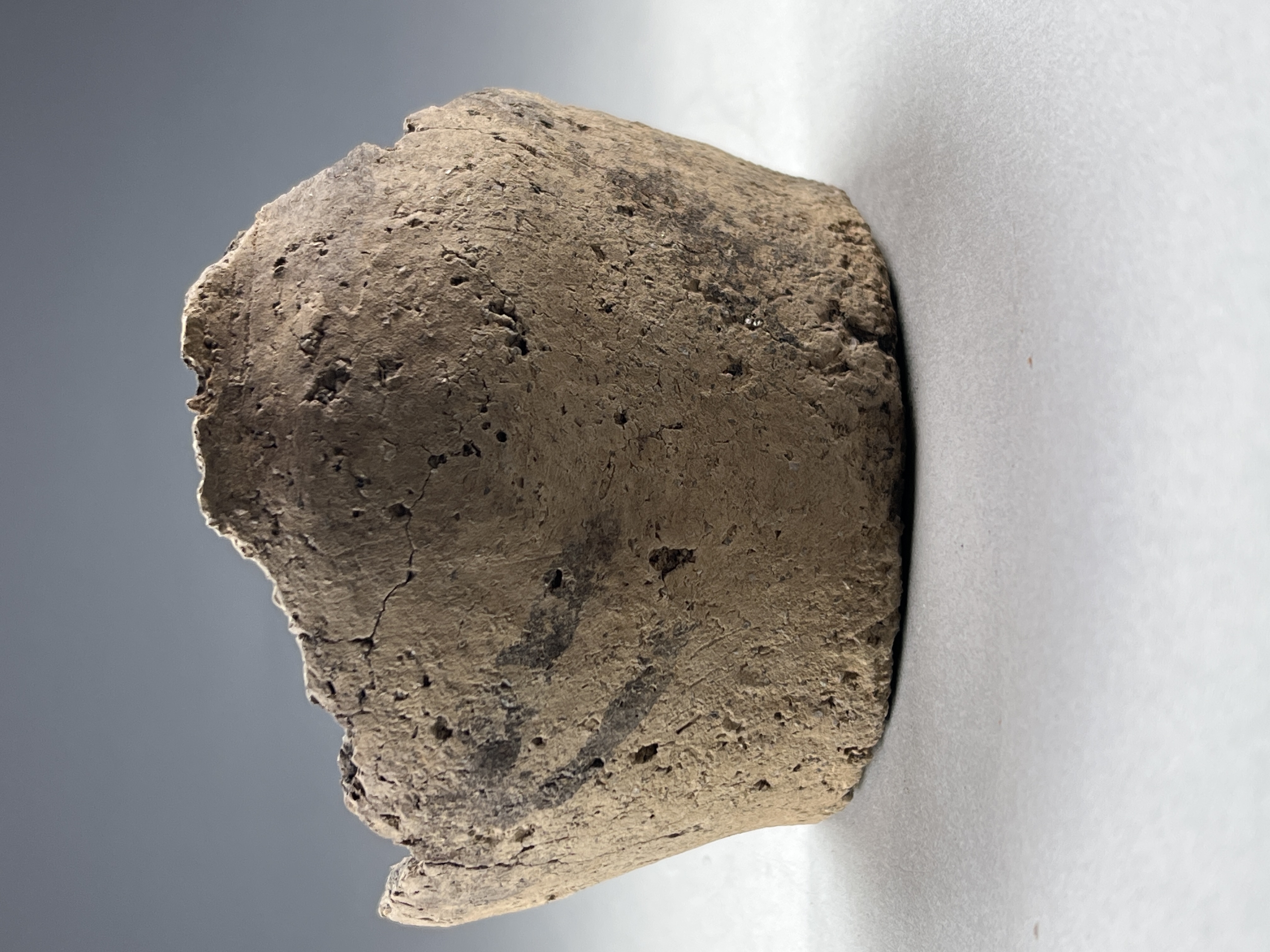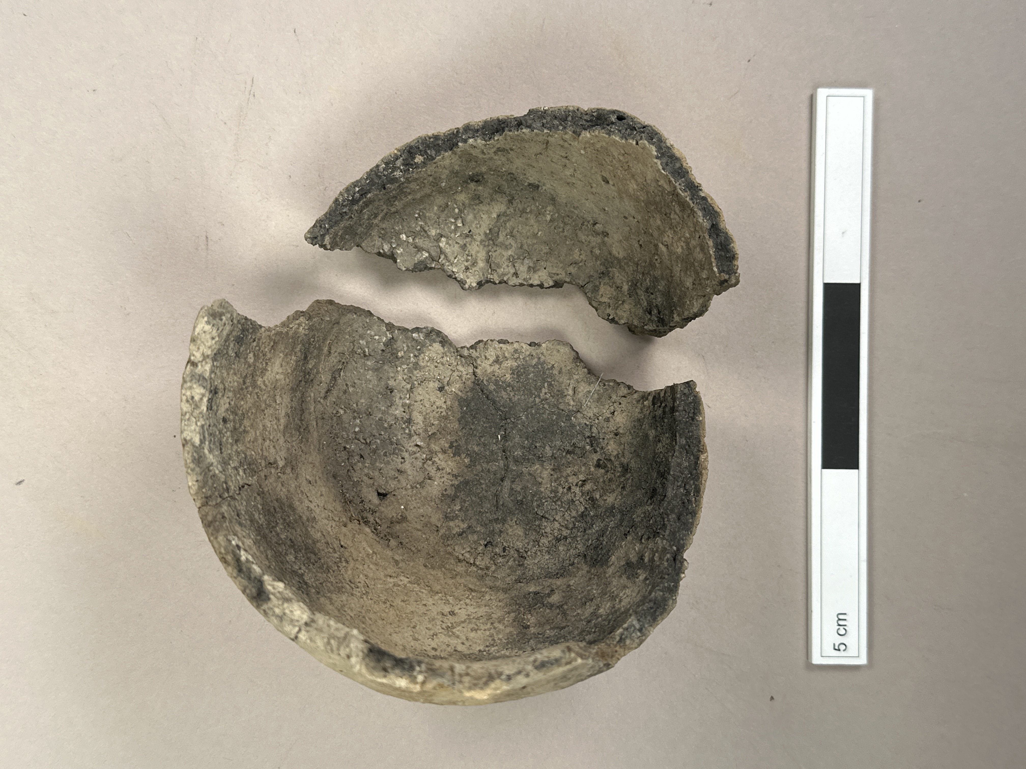 Gråbrunt gods med inåtböjd mynning, bottendiameter 10 cm