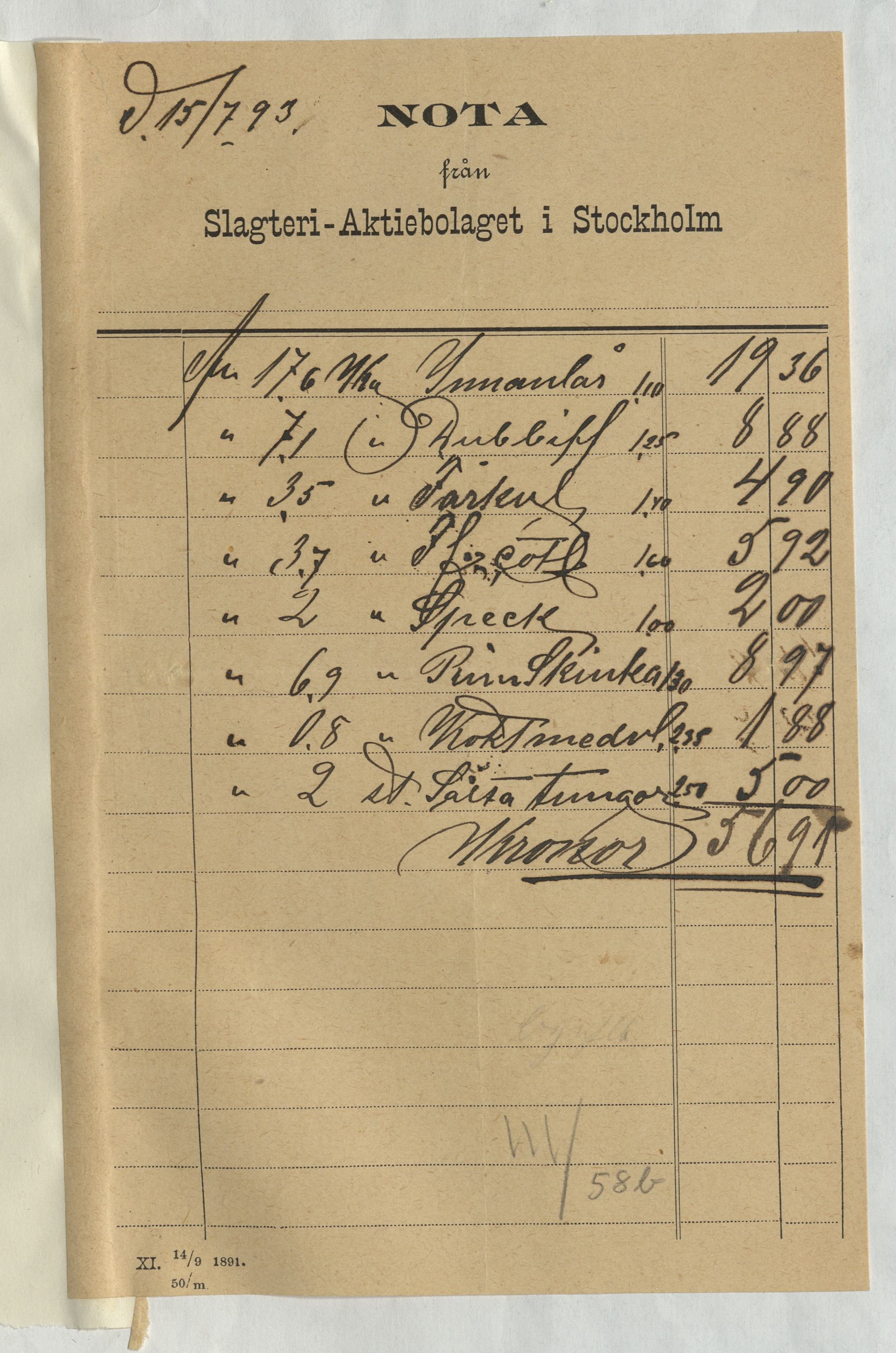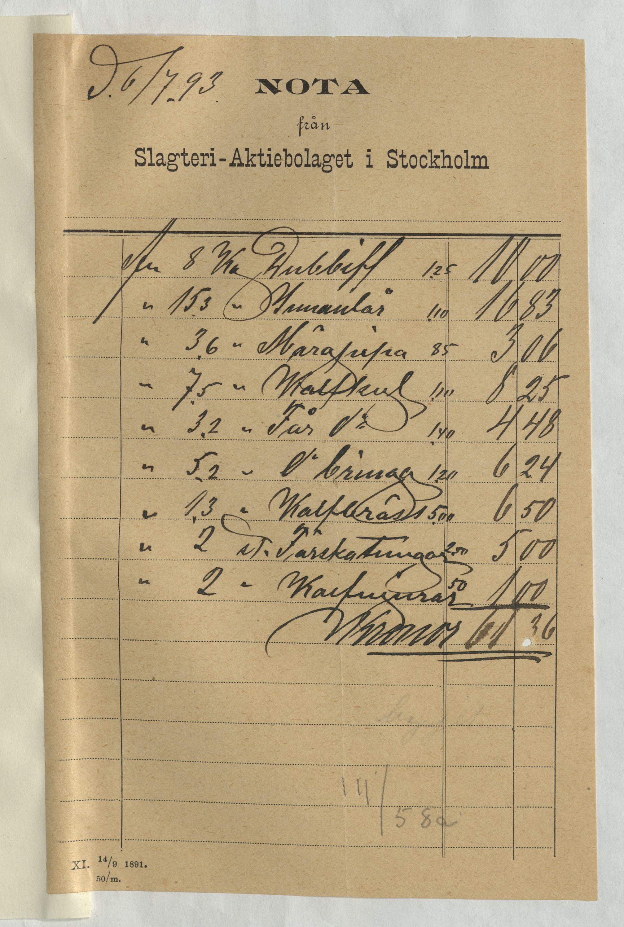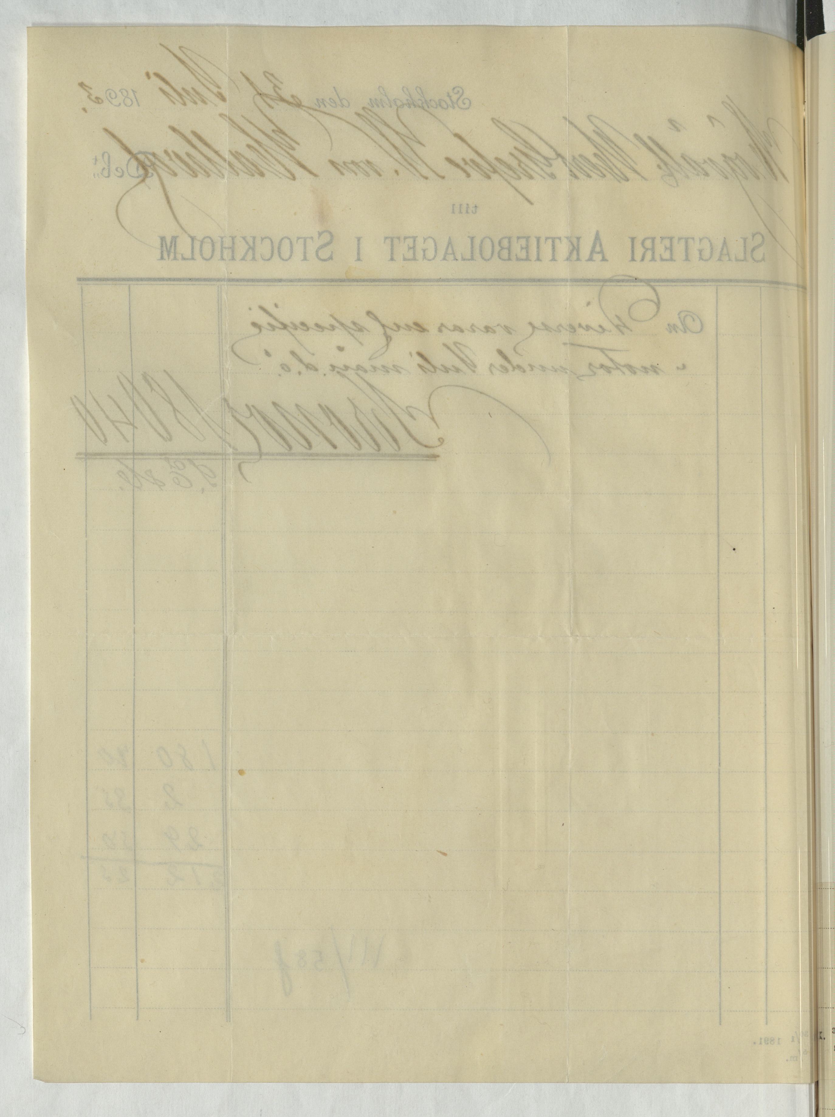 Kvitto från Slagteri Aktiebolaget i Stockholm