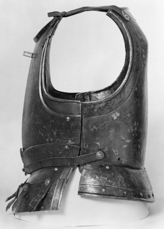 Driven stålplåt med på utsidan rankdekor av påslaget guld mot mörk botten. Insidan brunaktig med tydliga hammarslag. Sammanlagt två delar. Rundad vid nacken med 10 mm hög kant. Rundade urtagningar för armarna. Drivna mindre bulor över skuldrorna och försänkt parti mellan dem. Nedåt avsmalnande och inåt böjda sidor. I främre kanterna förlängningar av nitade och smidda skenor, b höger 40, b vänster 36 mm. Nertill en mindre krage, b 10 mm, vinklad utåt 45 grader. Över kragen och fästad i denna en kraftig 82 mm bred ländskena. Nitad i sidorna. Vid sidan om nitarna ett nyckelhålsformat hakhål, dvs skenan var ursprungligen löstagbar. Nackens, armhålornas och ländskenans kanter omvikta, rundsmidda med filade snedställda linjer. Över axlarna nitade läderremmar med blanka hjärtformiga brickor. Nertill i sidorna läderremmar, den vänstra med sölja i änden. Dekor: Blånerad yta med skrafferade partier med påslaget guld och silver i form av slingrande rankor och blommor. Över och genom detta mönster löper slingor av punsade och guldfyllda prickar. Längs nacken, armhålorna och ländskenans nedre kant löper en försänkt bård med etsad och förgylld dekor av bladverk. I ländskenans bård dekorativa nitar i rad.