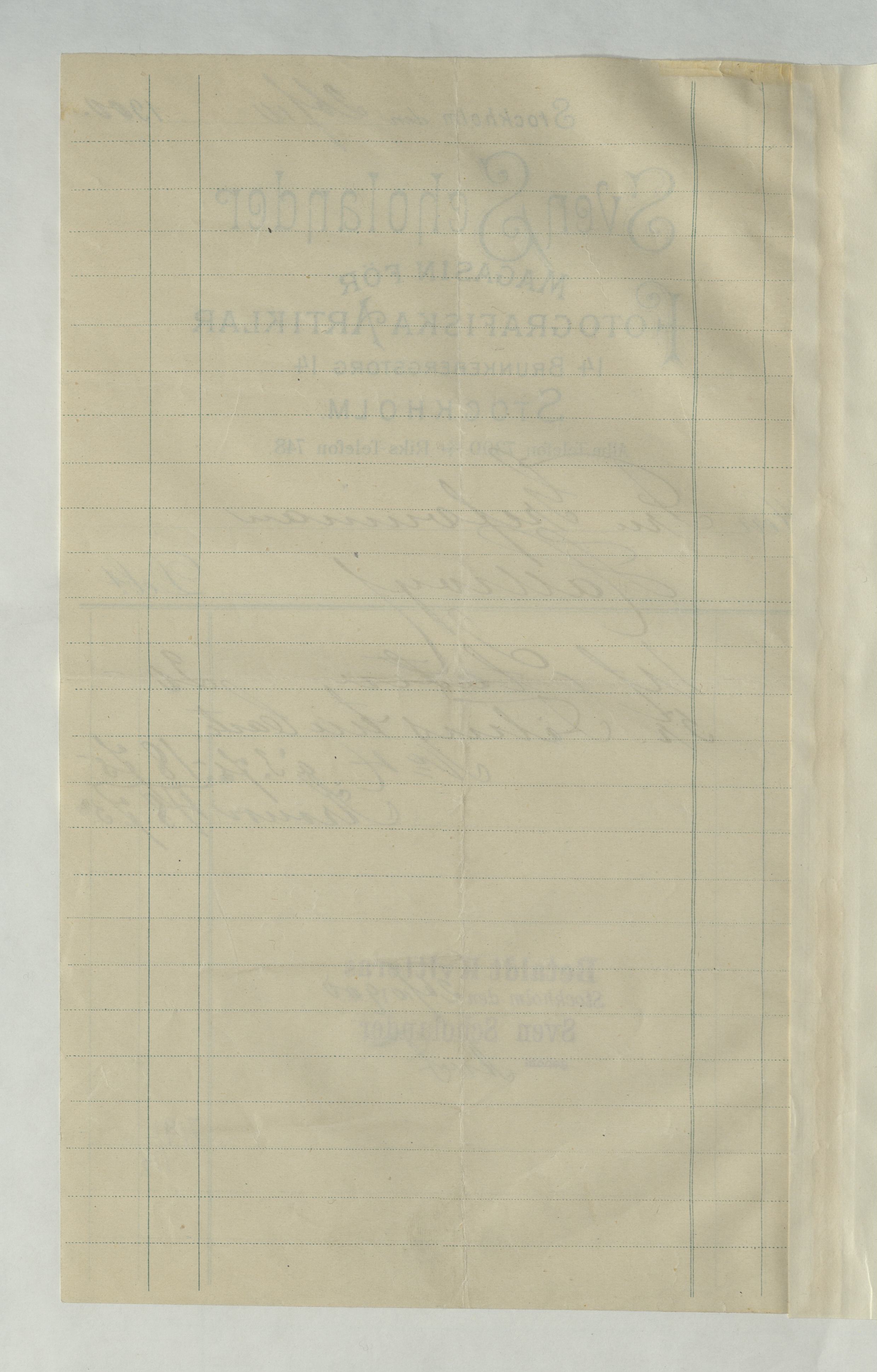 Kvitto från Sven Scholander, Bildhuggeriaffär för fotografiska artiklar