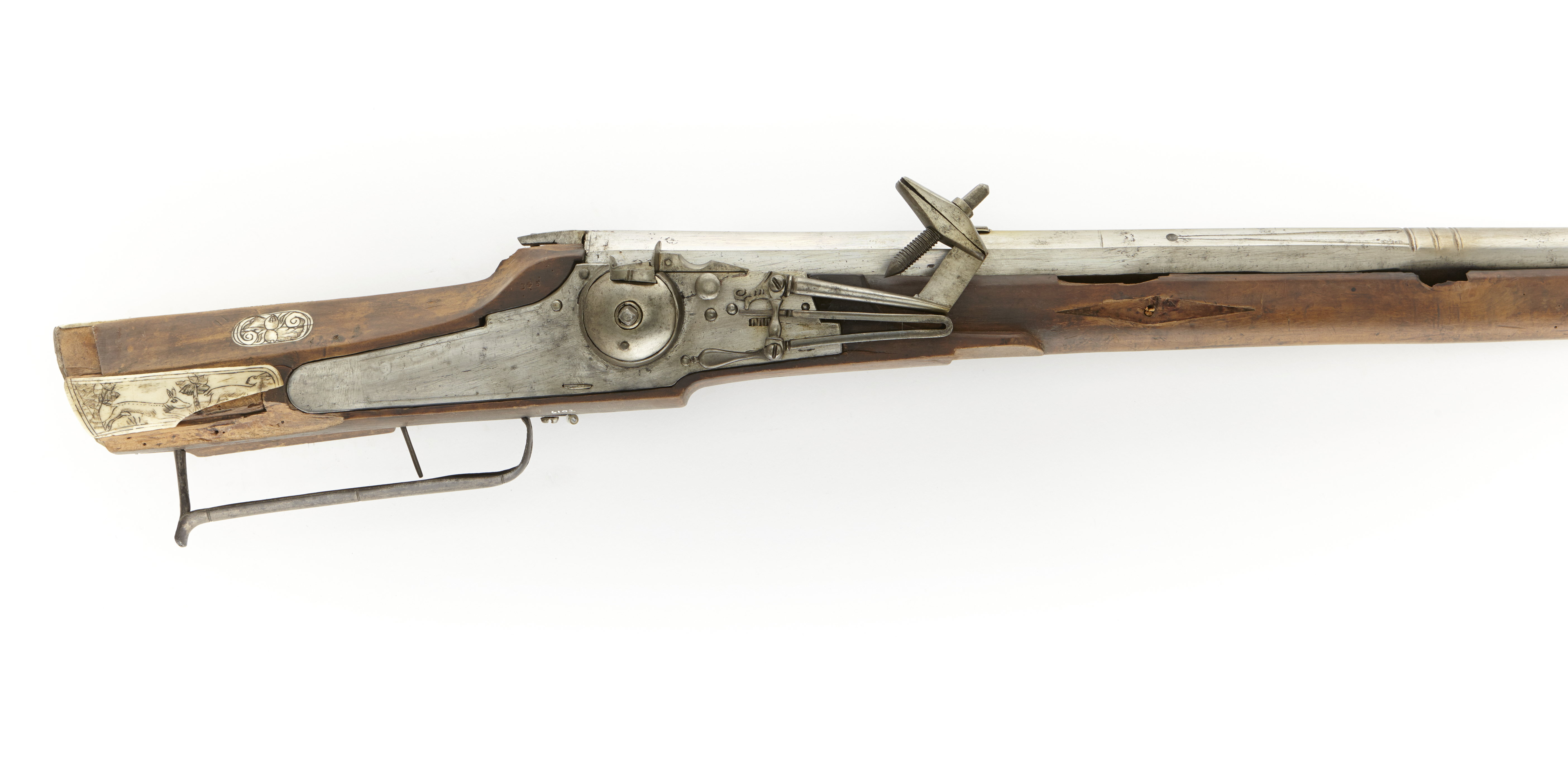 Rund, över kammaren åttkantig tornpipa av stål. Slätborrad. På kammaren stämpel med "CK" över halvmåne och stjärna (Stöckel nr 2217,Thyringen? ca 1615). Ståndsikte av stål, knoppkorn av stål. På pipans undersida stämpel med fågel (liknar Stöckel nr 4958). Tre piphäften. Hjullås. Blånerat låsbleck av tysk typ, bakåt avsmalnande genom två fall. Kullrig hjulkapsel, fasthållen med ring. Låg, vertikal krutskärm. Hane med stora käkar, den undre lös. Utan fingergrepp. Hel stock av brunt trä, tysk kolvtyp. Sluten laddstocksränna. Bakplåt av horn. Kolvlådelocket av ben med graverad hund jagande hare. På anslaget trapetsformig benplatta med samma motiv. Kolvryggens bakre del med graverat flätband. Två låsskruvar med runda benbrickor. Pipstiften med brickor i form av rombiska benplattor. Trågformig s.k. holsteinsk varbygel. Tillbehör : Laddstock. Märkt : 345 ovanför låsblecket, stanstyp 5376, 1710 års inventarium p. 13, rum II: "47-345-1 Stoor Hacke något beensatt. 2ne Hundar och een Hare på Anslaget".