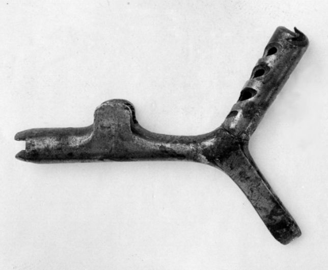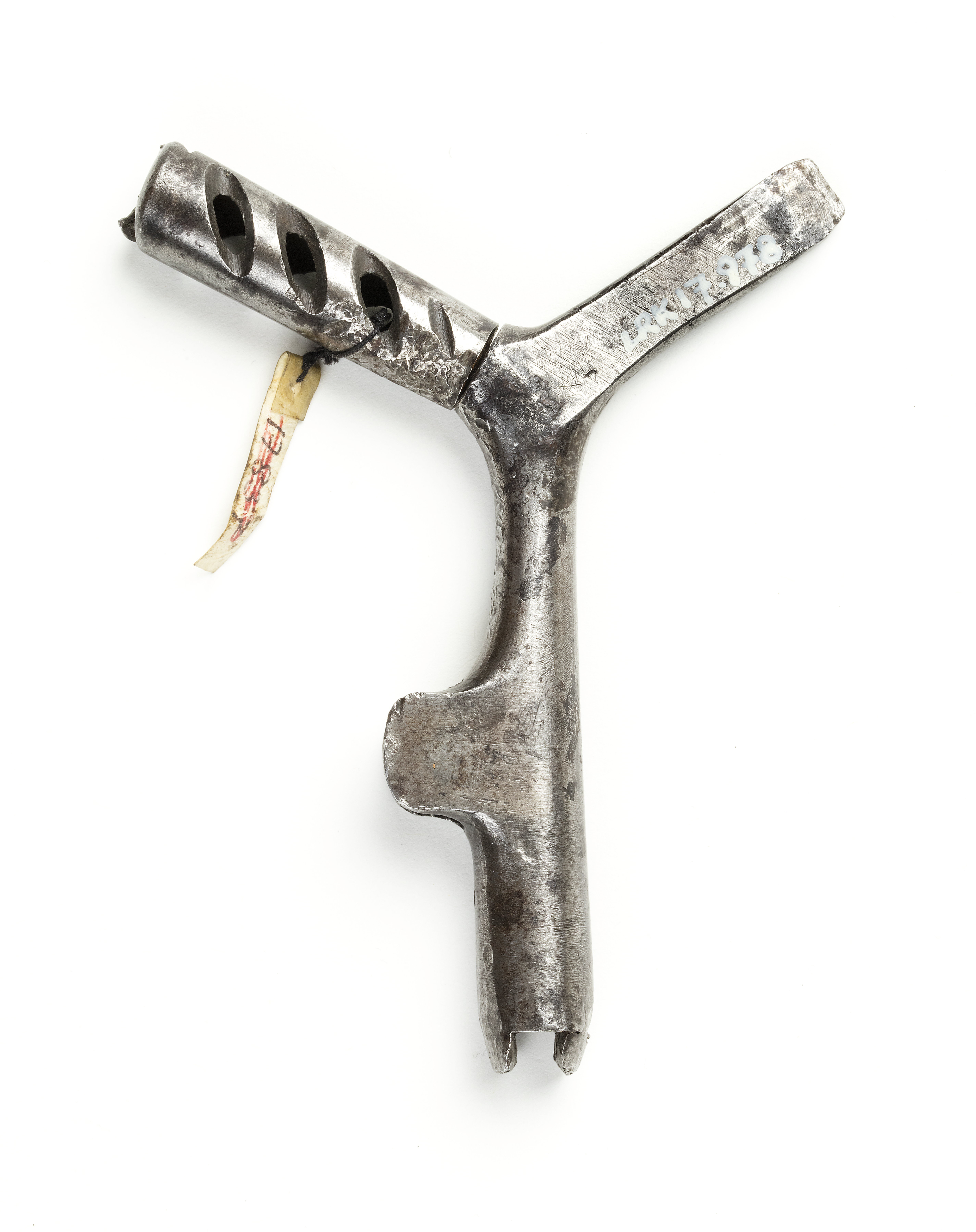 Y-formigt verktyg i två delar. En del i trubbig vinkel där den korta delen avslutas av skruvmejsel. Den längre delen avslutas med en rörformig nyckel med ett runt hål på änden och två utskjutande grepplattor. Mitt på den långa delens ena sida två utskjutande klackar med räfflade insidor. På vinkeln skruvat Y:ets tredje stapel i form av en krats med en gängad tapp på änden, korta, svagt utskjutande klor. I sidorna infilade två grupper om tre ovala, snedställda hål samt vid tappen ytterligare en grund, icke genombruten filning.
