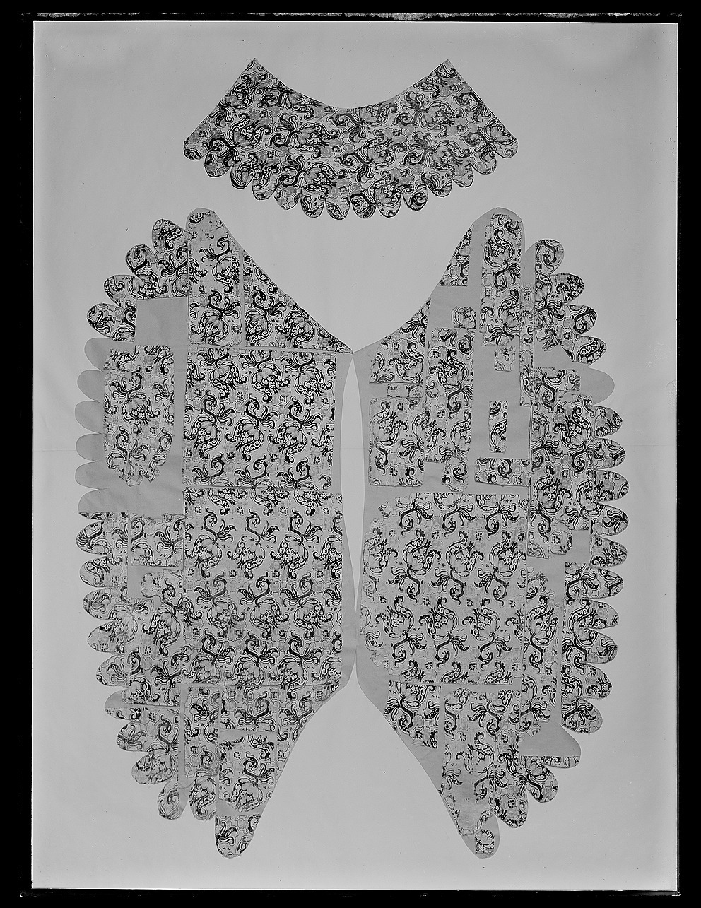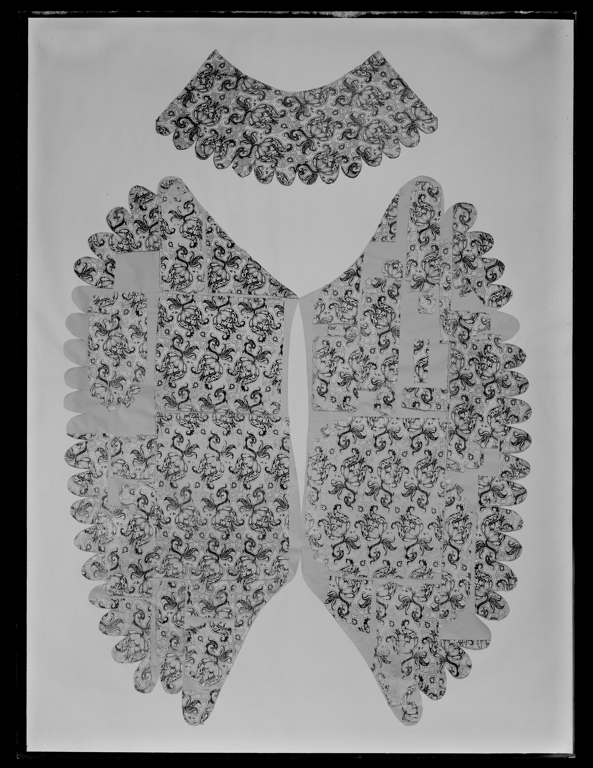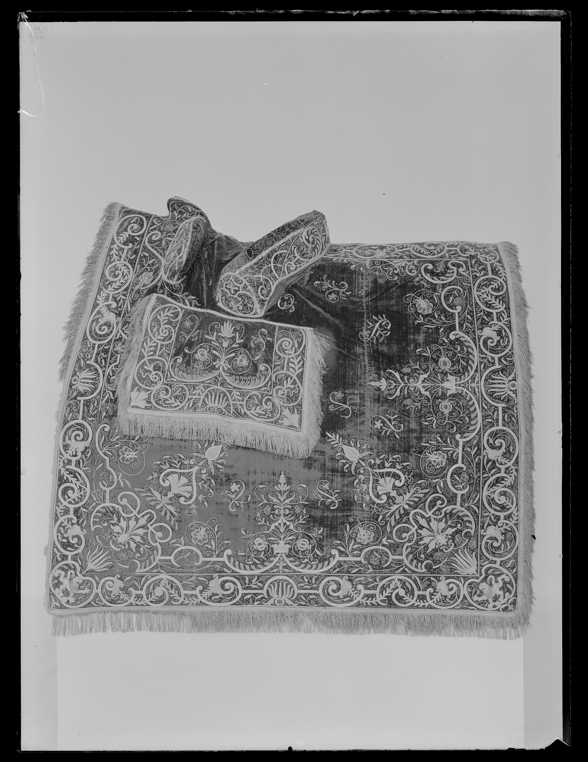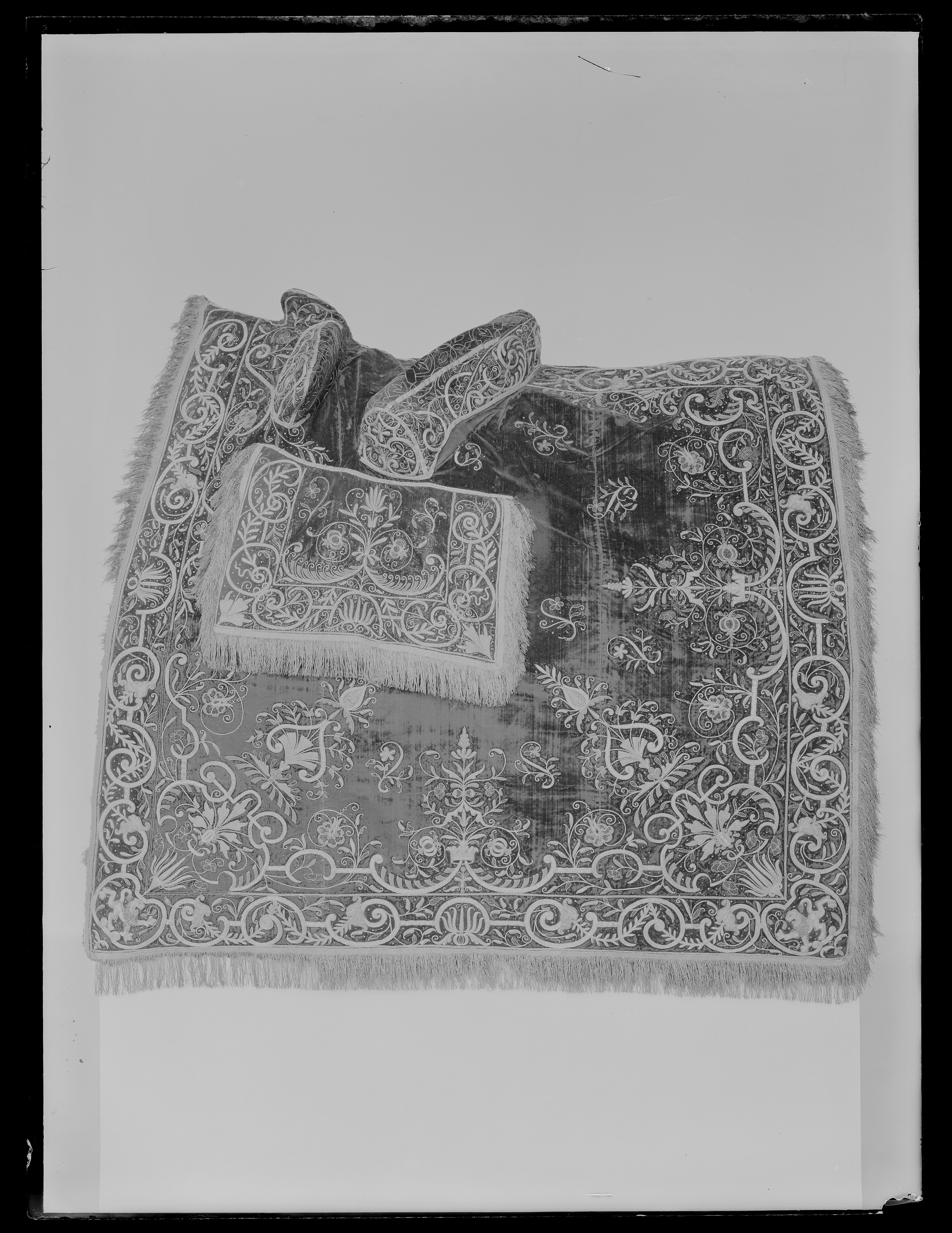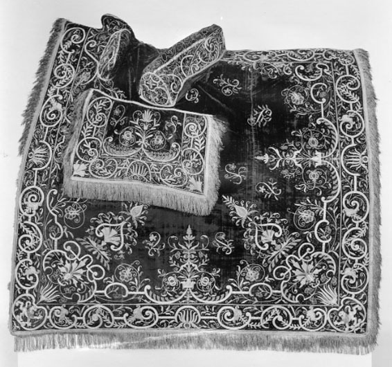 - Sahl: Konungh Gustaff Adolph haffwer inbestelt medh Jubileraren Bastian Leile, ett kosteligit footsidt tecke aff taneet brunt oskurit sammeet medh perlestickadt arbeete, samme tecke medh taneetbrunt atlask underfodrat, der till är ett tygh aff taneetbrunt sameet och perlestickadt arbeete medh förgylt messingzbeslagh. deraff Ryggestycket bortkommit i brandet.