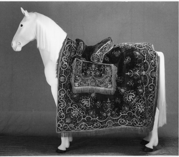 - Ett Huus, eller Sadell-Täcke af Tunt brunt oskurit Sammet, med Guld, Pärlestickare arbete, helt öfwer Brodderat, och runt omkring besatt med Guld och Silckes-Frantsar 4-fingers breda, uppå bemälte Täcke är fullkomligit Säte med Guld-Galoner utom Frantsar uppå, och Sadellkåpor med lijka Broddering ....