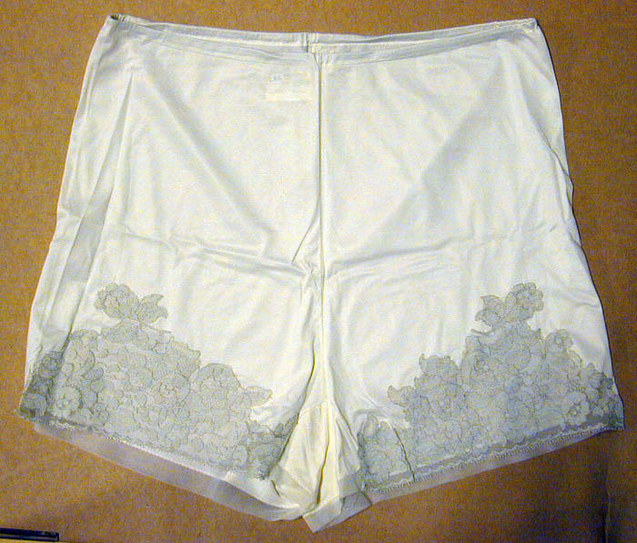 Benkläder med korta raka ben av vit charmensenylon. Vid nederkanten framtill på byxbeneninfällda trefärgade spetsar. Resor i midjan. I sömmen mitt bak firmaetikett: "SATINSVAVETTE // 53137 // 5 // MADE IN USA // Van Raalte // ALLNYLON". Samt fastsytt vittmonogram: "S".