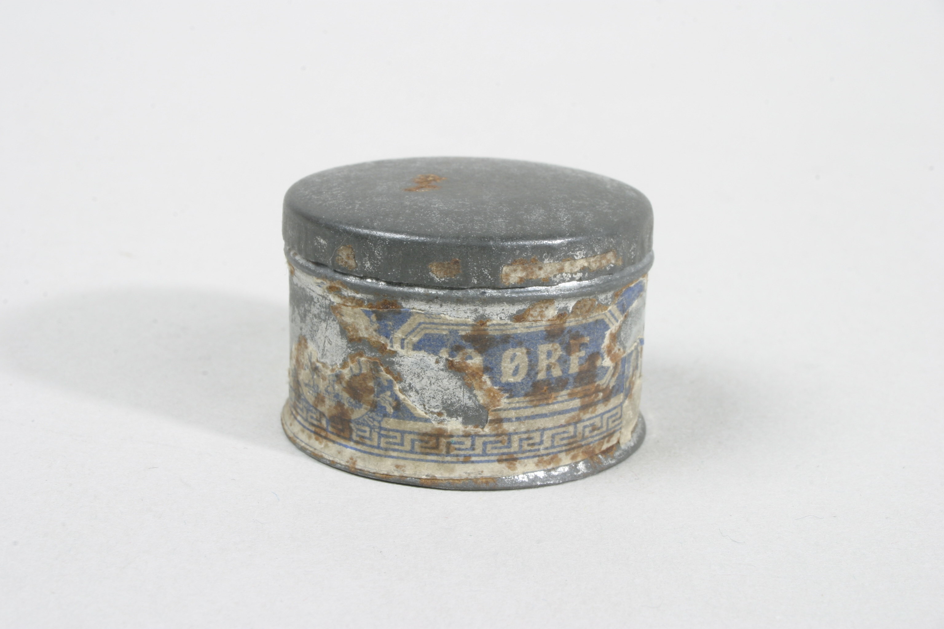Cylinderformad ask i metall med slätt, svagt kupigt lock. På asken rester av en etikett. I asken förvaras 9 kulor.