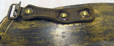 Välvd buckla, med övre och nedre kant spetsig. Inåt tvärt avslutad och utåt övergående i mussla, h 129 mm, oval med yttre kant svagt spetsig med försänkt mitt. Över musslan tre och under två mindre skenor. Nedersta med i var kant ett hakhål för benskenan. På bucklan fästad en rem med sölja resp. en rem, bägge av brunt läder.