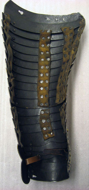 Övre del av 11 välvda skenor, nedåt minskande i bredd och svagt ökande djup. Översta skenans övre del svagt lutande inåt med åt utsidan ett nyckelhålsformat hakhål och mot insidan en nitad rem, l 190 mm, framför denna ett hål, diam 3 mm. Åt insidan en sämskad läderrem med sölja i änden. Fästad med två mässingsöverdragna nitar. Söljans ram rektangulär och slät med rester av förgyllning. I skenornas övre kant i mitten en utdragen låg spets. I sista skenan åt utsidan en vridbar tapp, i mitten en tapp och åt insidan en utstående nit.