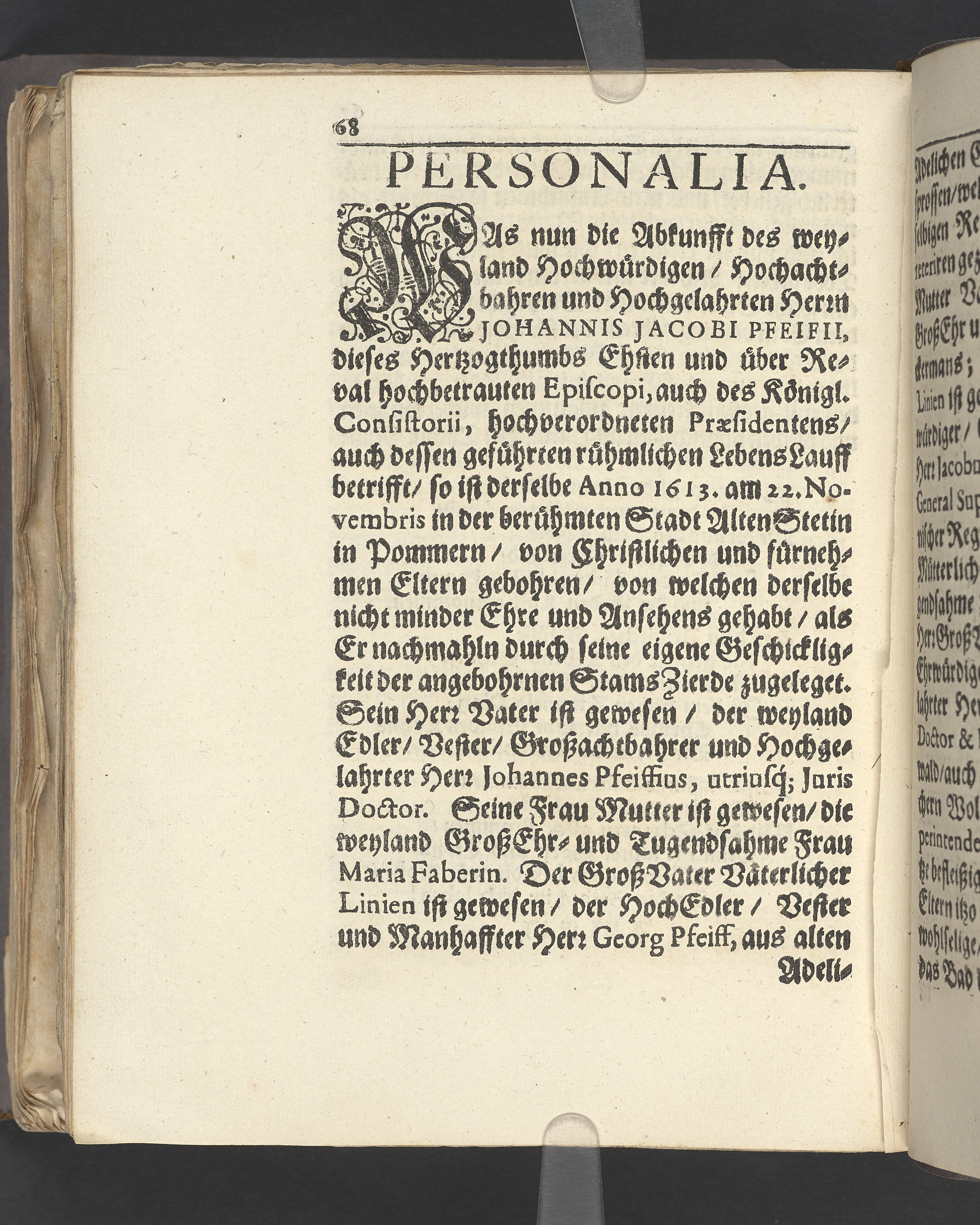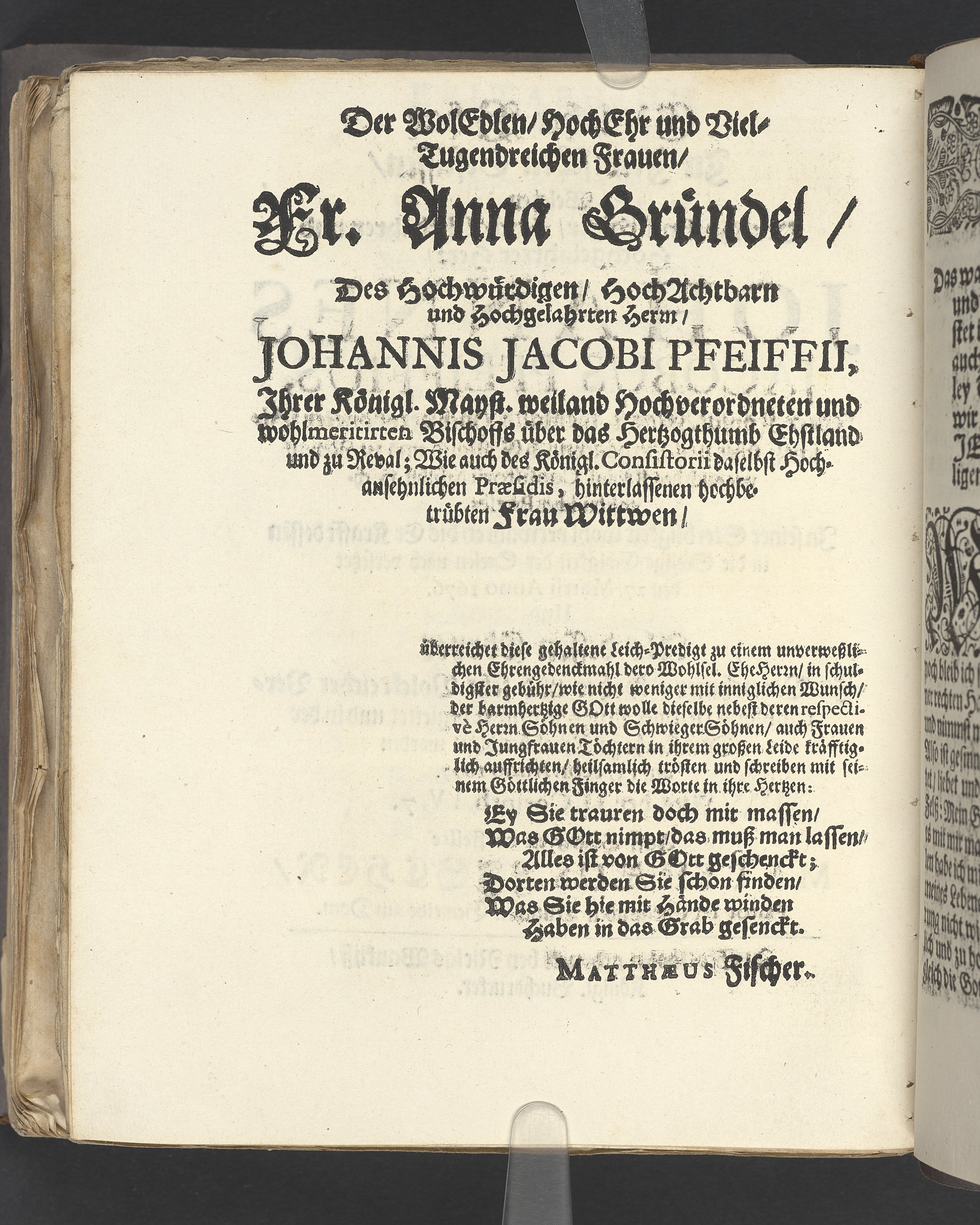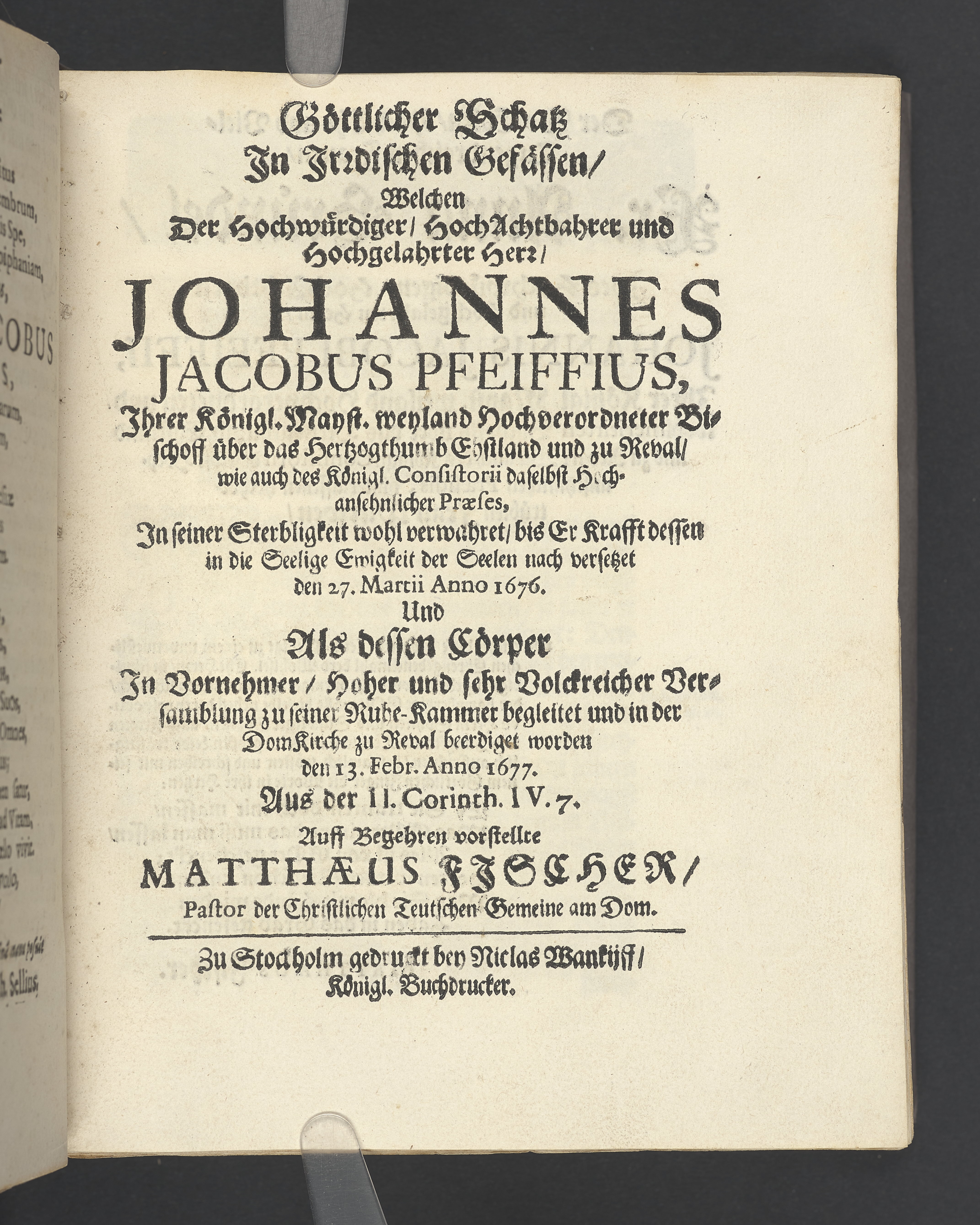 Göttlicher Schatz in irrdischen Gefässen, welchen ... Johannes Jacobus Pfeiffius ... Bischoff über das Hertzogthumb Eystland ... Als dessen Cörper ... zu Reval beerdiget worden den 13 febr. anno 1677 ... Auff Begehren vorstellte Matthæus Fischer ... Zu Stockholm gedruckt bey Niclas Wankijff.