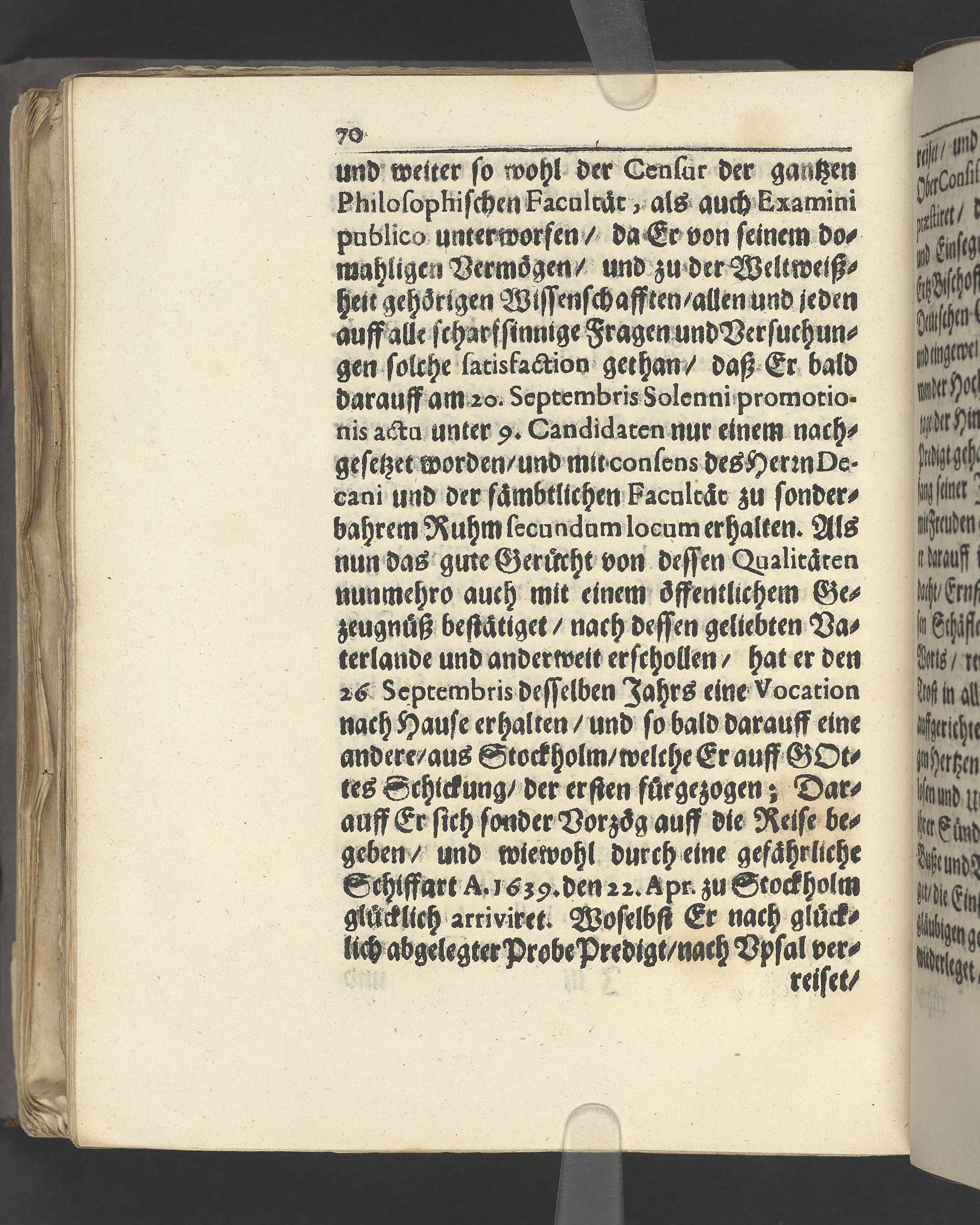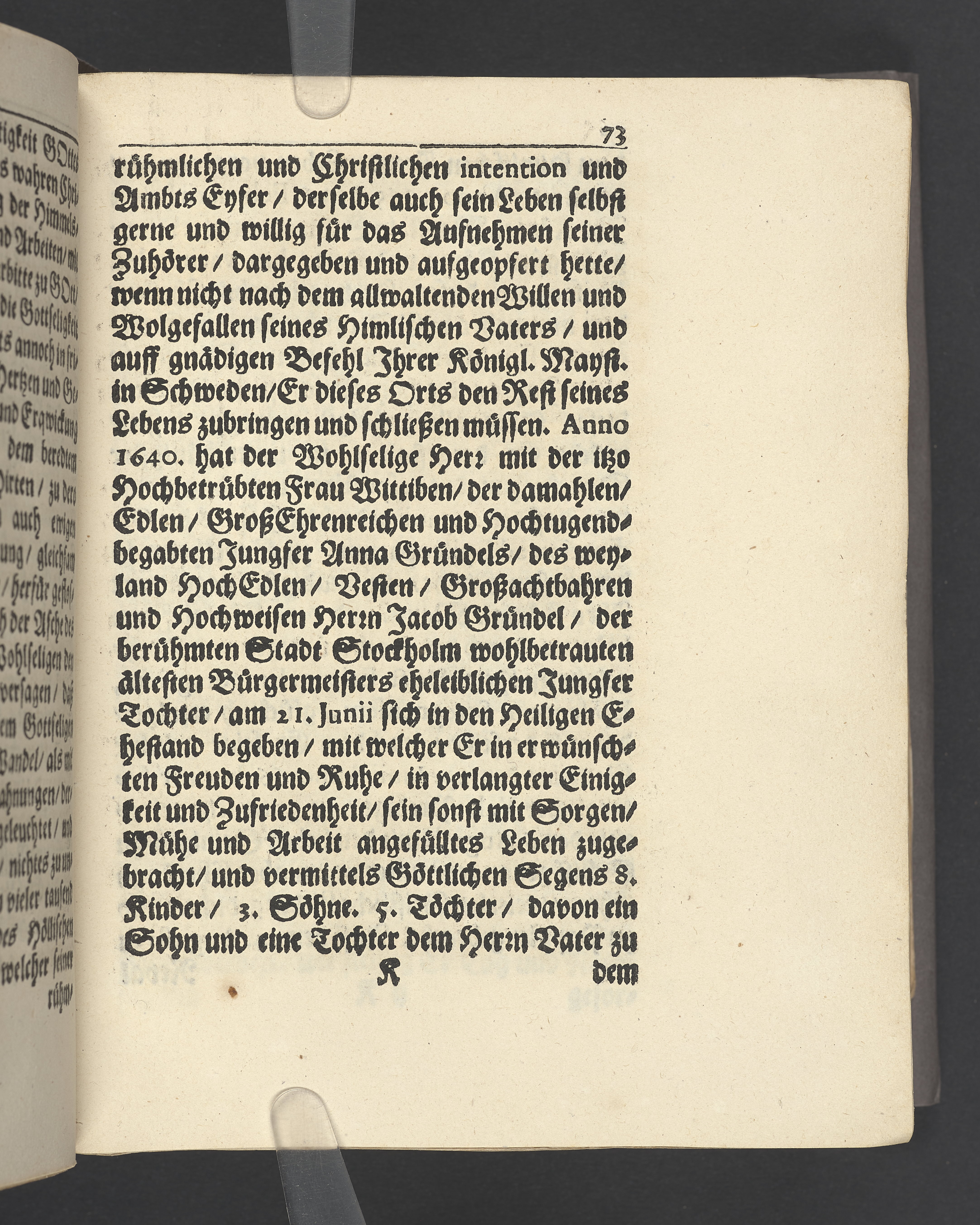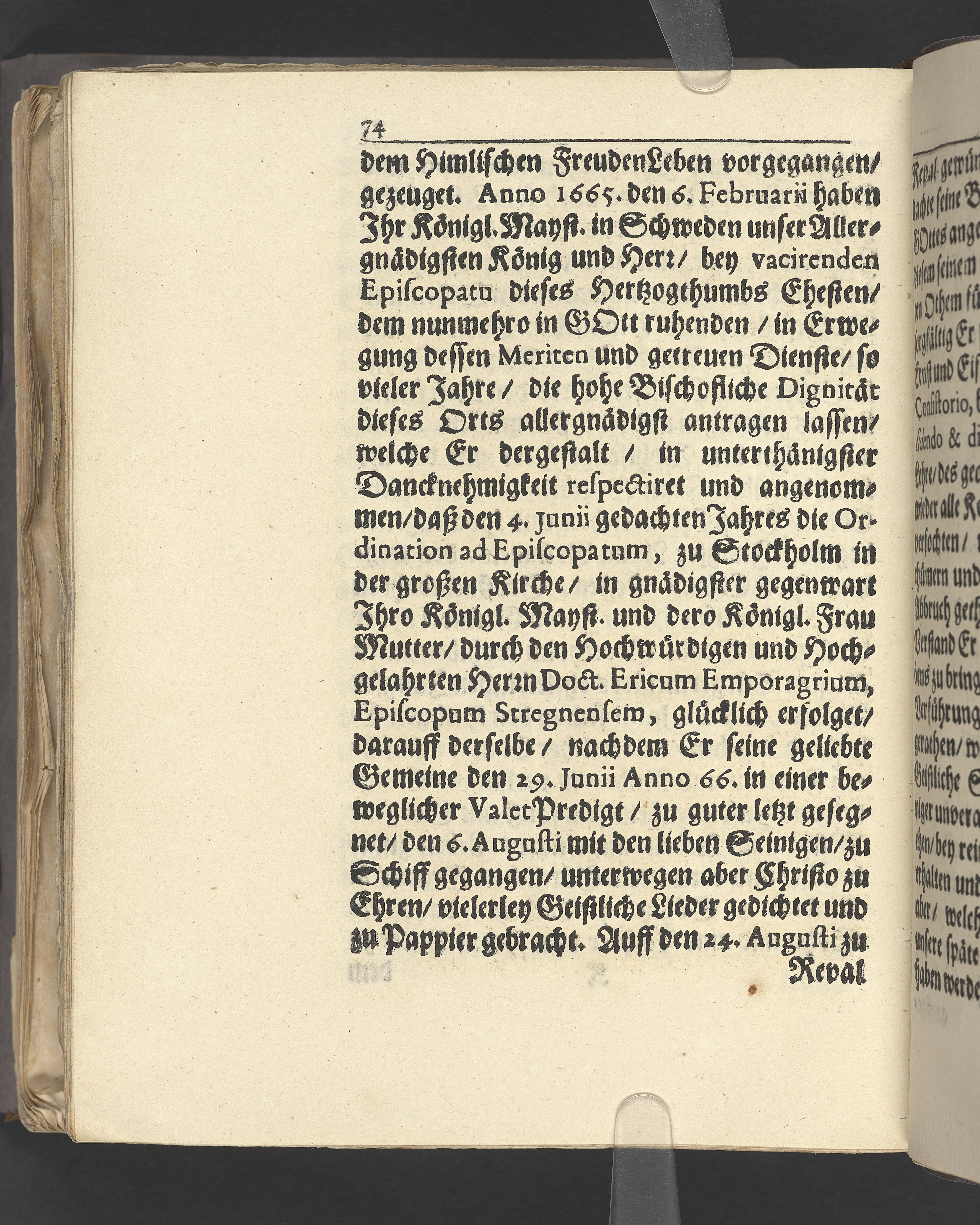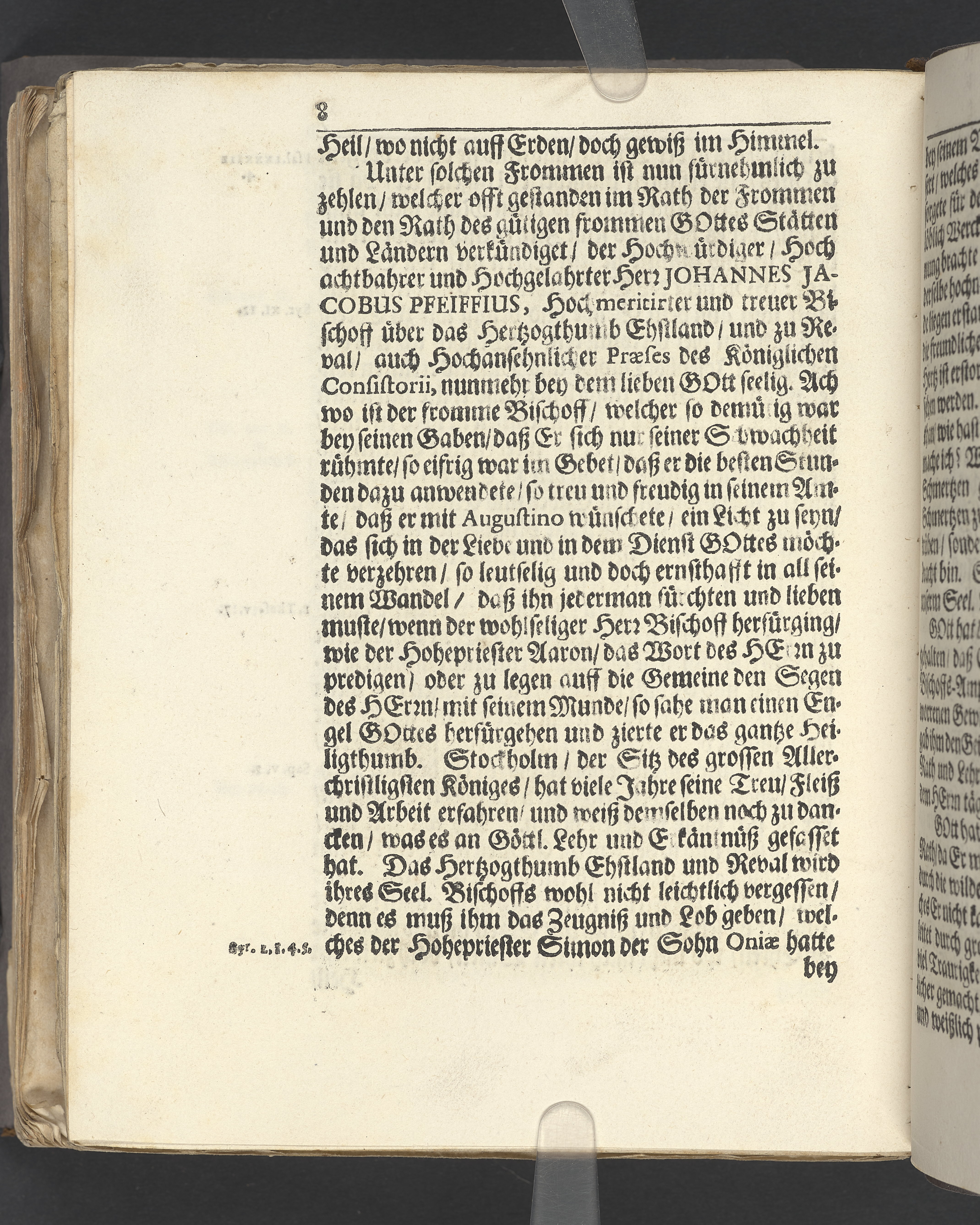 Göttlicher Schatz in irrdischen Gefässen, welchen ... Johannes Jacobus Pfeiffius ... Bischoff über das Hertzogthumb Eystland ... Als dessen Cörper ... zu Reval beerdiget worden den 13 febr. anno 1677 ... Auff Begehren vorstellte Matthæus Fischer ... Zu Stockholm gedruckt bey Niclas Wankijff.
