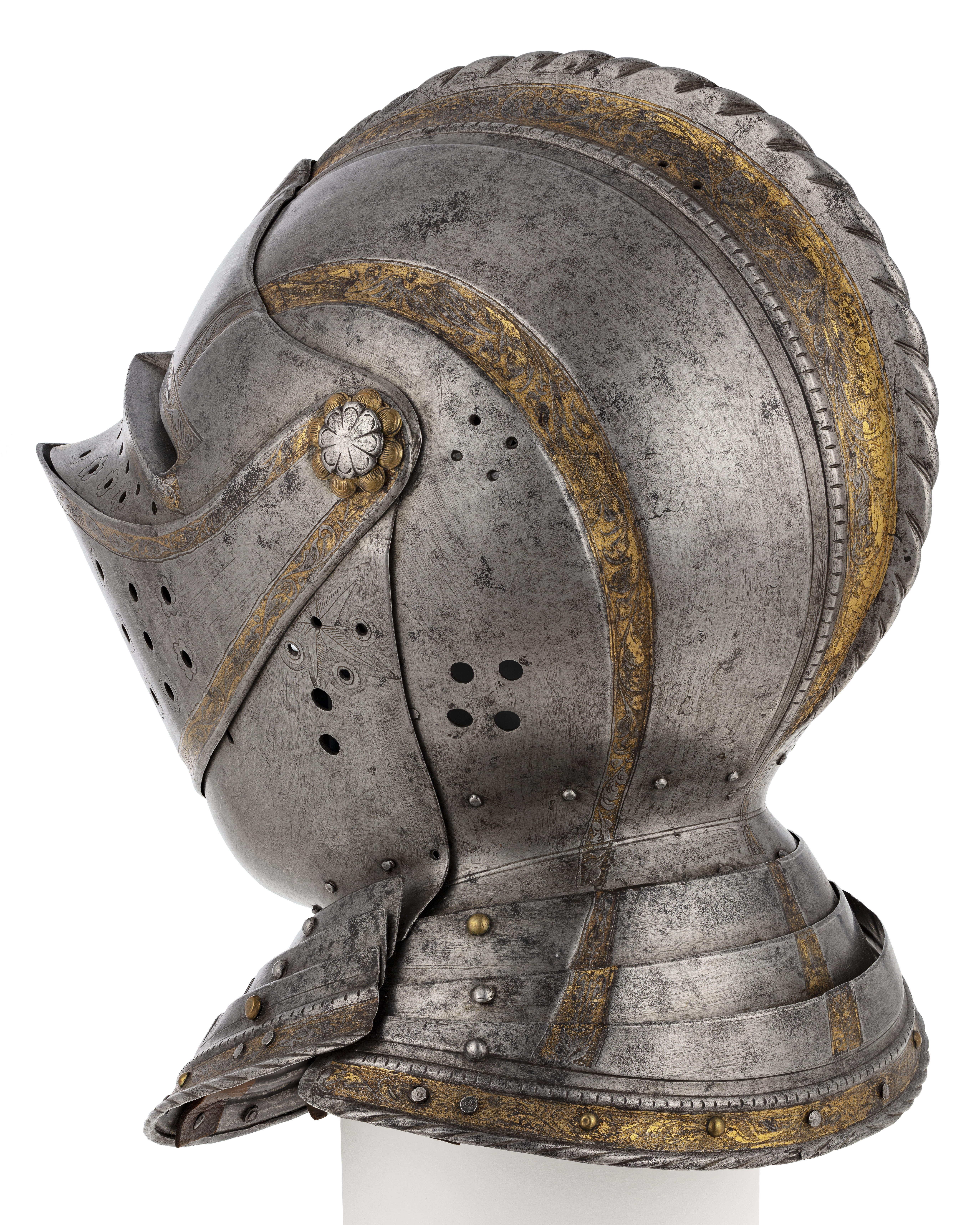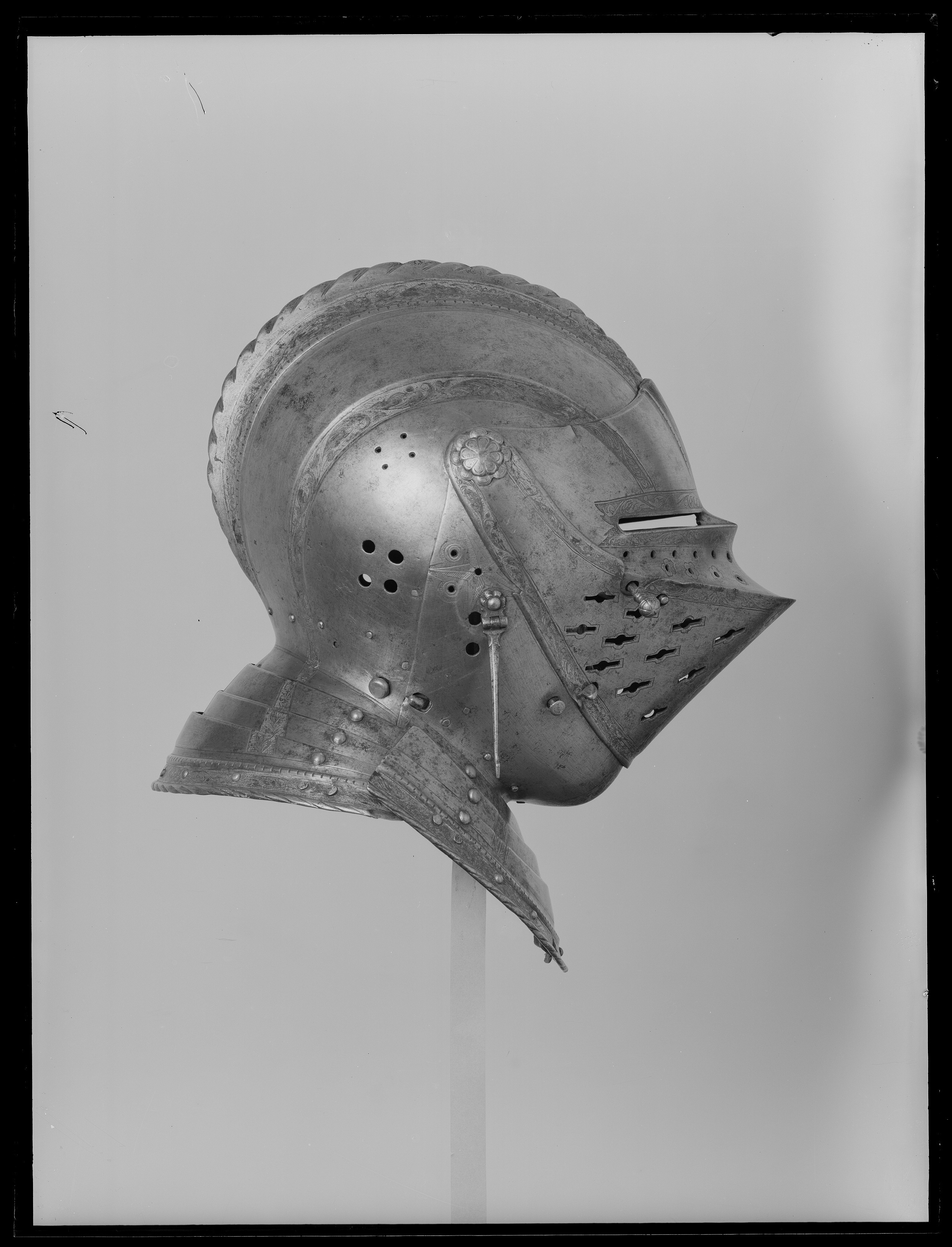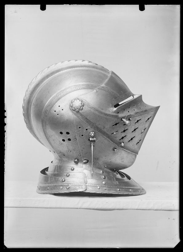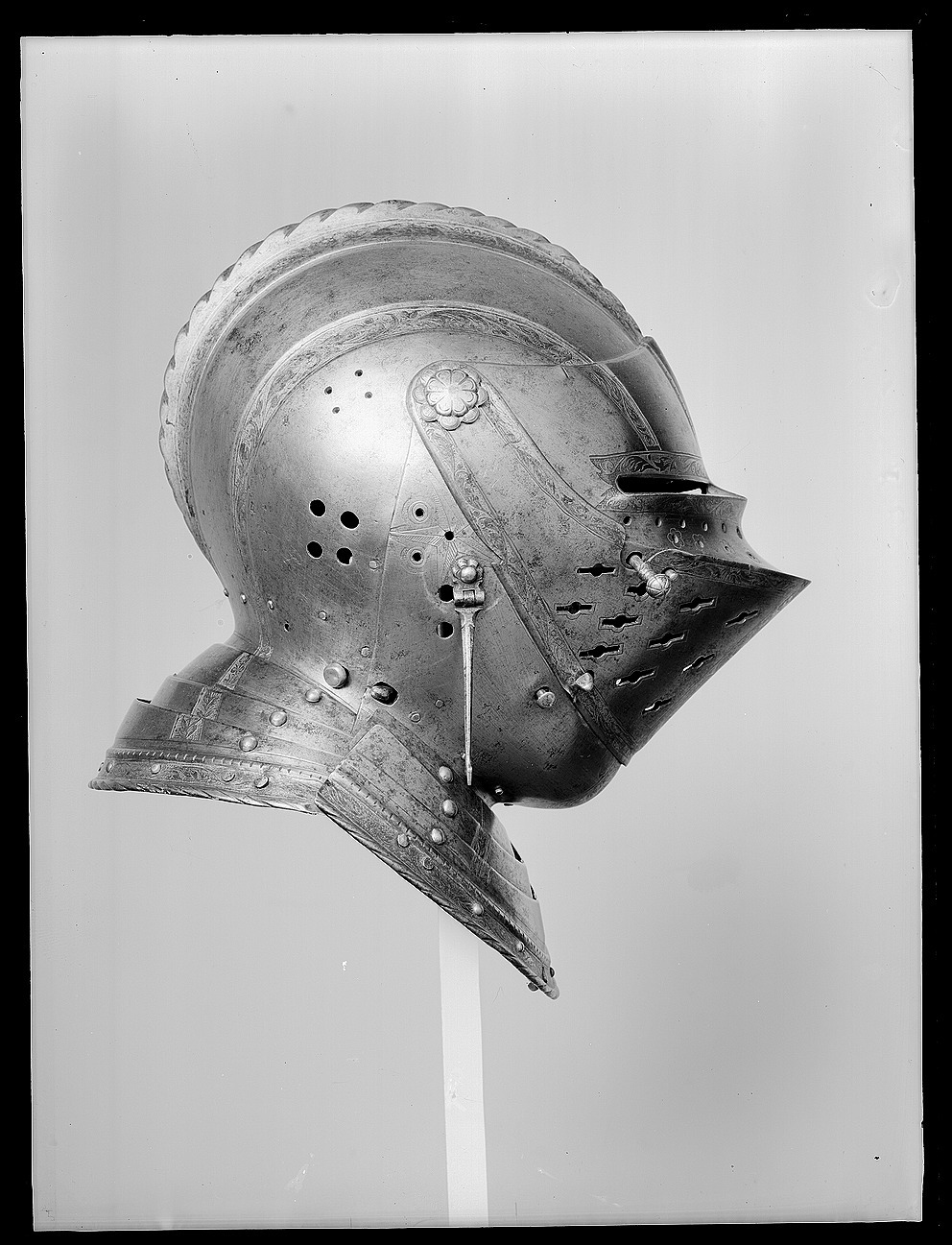 Hjälm bestående av klocka, visir i 3 delar samt på klocka och visir vardera 3 lameller. Visirdelarna rörliga runt axlar, täckta av dubbla, åttabladiga blommor, de större, yttre förgyllda. Hakvisirets spärr med fjädrande tryckknapp på h-sida, förgyllt mässingshuvud. Vid bakkanterna etsat femuddiga stjärnor. På h. sida dessutom vridbar, urspr. förgylld, arm med gångjärn. Näsvisirets dito men knappens förgyllda skålla saknas, genombrytning i form av 11 avlånga, fyrkantiga hål med runt mitthål på h. sida, etsad kantlinje. På v. sida 11 runda hål med kantlinje, sexbladig blomma. Ögonvisir med rektangulära siktöppningar, l: 95 mm, därnedanför sex runda hål i övre rad samt fyra dito med blomformig kantlinje nedanför. Spärr med hög, svarvad tryckknapp på h.sida. Utsparning i näsvisirets överkant. Klocka med snedräfflad mittås. Etsad, bandformig dekor med blanka rankor mot förgylld bakgrund. Band längs kammen, mitt på klockans båda sidor. Längs visirdelarnas mittås, runt siktöppningen, längs näsvisirets kanter, längs ytterlammellens kant samt på lamellerna vardera 3 lodräta band, baktill anslutande till klockans band, framtill enbart till mittbandet. Nithuvudena urspr. täckta av förgyllda mässingsskållor, 20 saknas.
