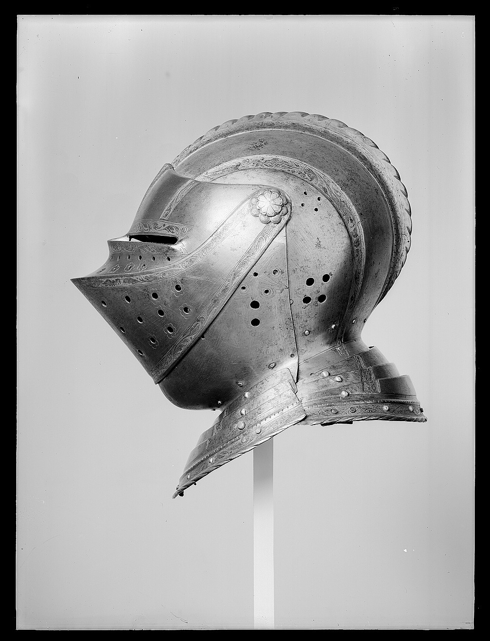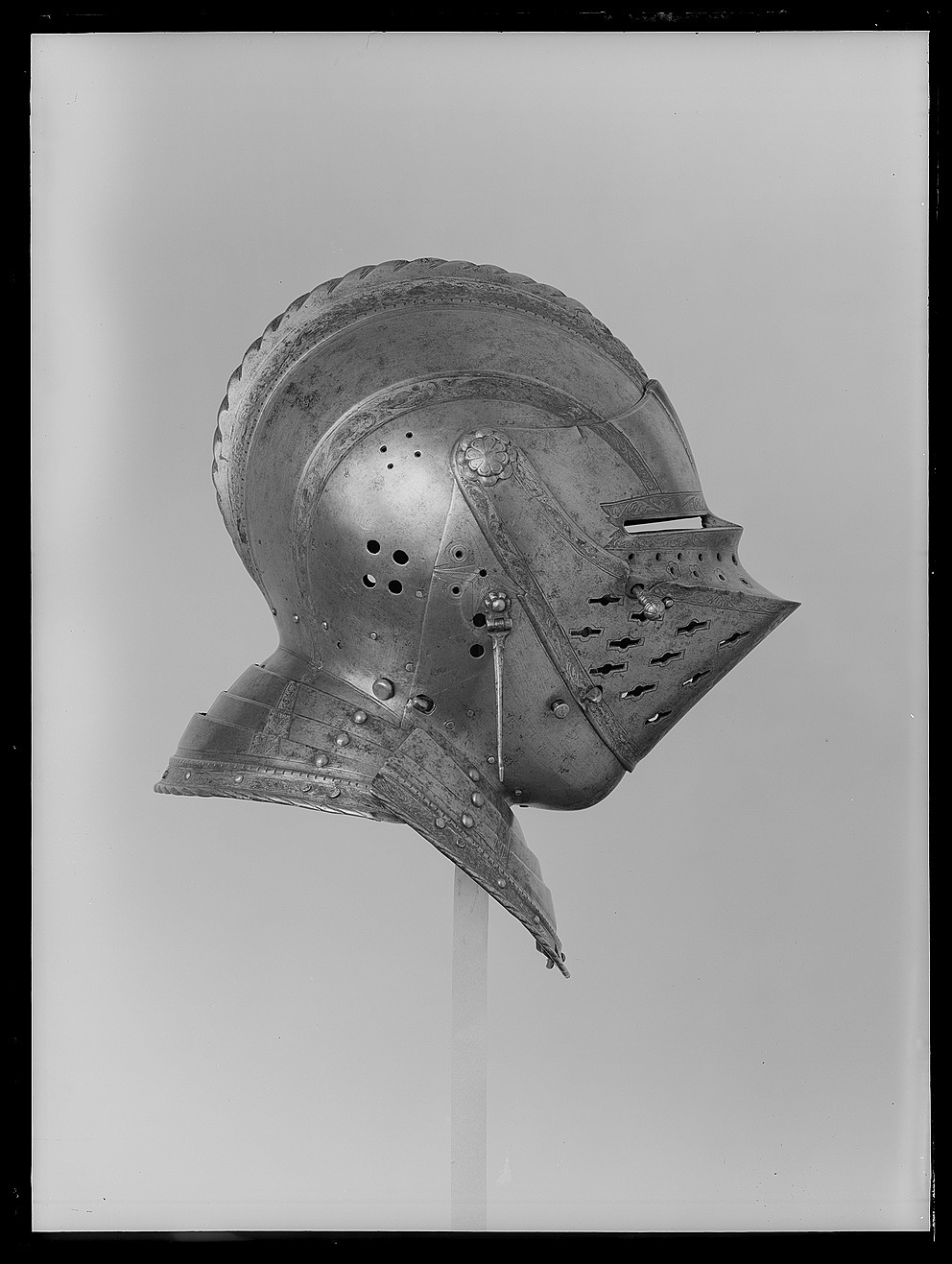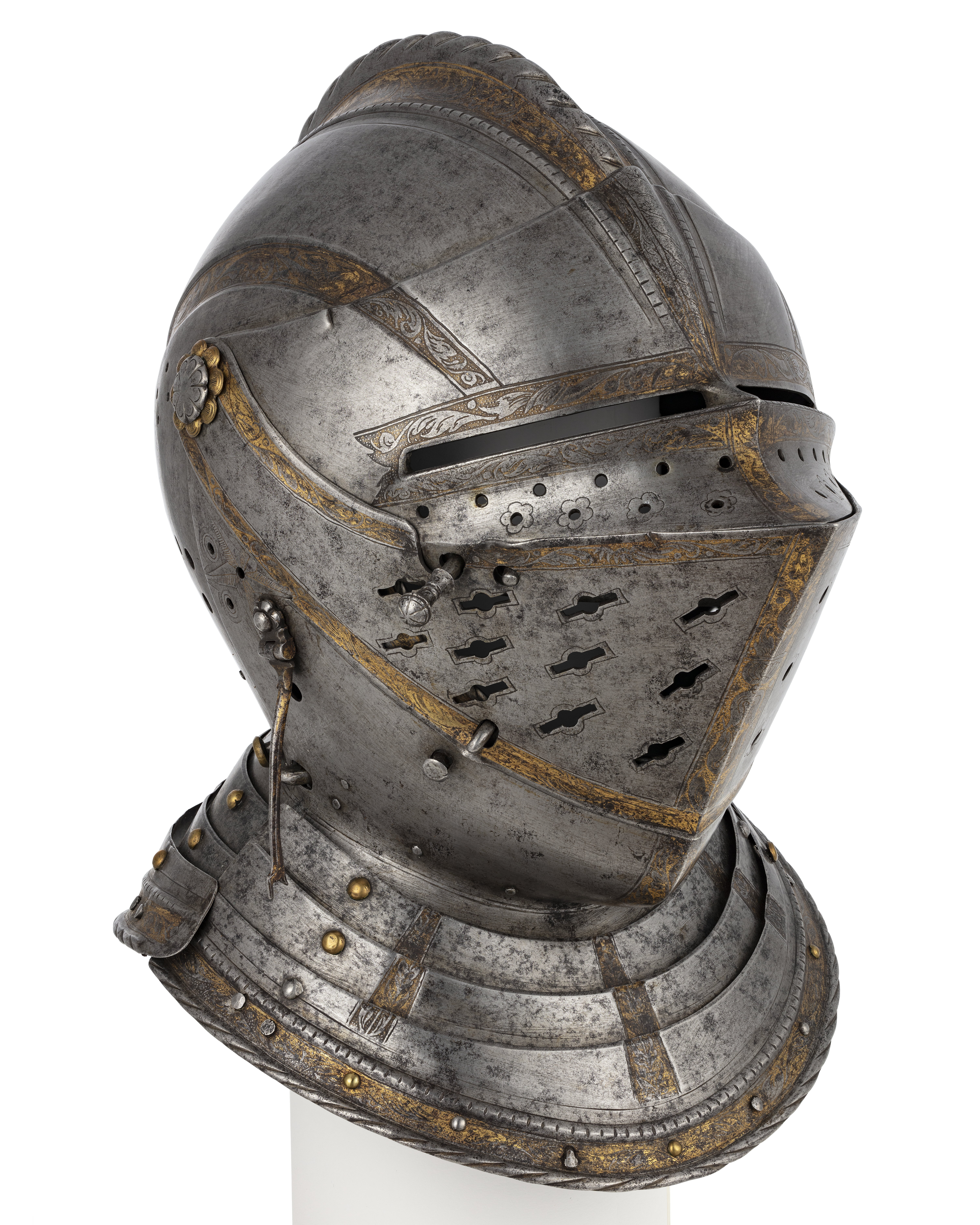 Hjälm bestående av klocka, visir i 3 delar samt på klocka och visir vardera 3 lameller. Visirdelarna rörliga runt axlar, täckta av dubbla, åttabladiga blommor, de större, yttre förgyllda. Hakvisirets spärr med fjädrande tryckknapp på h-sida, förgyllt mässingshuvud. Vid bakkanterna etsat femuddiga stjärnor. På h. sida dessutom vridbar, urspr. förgylld, arm med gångjärn. Näsvisirets dito men knappens förgyllda skålla saknas, genombrytning i form av 11 avlånga, fyrkantiga hål med runt mitthål på h. sida, etsad kantlinje. På v. sida 11 runda hål med kantlinje, sexbladig blomma. Ögonvisir med rektangulära siktöppningar, l: 95 mm, därnedanför sex runda hål i övre rad samt fyra dito med blomformig kantlinje nedanför. Spärr med hög, svarvad tryckknapp på h.sida. Utsparning i näsvisirets överkant. Klocka med snedräfflad mittås. Etsad, bandformig dekor med blanka rankor mot förgylld bakgrund. Band längs kammen, mitt på klockans båda sidor. Längs visirdelarnas mittås, runt siktöppningen, längs näsvisirets kanter, längs ytterlammellens kant samt på lamellerna vardera 3 lodräta band, baktill anslutande till klockans band, framtill enbart till mittbandet. Nithuvudena urspr. täckta av förgyllda mässingsskållor, 20 saknas.
