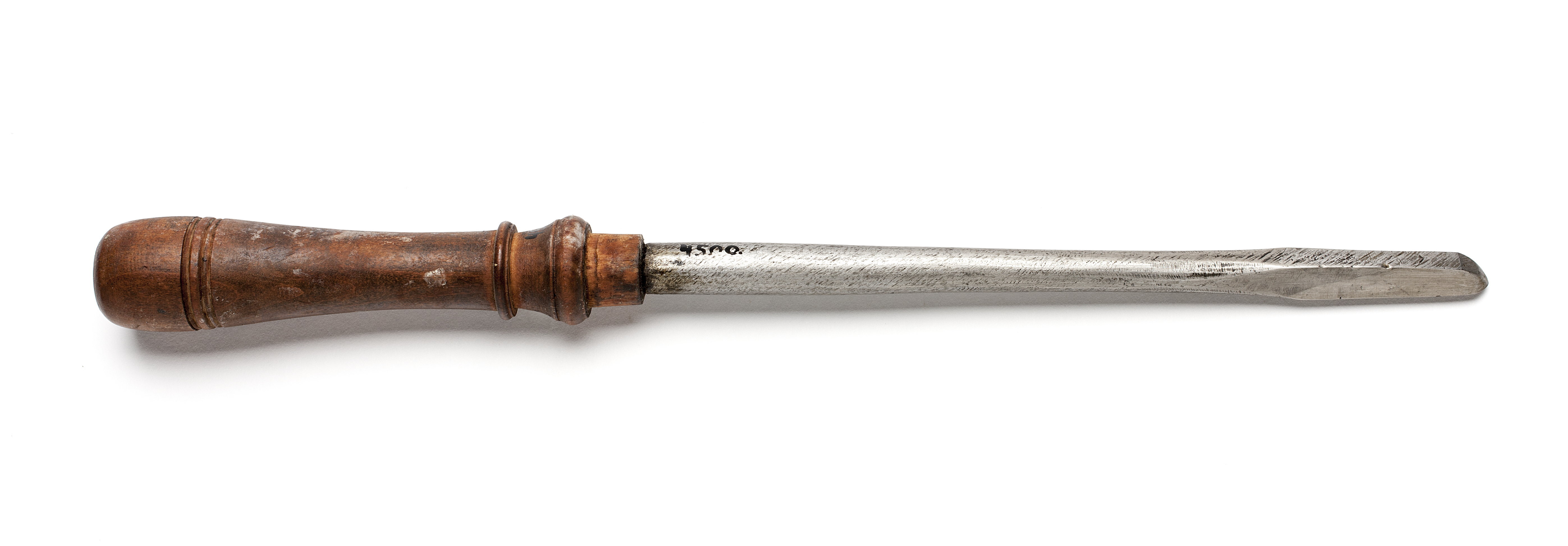 Rund klinga, i änden med rektangulär genomskärning. Stämplat på klingan: "EP". Svarvat skaft av päronträ, med två vulster nedtill ("rydboholmstyp").