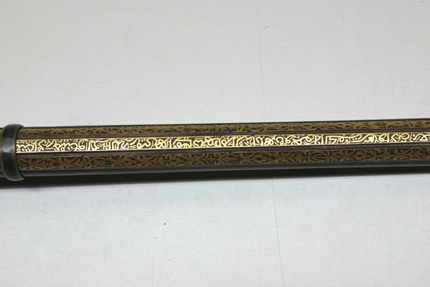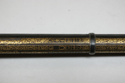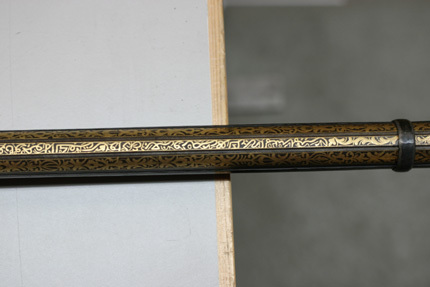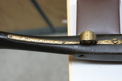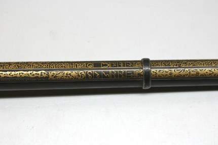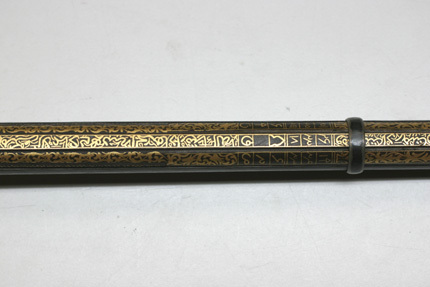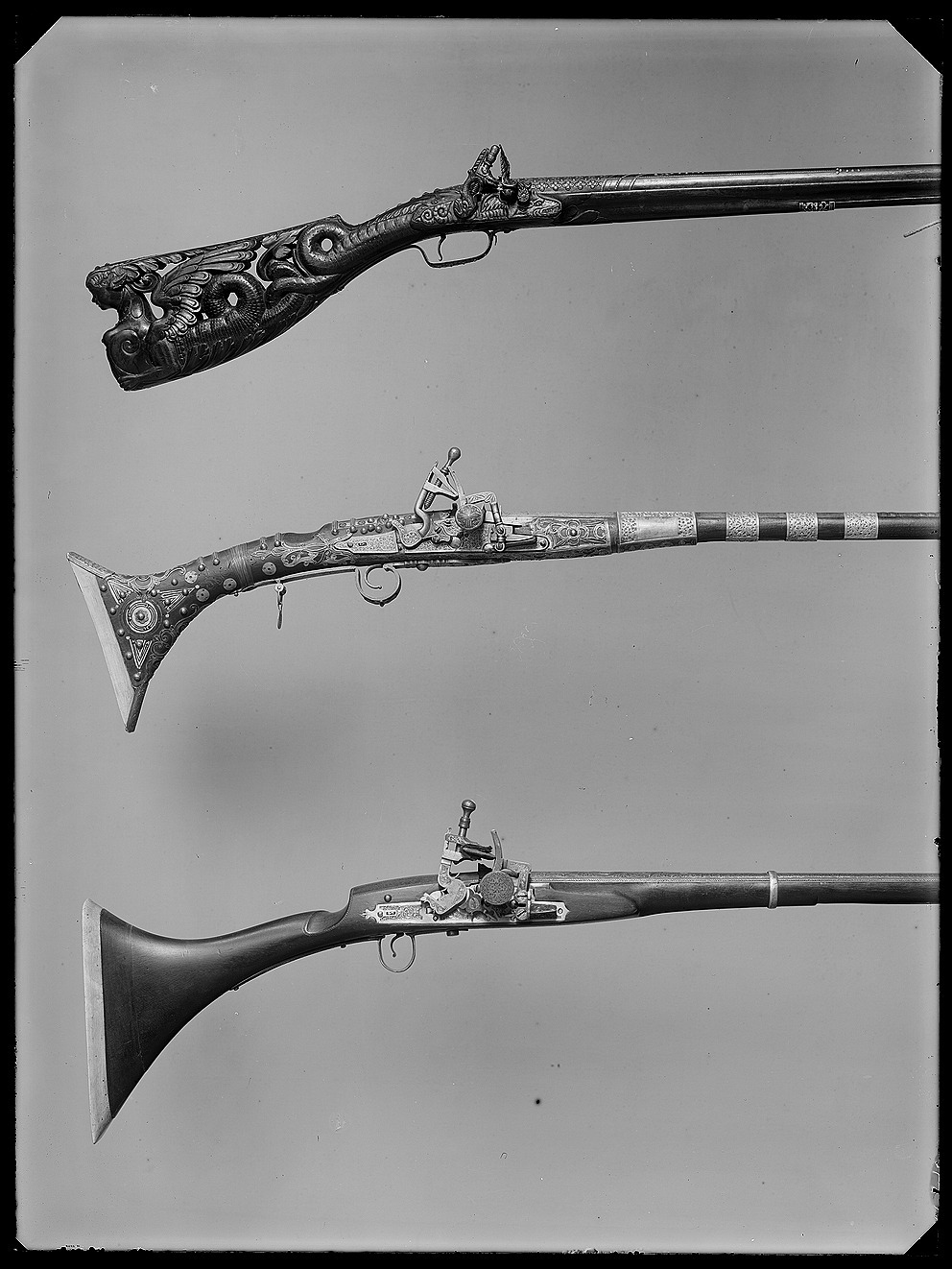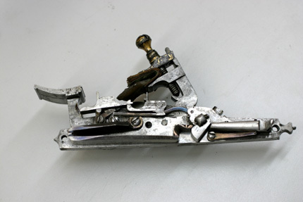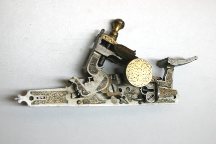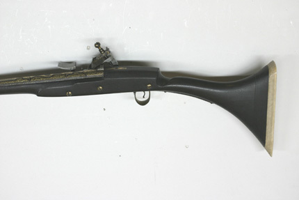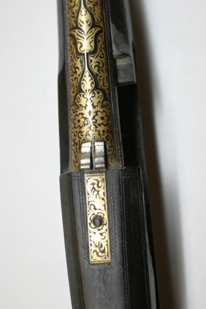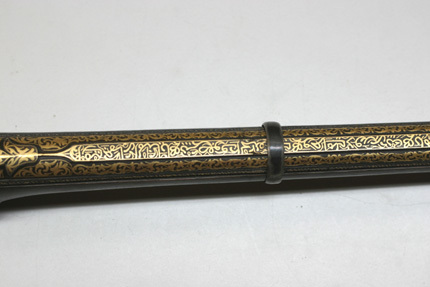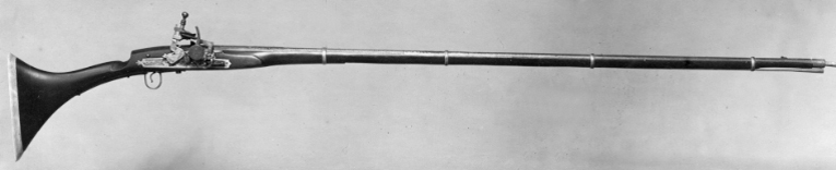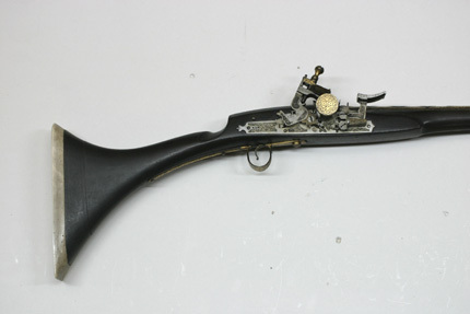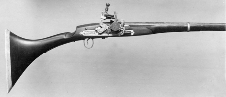 Rund, slätborrad pipa av stål med på kammarens ovansida blom- och bladliknande band i relief samt från denna fram till 75 mm från mynningen ribba på pipans ovansida. Pipans ovansida med yttäckande ornering av rankor och skrifttecken av påslaget guld. På kammaren en spetsoval stämpel inneslutande skrivtecken. Runt mynningen profilerat band. Riktmedel: Kulissikte och stolpkorn av stål. Fästning: Fyra pipband av silver med ornering av niello(?). Snapplås med plant låsbleck med på fyra ställen inlagda graverade silverplattor med rank-och volutdekor. Hanen och eldstålet med samma dekor. Lös överkäke och käkskruv med rankdekor av påslaget guld. Fängpanna med rund skärm med lika dekor som den på överkäken. Eldstålsfjädern och hanstödet belagda med graverade förgyllda plattor av silver, slagfjädern blånerad. Fästning: Tre stycken låsskruvar med dekor av förgyllda rankor. Mörkbrun helstock av trä med muskötliknande kolv. Bakplåt av ljust ben. Varbygel oval, med långa armar och yttäckande ornering av rankor av påslaget guld. Tillbehör Laddstock av stål vidgad framtill (fasttorkad) samt flinta tredubbel skinnbit.