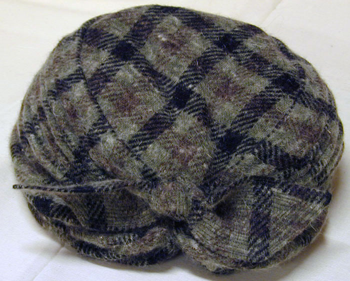 Hatt av angorajersey. Turbanmodell. Rutmönstrat tyg. Små gröna rutor varvade med ljusbruna, vilka alla begränsas av mörkbruna eller skrafferade mörkbruna och gröna rutor. De skrafferade ramar in de förstnämnda i kvadratiska fält. Kanterna veckade i småveck. Nederkanterna hänger ner vid öronen. Fram uppfästade vid en enkel rosett, samt bak uppfästade med ett stycke grovt garn på insidan. Kullen fodrad med ljusbrun siden med strukturtrådar, vilket sträcker sig ned till det mörkbruna ripsbandet. Etikett med tillverkarens namn: "MODELL // Rune Holmgren // STOCKHOLM".