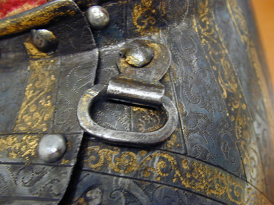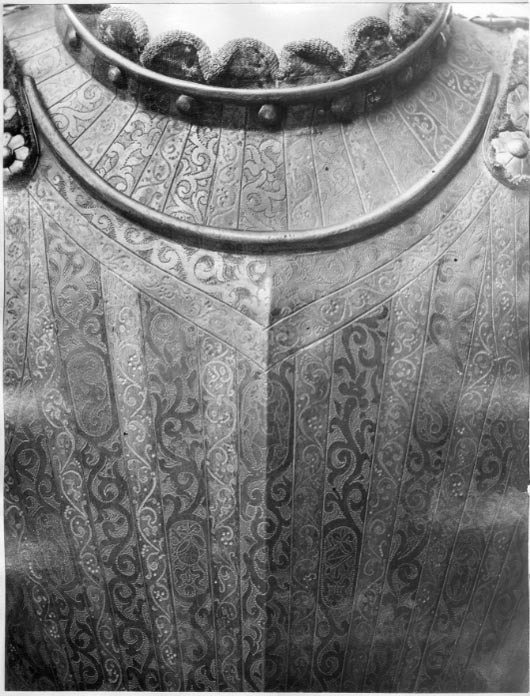bröstharnesk med 2:ne axelsleifer af läder, klädda med rödt sammet och fastsatta med rosettformiga nitar - för lårskenornas fästande finnas 2:ne sleifer med skrifvar och muttrar af jern,