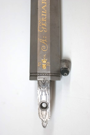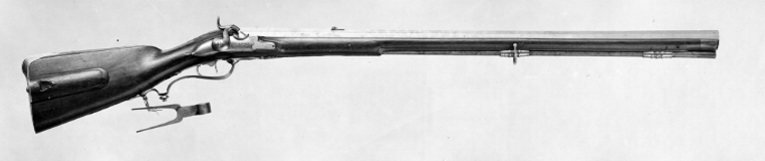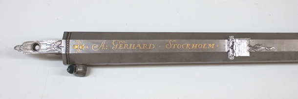Åttsidiga, damaskerad, räfflad pipa, banddamask, 8 breda, rundade räfflor. Vid pipbasen på de tre övre faserna en pärlstav i försänkt relief. På kammaren signering inlagd med guld: "A: GERHARD. STOCKHOLM.", därbakom inlagd ägarmärkning i guld, vapensköld med blad, krönt av öppen krona och på tre sidor omgiven av bokstäverna: "P S B". På h. sida rundad snäcka med tändhattsnippel, slagskydd av filt. Svansskruvblad med rundat ändblad, graverad bladdekor samt nr 34. Riktmedel: Klaffsikte av stål med bred skärm med graverad bladdekor på ovansidan, skålning på framsidans mitt samt liten siktskåra på mitten. Därframför två uppfällbara siktskivor, ca 3 och 5 mm höga. Rektangulär laxningsplatta med fasad framkant samt fint ciselerat löv. Stolpkorn av silver. Fästning: Tre häften. Pipan fäst med krysskruv ovanifrån, bakre låsskruven i hak i svansskruvplattan, två pipstift av stål samt däremellan främre rembygelns skruv. Flintlås ändrat till slaglås, slätt, välvt låsbleck med smal kantlist och graverad signering: ""A: GERHARD // STOCKHOLM". S-formigt svängd, slät hane. Inre delar fint arbetade, nöt med yttre springkil. Fästning: Två låsskruvar. C-formig avtryckare, avtryckarbleck medkonturerat ändblad baktill, fästskruv. Helstock av valnöt med kindstöd och kolvlåda, rak, svagt välvd kolvrygg. Fint skurna rankor vid kindstödets framände, svansskruvbladet, spetsrörkan och varbygelns båda ändar. Kovlådelock av stockens trä med djupt skuret musselformigt grepp baktill. Bakänden skodd med stål, två fästskruvar. Siktknapp av ben mitt på kindstödet. Näsband av horn, övriga beslag av stål. Kolvkappa med list över hälen samt kantlister, flik avslutad med dubbel palmett, två fästskruvar. På kolvryggen därframför en slät, konturerad platta med mässingsskott hål för diopter, två fästskruvar. S-formigt svängt sidbleck med fint profilerad N-formigt mittparti av tre blad. Två balusterformiga rörkor. Varbygel med list med profilerade kanter på bygeln, 8-formig främre arm avslutad framåt med urna och fint ciselerat löv, bakom stolpen avslutning i form av två runda knappar. Bakre stolpen kluven, bakre ramen fri och nedsvängd till kvadratisk platta med två rundade knappar på varandra, den inre mycket större. Bakom plattan insvängd till kolven och avslutad med 8-formigt slätt blad med rund ändplatta, framför bladet den bakre rembygeln. Tillbehör: Laddstock av ljusare trä, l: 867 mm, framtill skodd med horn, l: 35 mm, skålad ände. Baktill skodd med invändigt gängat mässingsrör, l: 165 mm.