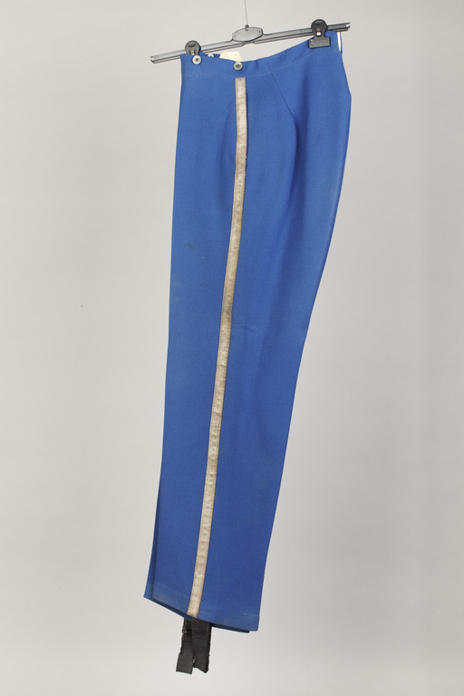 Blå långbyxor av yllediagonal med silvergalon, hällor nedtill. Gylf med sex blekgröna, plana plastknappar, med på ovansidan: "MILITÄR EKIPERINGS A.B." Upptillhake och hyska. Utmed byxornas ovansida fyra knappar och vid byxsprundet två knapparinvändigt,som föregående. Två sidsömsfickor, en stolpficka bak, till höger. Foder av vit yllekypert. Framtill slejf som knäpps i gylfen, med vit sidenetikett medkungligt vapen: "Militär Ekiperings a.B // Kungl. Hofleverantör // MEA// Stockholm,den 5:5 1925 // Herr H.K.H. // Prins Gustaf - Adolf". Baktill en upphängningsögla. Nedtill på byxbenen invändigt i var byxben två platta svarta plastknappar påovansidan "MILITÄR EKIPERINGS A.B".