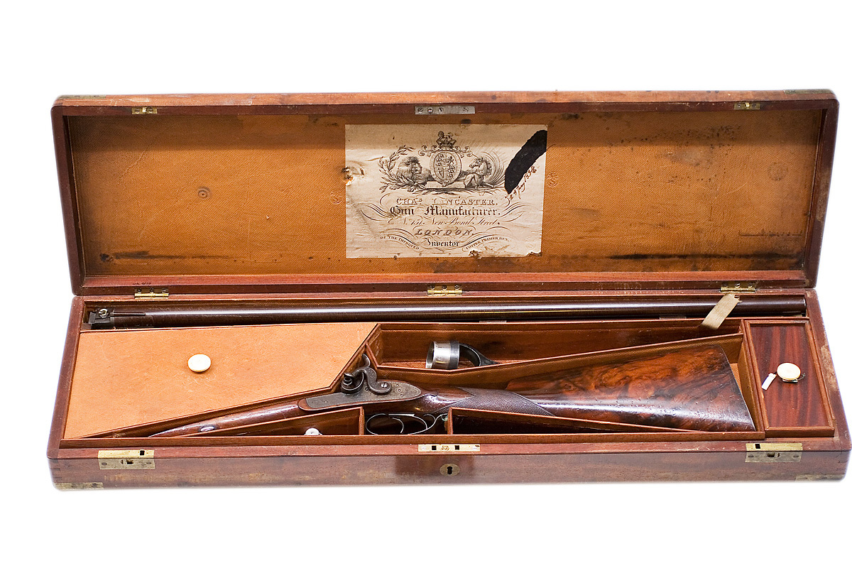 Signatur/Påskrift: CHA.S LANCASTER // Gun Manufacturer // N:o 151, New Bond Street // LONDON // Inventor // OF THE IMPROVED COPPER PRIMER GUN