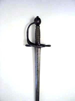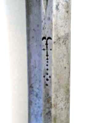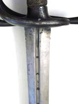 Modellenlig. Fäste av blånerat stål med sliten blånering, på inre parerplåtens ovansida punsat N. 14. Kavellindning och kransar av mässingstråd av två olika tjocklek. Tvåeggad klinga med framåt avsmalnande plana åsar, på starka delen en 180 mm lång blodrand med inslagna otydliga bokstäver, bl a N, framför blodranden punsad, korsformig dekor. Vid klingbasen på båda sidor delvis synliga proberstämplar.