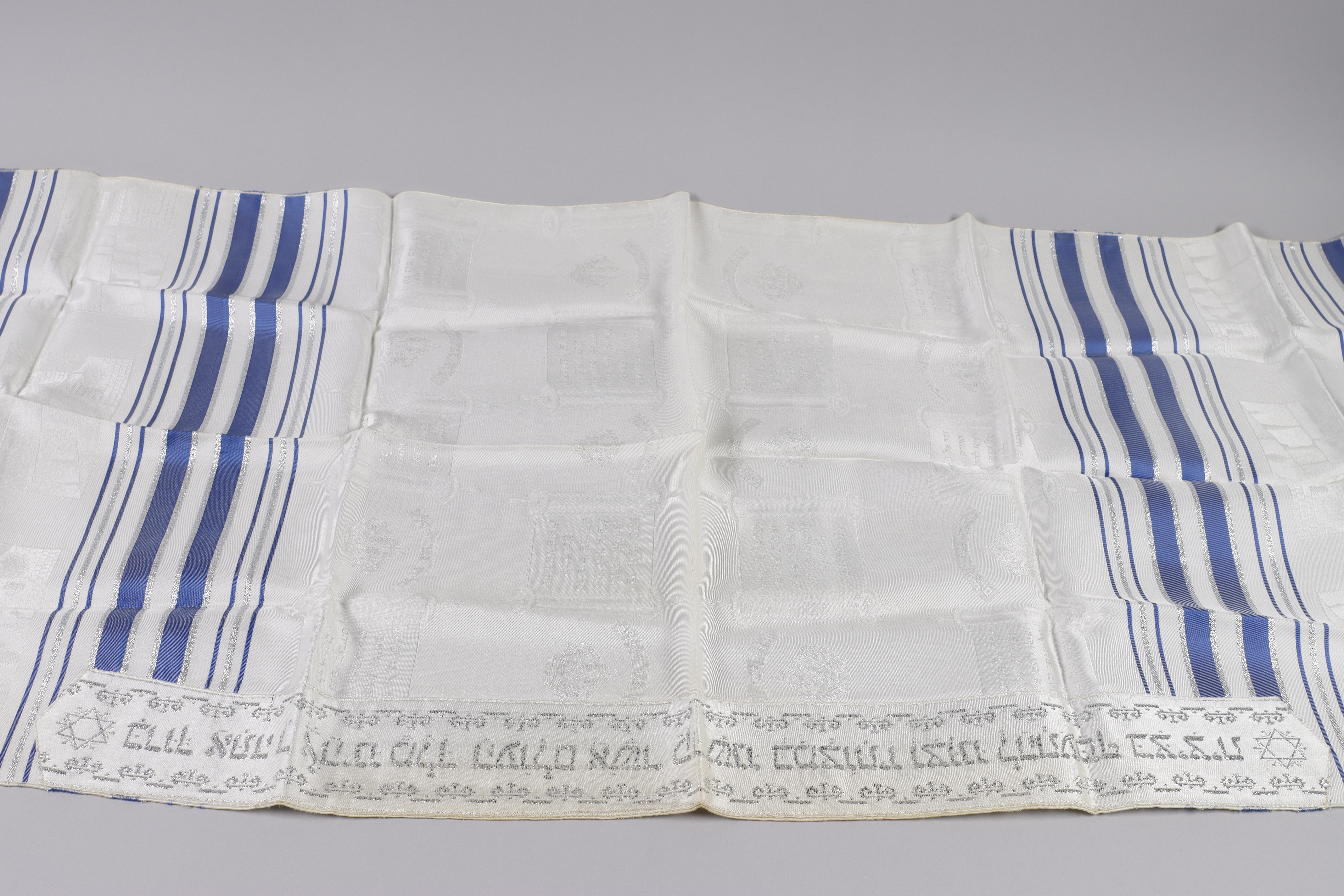 En vit sjal med blå stora ränder i varje ända av sjalen. Sjalen har långa knutna snören.