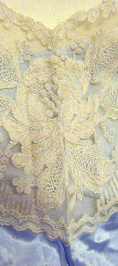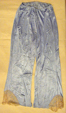 Pyjamasbyxa av ljusblå charmeuse. Resår i linningen. Benen utställda nedtill. På utsidan avbenen, längst ned maskinknypplad tyllspets. Motiv av blommor, rankor och blad.