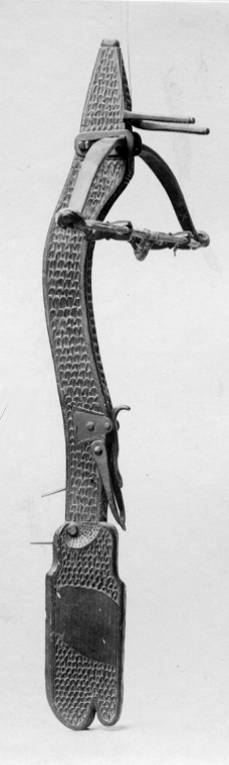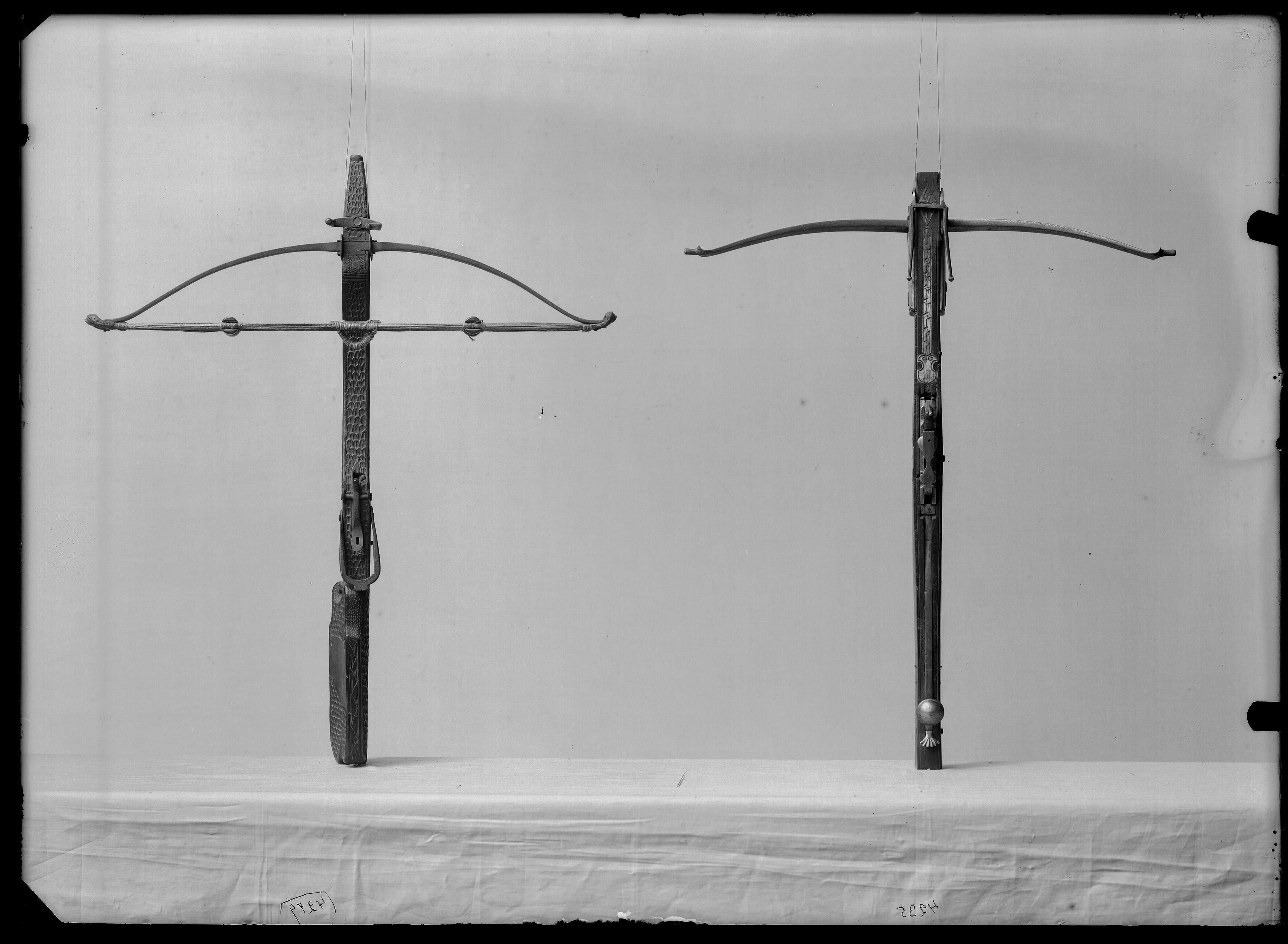 Smal båge av svärtat stål, fäst vid stocken med stålbeslag. Dubbel sträng troligen av hampa utspänd av två svarvade pinnar av mörkt trä med urtag för strängen. På mitten ögla och en stålten för kastkroppen. Strängens ändar läderklädda. Lås med nöt av stål. Stock av brunt trä, skuren i fjällmönster, nedböjd i en båge mellan bågen och låset. Kolv med liten vinge och snidad volut intill. Vid låset fällbart sikte, stålbåge med siktskåra.Framtill stålgaffel för korn. I framändan ny ögla iskruvad för upphängning.