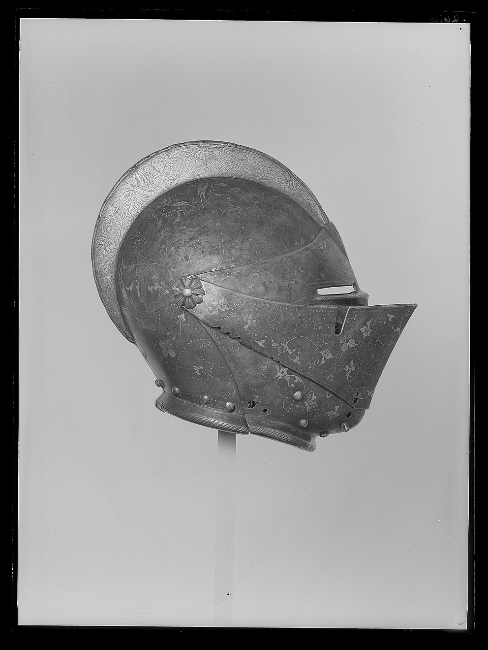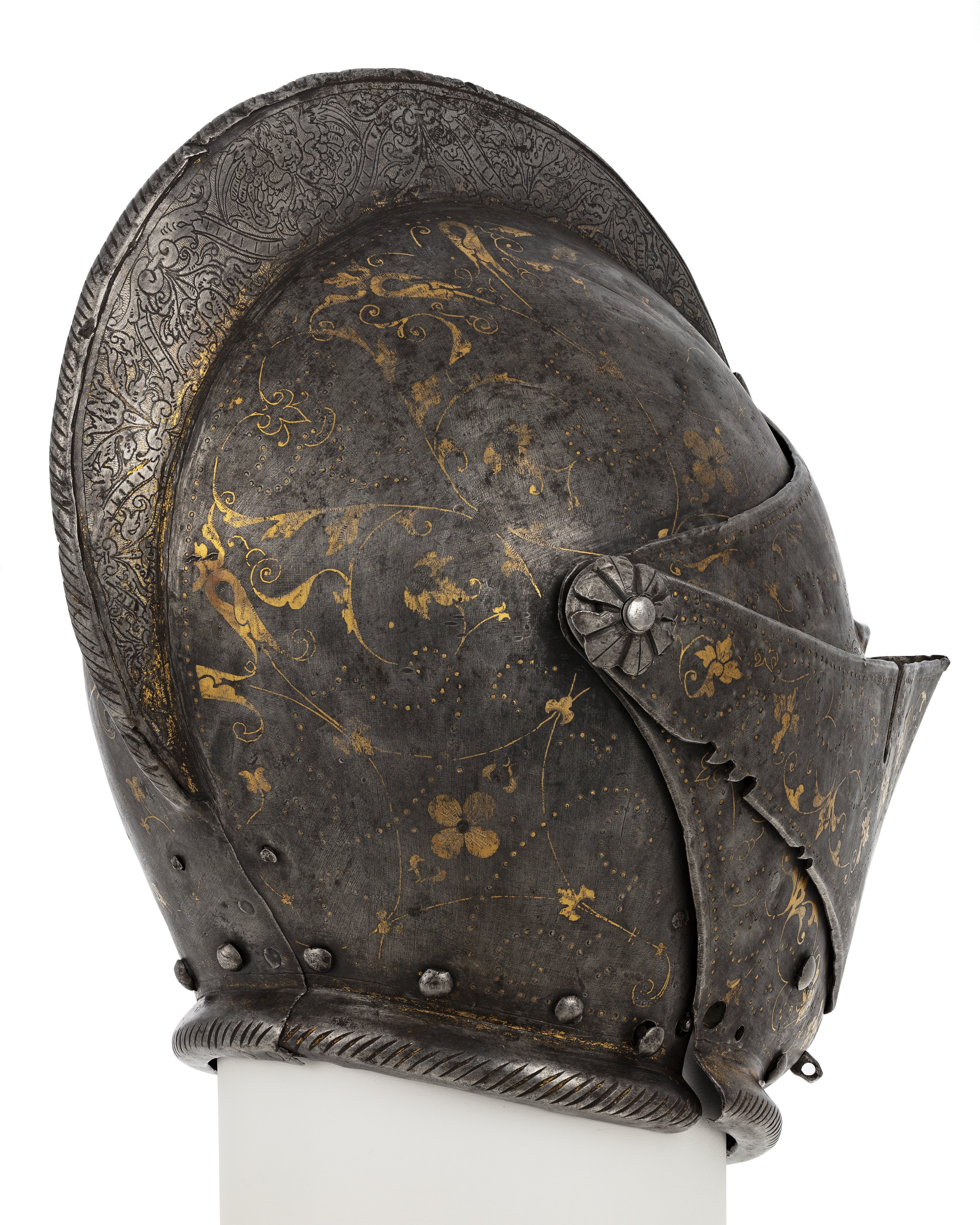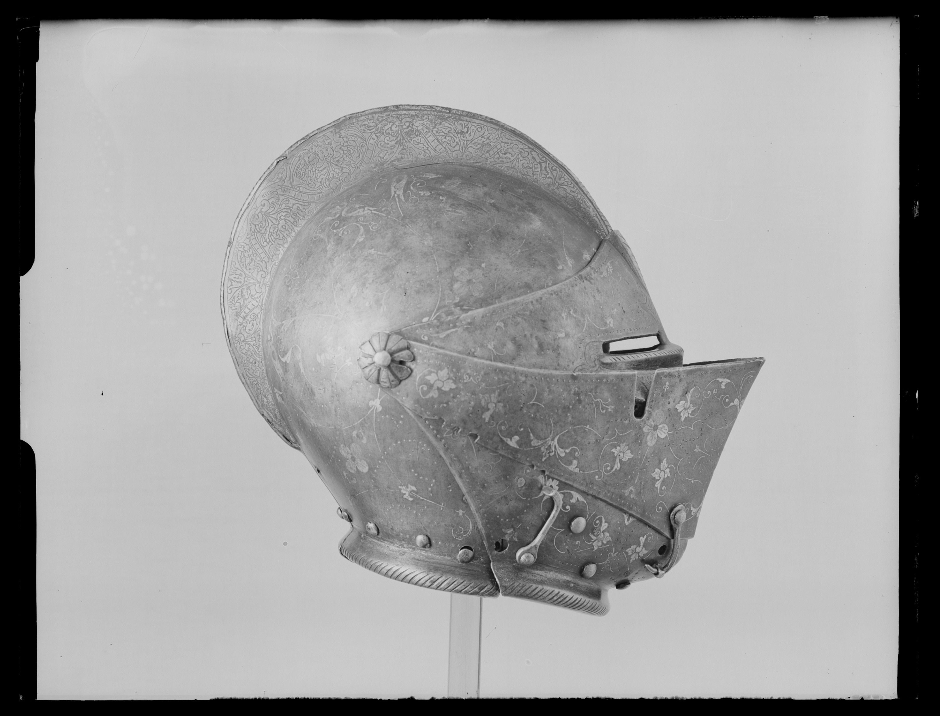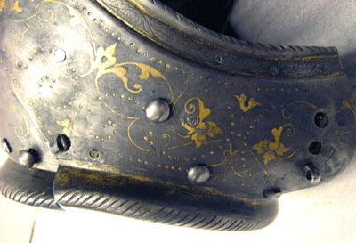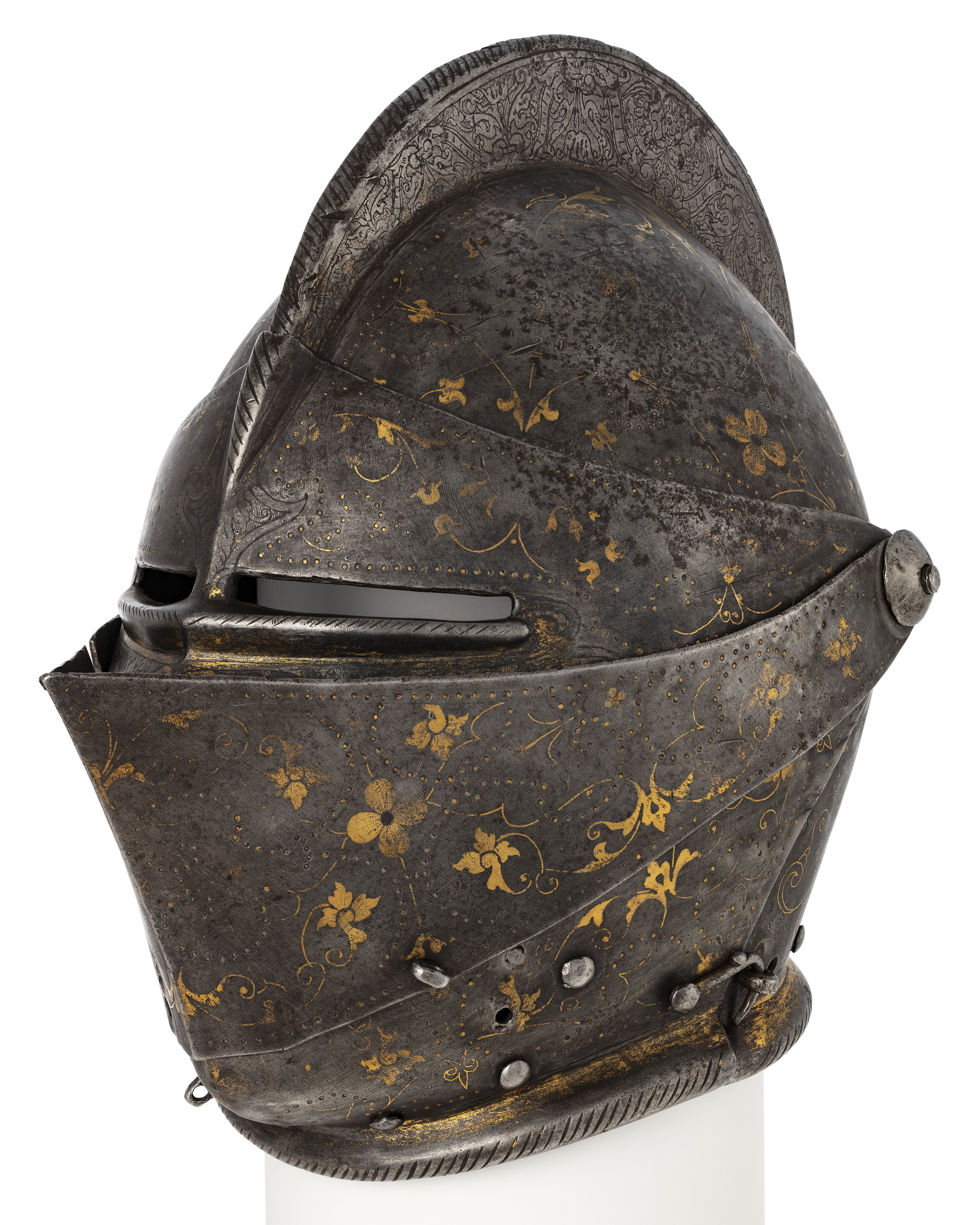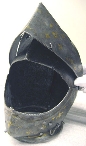 Driven stålplåt av sammanlagt fyra delar. Klocka av två halvor, sammansmidda längs mitten. Rundad form, baktill något utdragen uppåt och mjukt övergående i kam, h 45 mm, b upptill 12 mm. Kammen löper till klockans främre kant, baktill slutar den 60 mm upp. Klockan nedre kant formad till rundad skena, att passa över harneskkragen. Plymhållaren saknas men två nitar finns kvar där den suttit. Kammens ovansida endast svagt rundad, med dekor av filade snedställda linjer. Sidorna har heltäckande etsat mönster av rankverk. I klockans nedre högra hörn en fjäderbelastad tapp med trycknit. Pannklaff med i mitten driven ås för kammen. Högt mittparti med avsmalnande utdragna sidor. Två synspringor, 70 x 75 mm, rektangulära och åtskiljda i mitten. Under springorna inåt vinklad kant lätt driven utåt bildandes skyddande klack, framtill hopgående i tämligen kort spets över näsan. Klacken med filade linjer. Frampartiet utdraget till spets med nedre kanten svagt vinklad inåt. Mittås från kammens slut till främre delens spets. Visir med raka och släta kanter. Bredast över mittpartiet, med vertikal mittås. Sidorna bakåt avsmalnande och svagt sluttande inåt. På vänster sida nertill en ögla, för hakstyckets hasp. På höger sida urtagning i övre kant för pannklaffens stång (saknas). I nedre kant tre utfilade 5 mm djupa spår, framför dessa ytterligare två. Hakstycke drivet ur ett stycke. Lätt konvexa och rundade sidor, framtill hopgående över hakan i en något uppåtriktad spets. Hakpartiet lätt spetsigt med vertikal skarp mittås. På höger sida en fjäderbelastad tapp (tryckniten saknas). På vänster sida en hasp, att fästa i klockan. Nedre kanten formad som rund skena. Alla visirets delar fäster i klockan med genomgående gängad bult och platta. På vänster sida är plattan rund och slät, på höger sida rund och formad som en åttbladig blomma, diam 32 mm. Dekor: Blånerad yta med skrafferade partier med påslaget guld och silver i form av slingrande rankor och blommor. Över och genom detta mönster löper slingor av punsade och guldfyllda prickar. Längs kanterna en bård med etsad och förgylld dekor av bladverk.