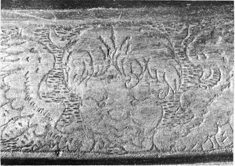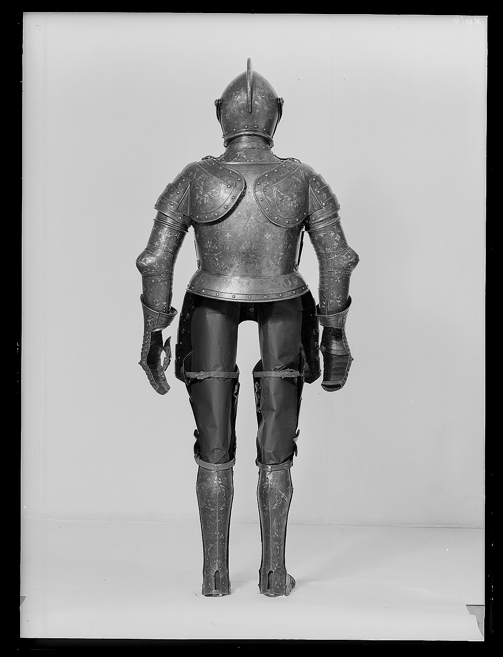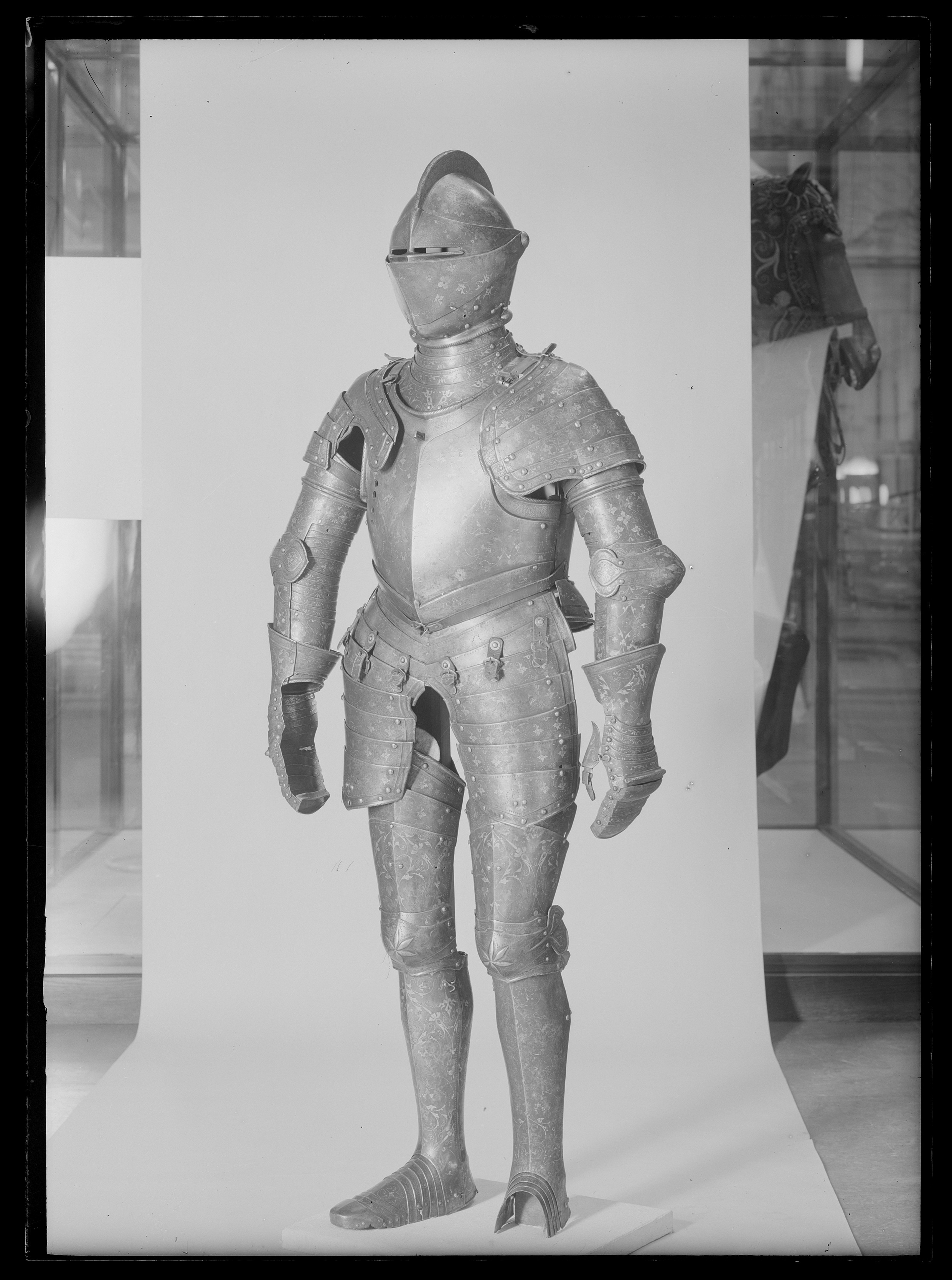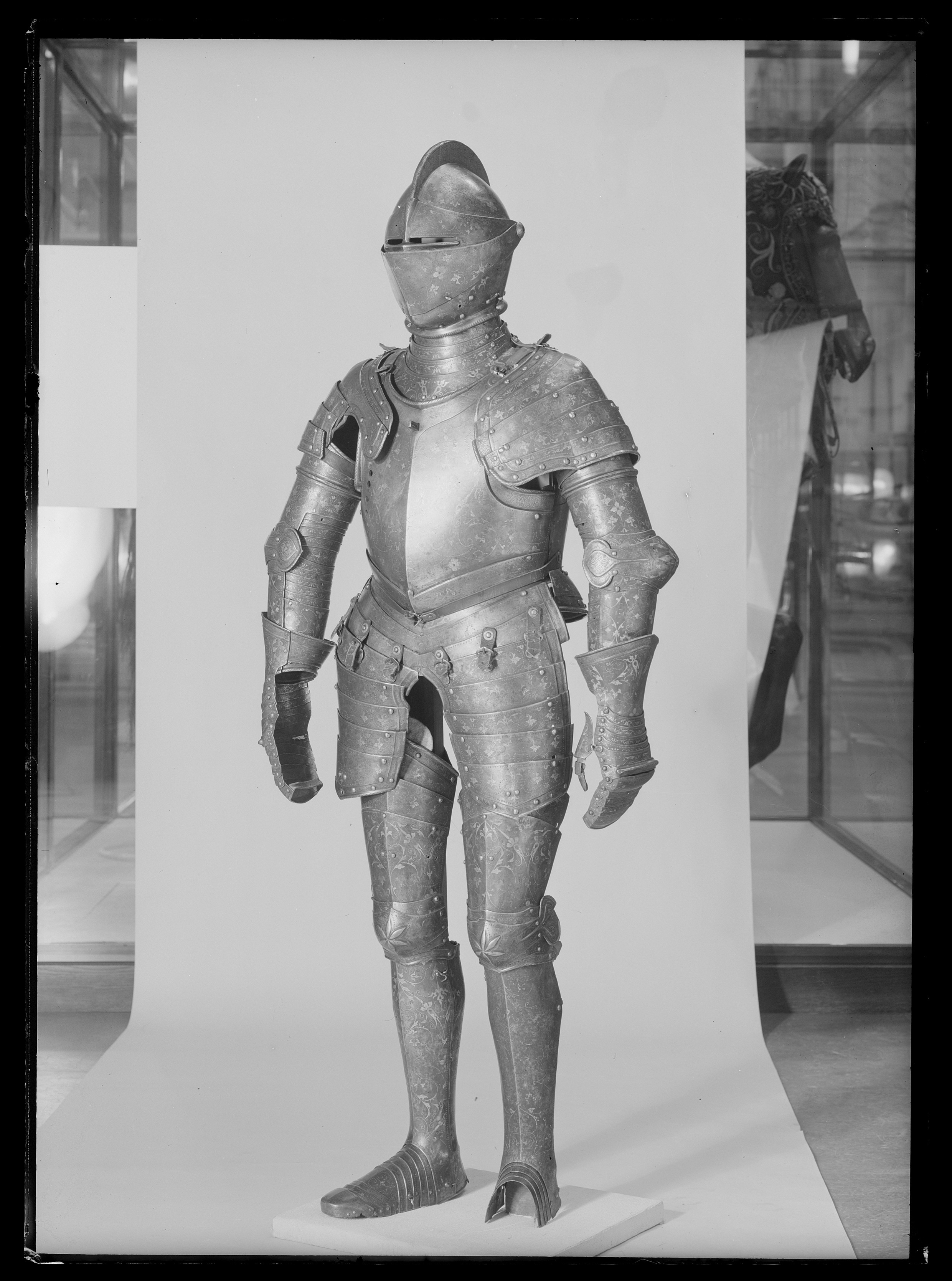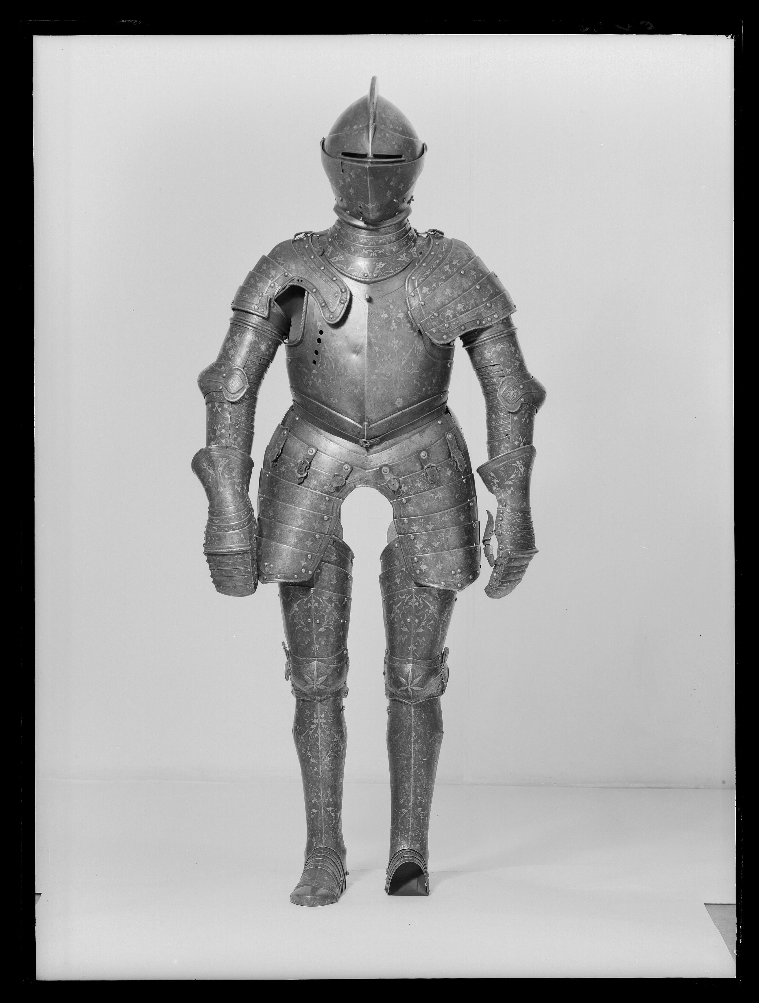 Driven stålplåt av sammanlagt fyra delar. Klocka av två halvor, sammansmidda längs mitten. Rundad form, baktill något utdragen uppåt och mjukt övergående i kam, h 45 mm, b upptill 12 mm. Kammen löper till klockans främre kant, baktill slutar den 60 mm upp. Klockan nedre kant formad till rundad skena, att passa över harneskkragen. Plymhållaren saknas men två nitar finns kvar där den suttit. Kammens ovansida endast svagt rundad, med dekor av filade snedställda linjer. Sidorna har heltäckande etsat mönster av rankverk. I klockans nedre högra hörn en fjäderbelastad tapp med trycknit. Pannklaff med i mitten driven ås för kammen. Högt mittparti med avsmalnande utdragna sidor. Två synspringor, 70 x 75 mm, rektangulära och åtskiljda i mitten. Under springorna inåt vinklad kant lätt driven utåt bildandes skyddande klack, framtill hopgående i tämligen kort spets över näsan. Klacken med filade linjer. Frampartiet utdraget till spets med nedre kanten svagt vinklad inåt. Mittås från kammens slut till främre delens spets. Visir med raka och släta kanter. Bredast över mittpartiet, med vertikal mittås. Sidorna bakåt avsmalnande och svagt sluttande inåt. På vänster sida nertill en ögla, för hakstyckets hasp. På höger sida urtagning i övre kant för pannklaffens stång (saknas). I nedre kant tre utfilade 5 mm djupa spår, framför dessa ytterligare två. Hakstycke drivet ur ett stycke. Lätt konvexa och rundade sidor, framtill hopgående över hakan i en något uppåtriktad spets. Hakpartiet lätt spetsigt med vertikal skarp mittås. På höger sida en fjäderbelastad tapp (tryckniten saknas). På vänster sida en hasp, att fästa i klockan. Nedre kanten formad som rund skena. Alla visirets delar fäster i klockan med genomgående gängad bult och platta. På vänster sida är plattan rund och slät, på höger sida rund och formad som en åttbladig blomma, diam 32 mm. Dekor: Blånerad yta med skrafferade partier med påslaget guld och silver i form av slingrande rankor och blommor. Över och genom detta mönster löper slingor av punsade och guldfyllda prickar. Längs kanterna en bård med etsad och förgylld dekor av bladverk.