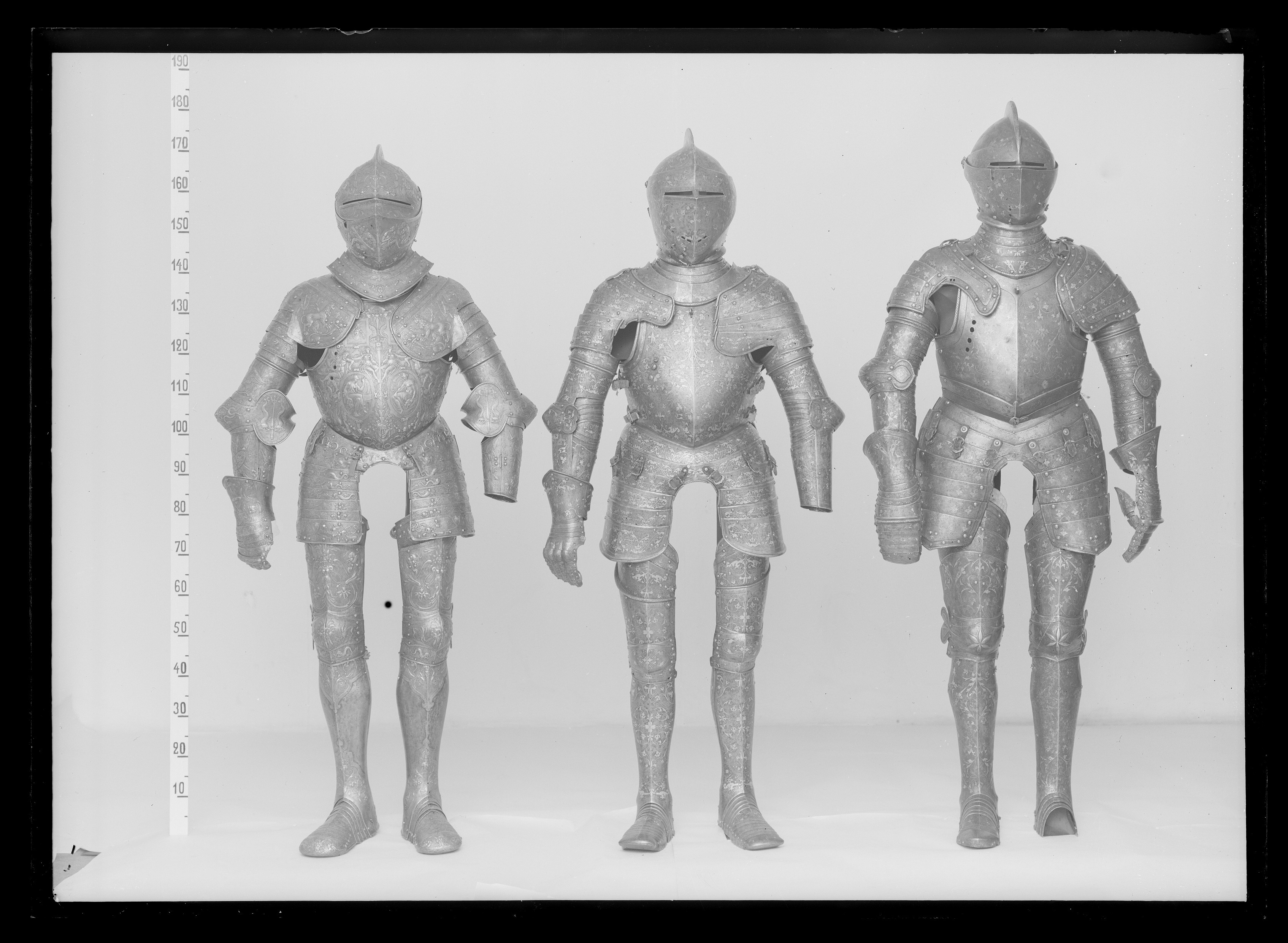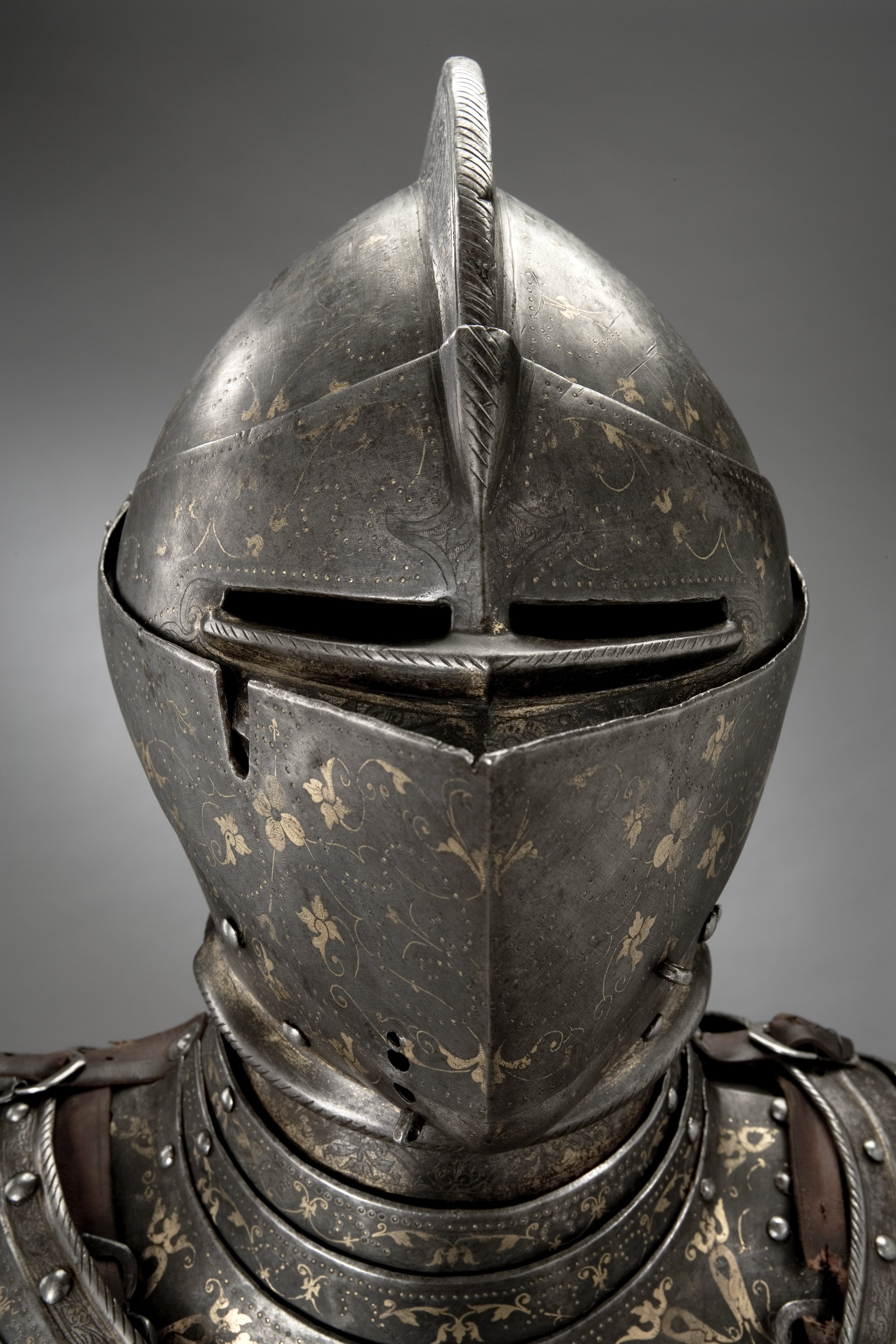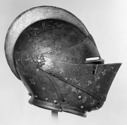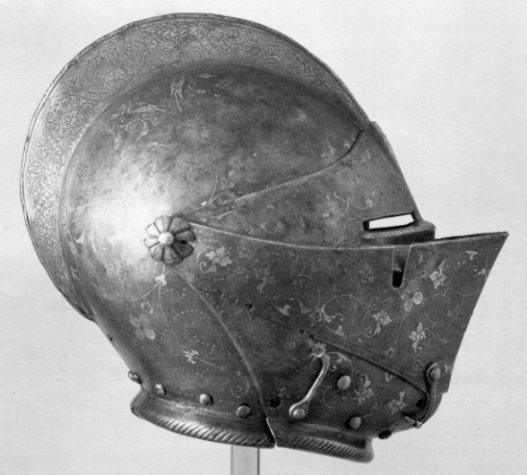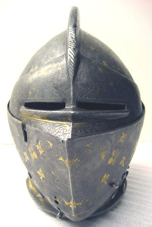 Sluten hjälm till helrustning. Tillverkad i Arboga åt Erik XIV som en gåva till Eriks halvbror hertig Magnus år 1564.