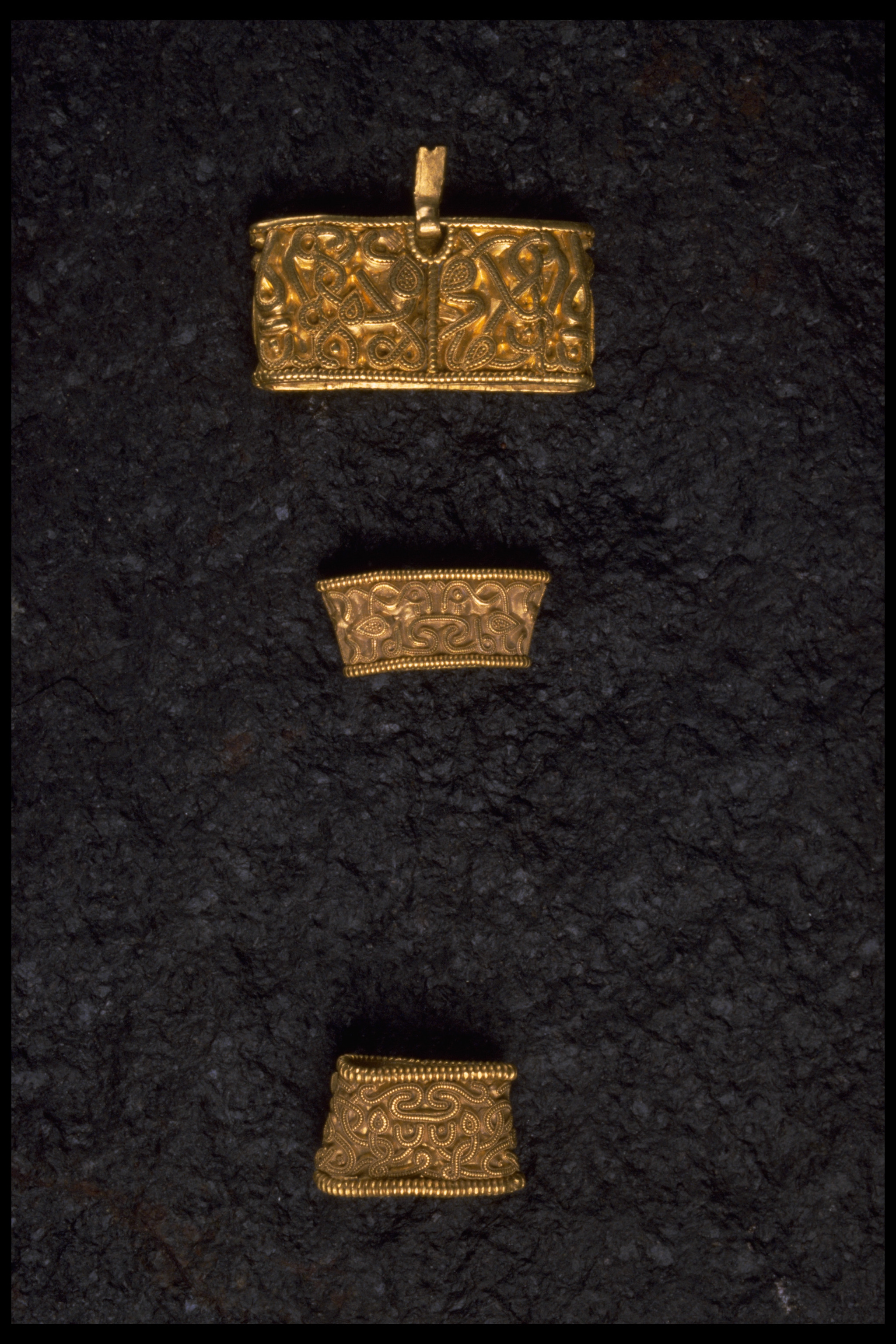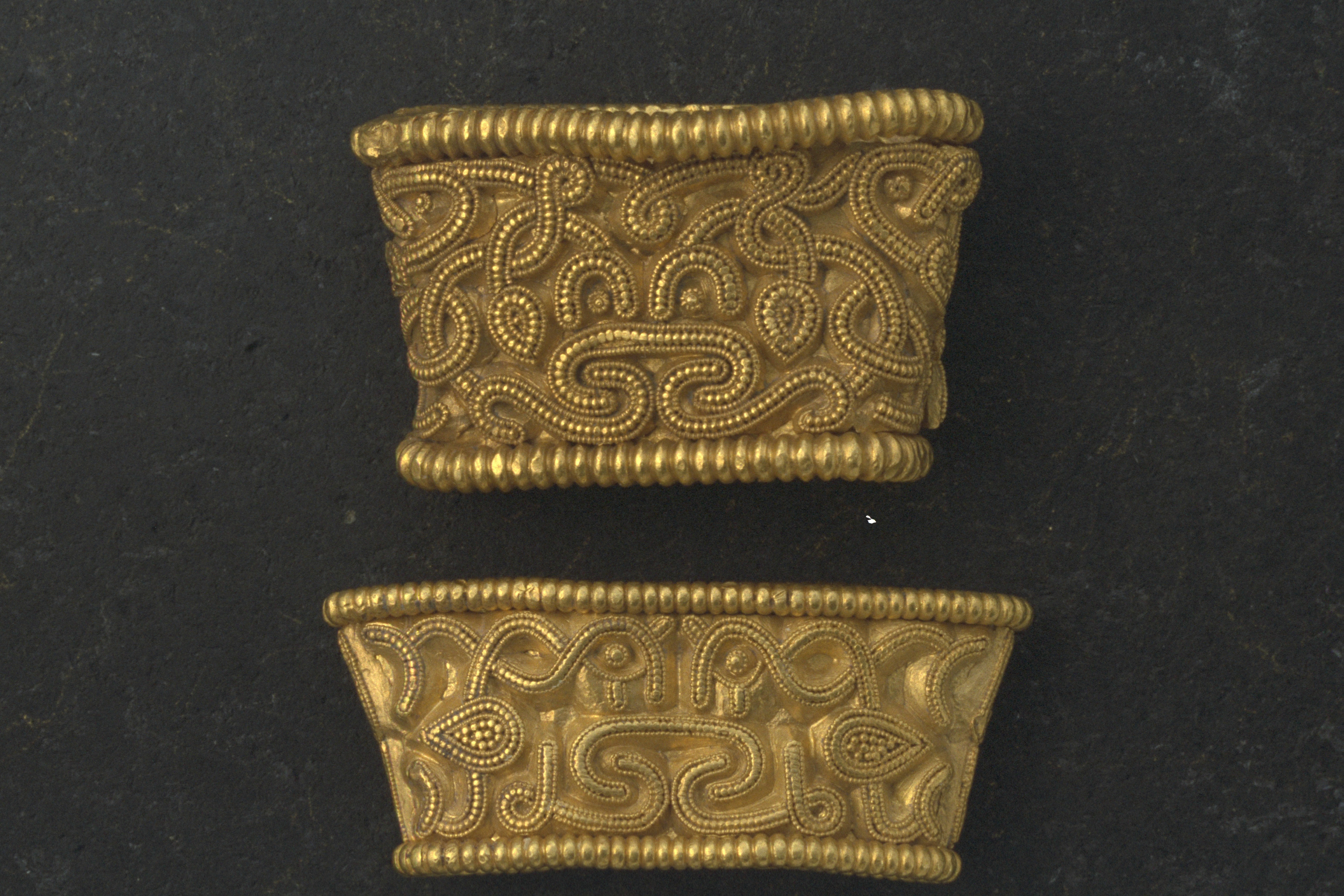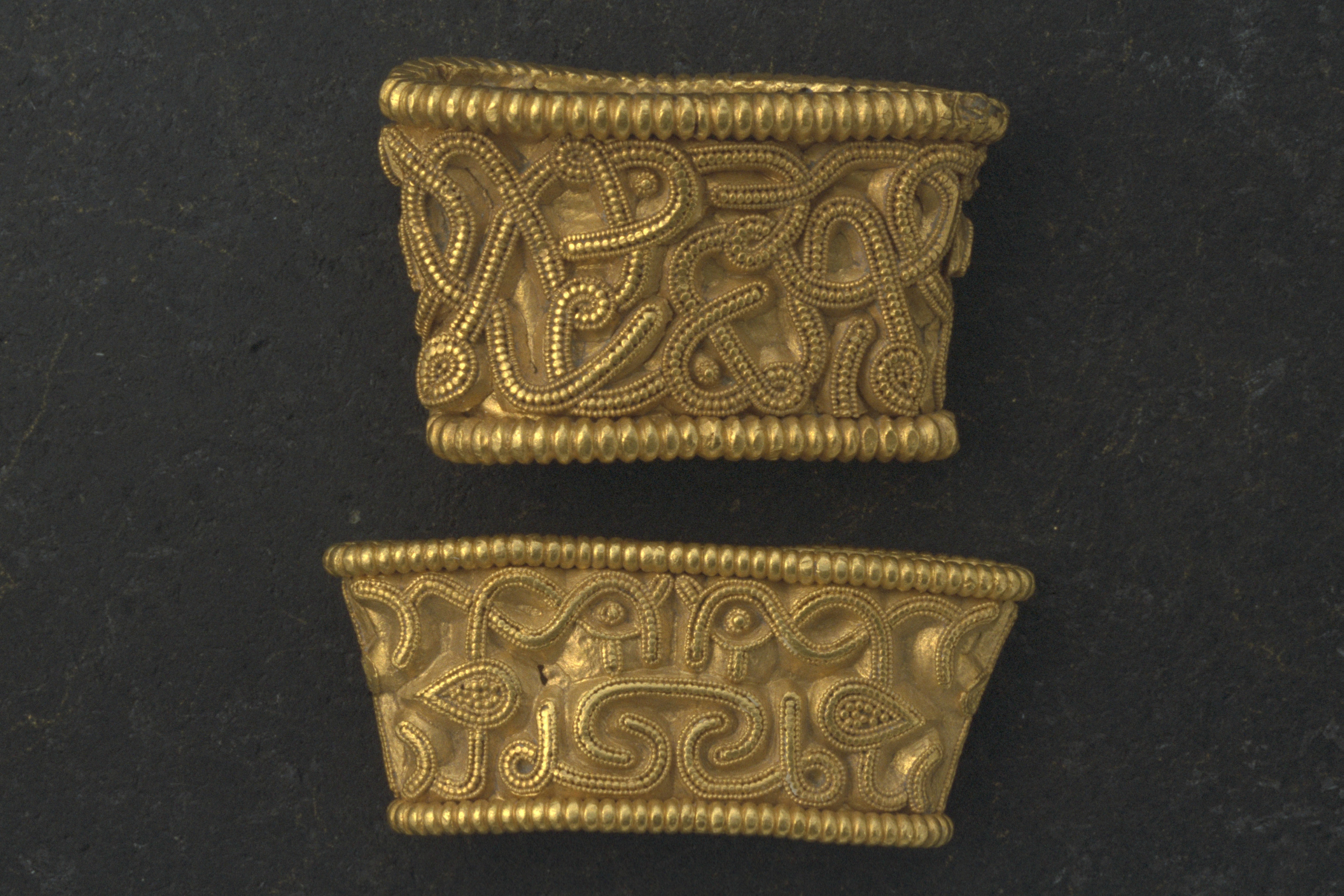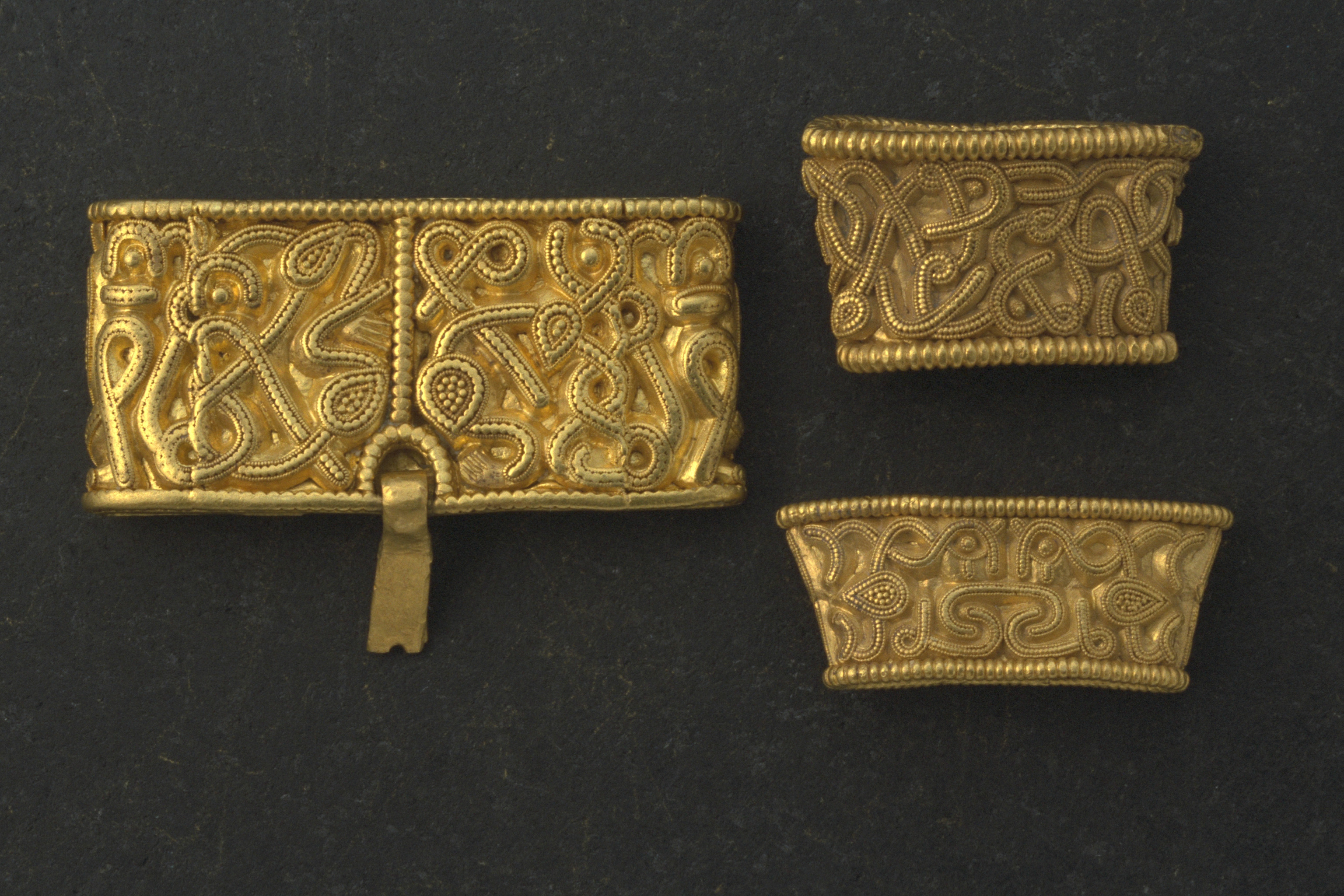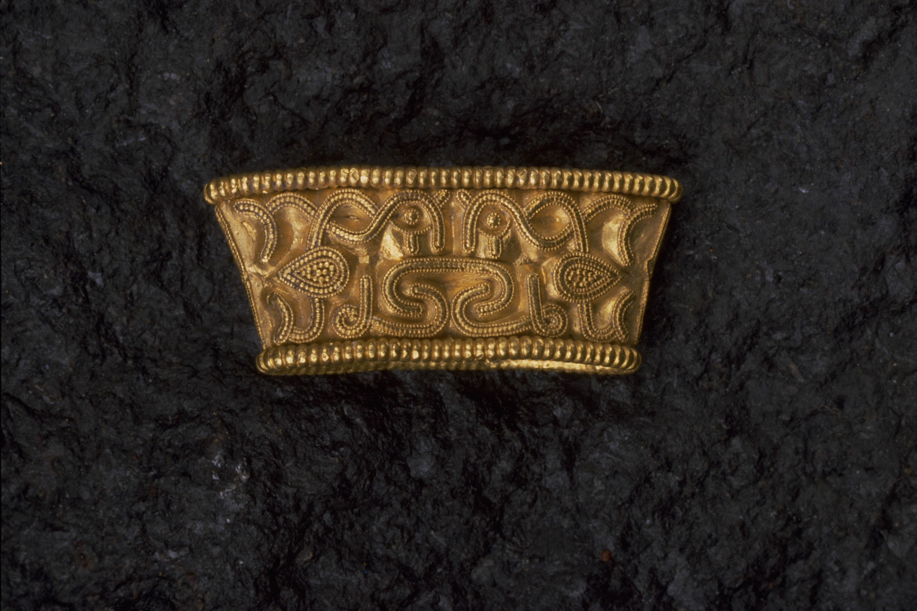 Svärdsslidebeslag av guld med filigransarbete.