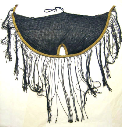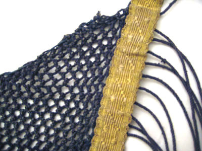 Hästbeklädnad enligt gula liggaren av ungersk ursprung. Täcket är flätad/knuten av blått silke och har utformning som ett nät och har ett hål för hästens svans. Beklädnaden är garnerad med guldgaloner samt fransar (510 mm långa) och alla fransar är skodda med mässingbleck. Täcket spänns ihop med läderrem och spänne.