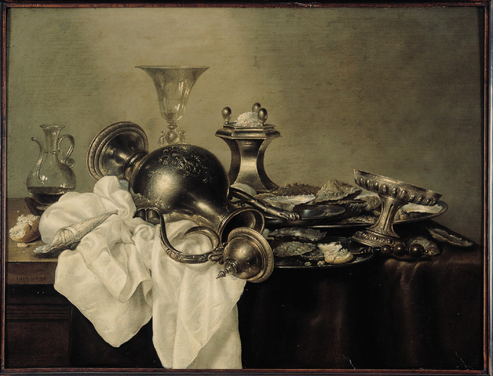 STILLEBEN. Måltidsstycke. Willem Claesz Heda (1593/94-1680/82) levde och dog i Haarlem som var centrum för 1600-talets holländska landskaps- och stillebenmåleri. Kompositioner med uppställda kärl och glas med mat eller matrester kallades vid denna tid för frukost- eller bankettmotiv. Den holländska termen stilleven, som betyder orörligt liv, blev vanligare först i slutet av 1600-talet. Hedas två stilleben i Hallwylska museet är från 1640-talet och de visar också konstnärens förmåga att återge olika material, spegeleffekter och reflektioner. Heda kallades också för ljuset och reflektionernas mästare.