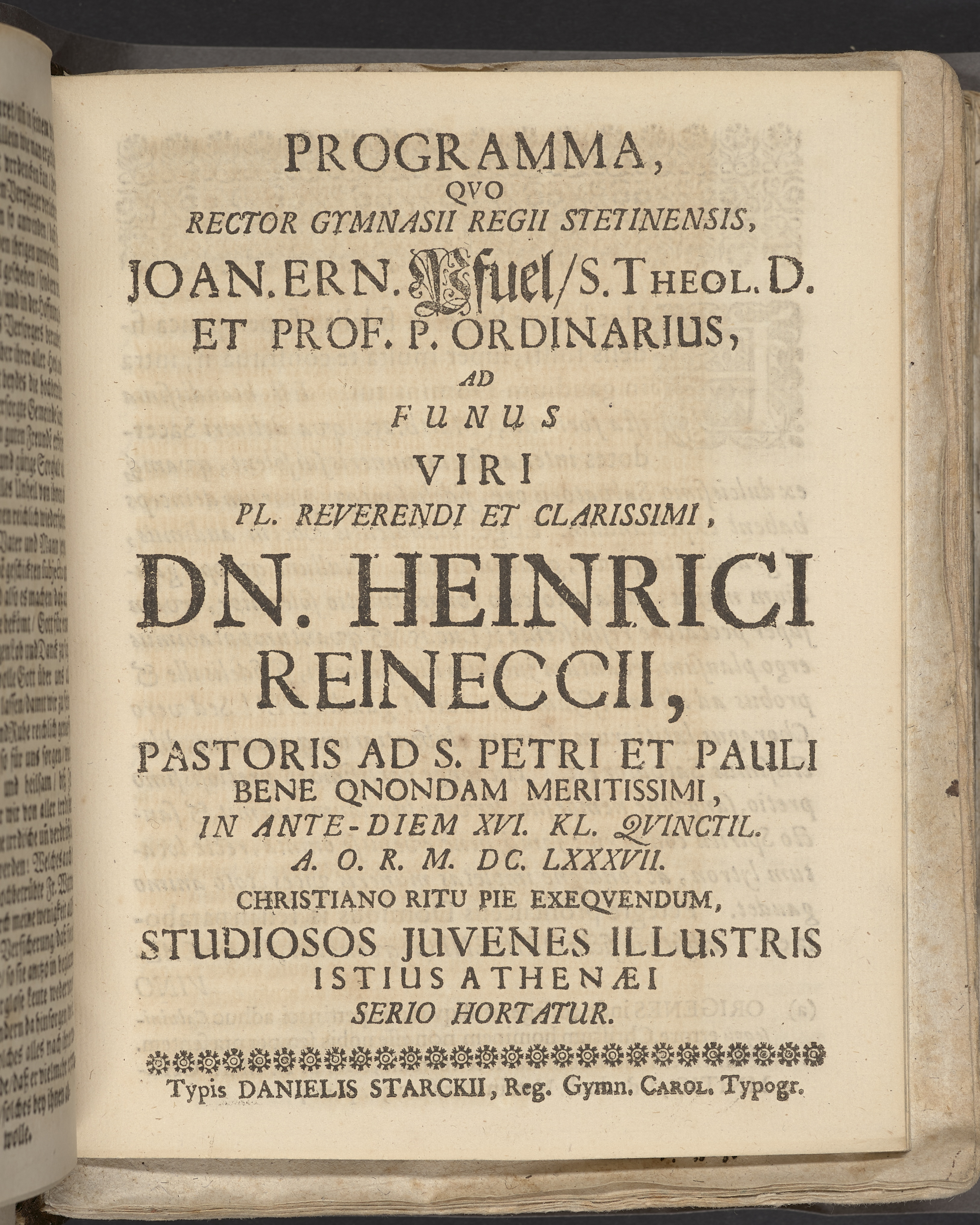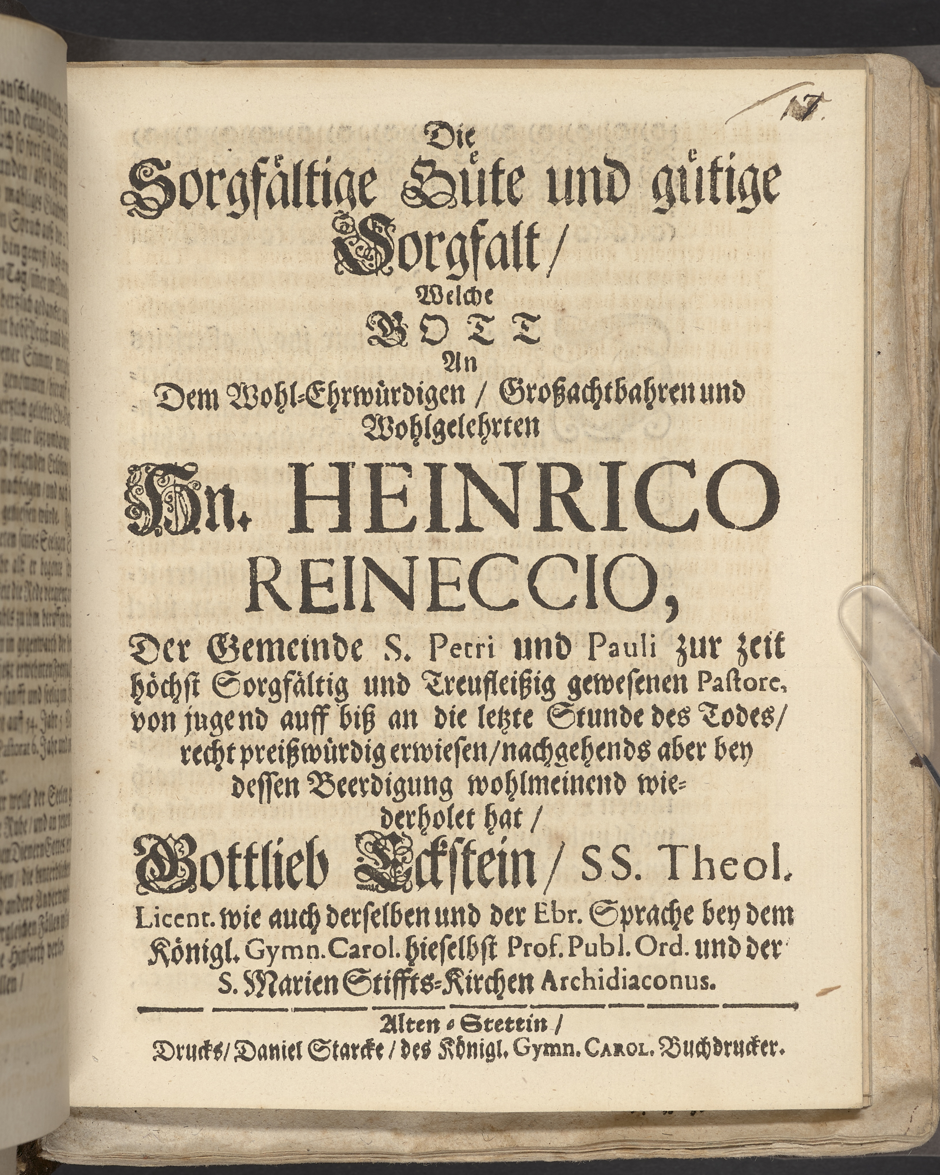 Die sorgfältige Güte und gütige Sorgfalt, welche Gott an dem ... Hn. Heinrico Reineccio, der Gemeinde St. Petri und Pauli ... pastore ... bey dessen Beerdigung ... wiederholet hat, Gottlieb Eckstein ... Alten-Stettin, druckts Daniel Starcke.